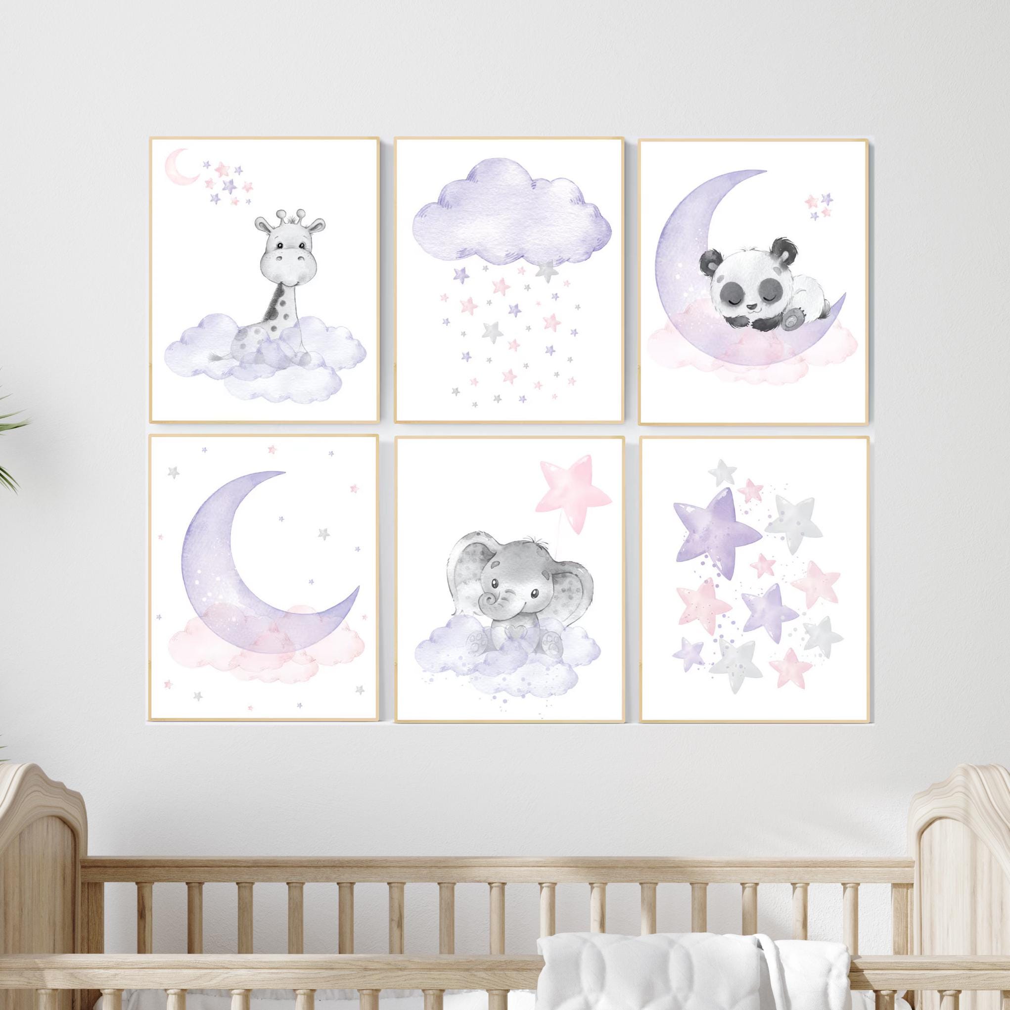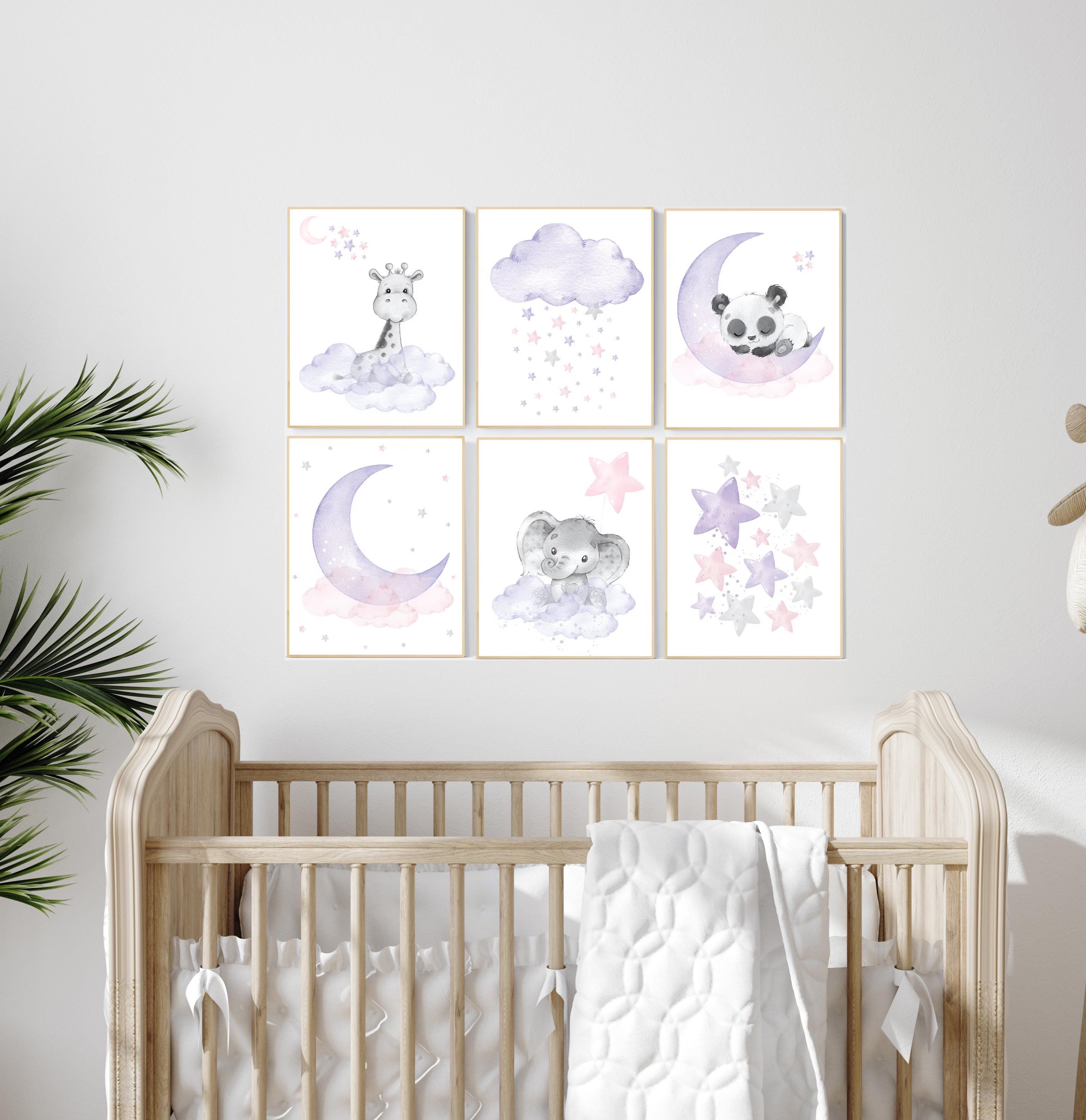 Nursery decor floral jungle, nursery decor animals, Nursery wall art girl elephant, giraffe, bear, pink, purple, girl nursery wall decor