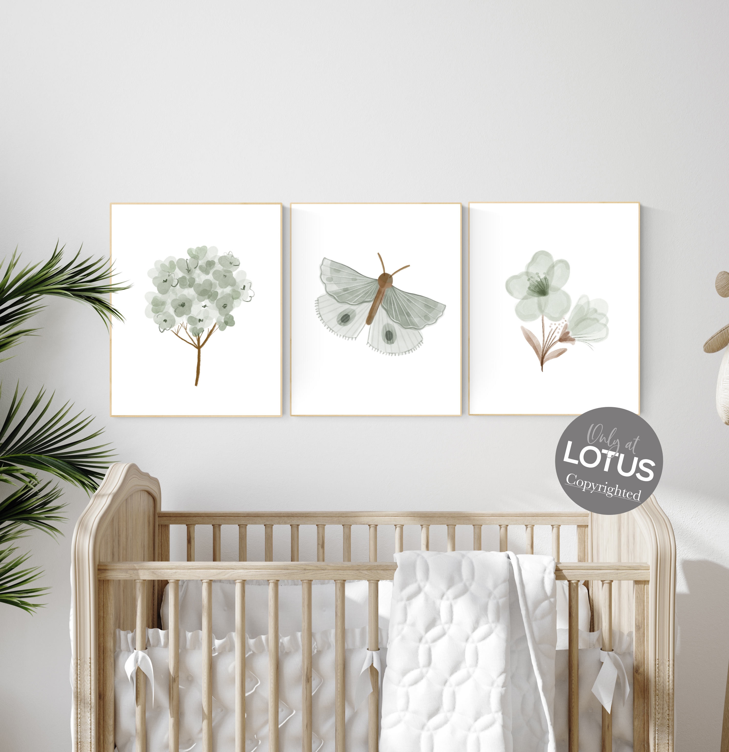 This wall art set features delicate butterflies and floral elements in calming green and neutral colors, designed to create a peaceful and stylish nursery atmosphere.