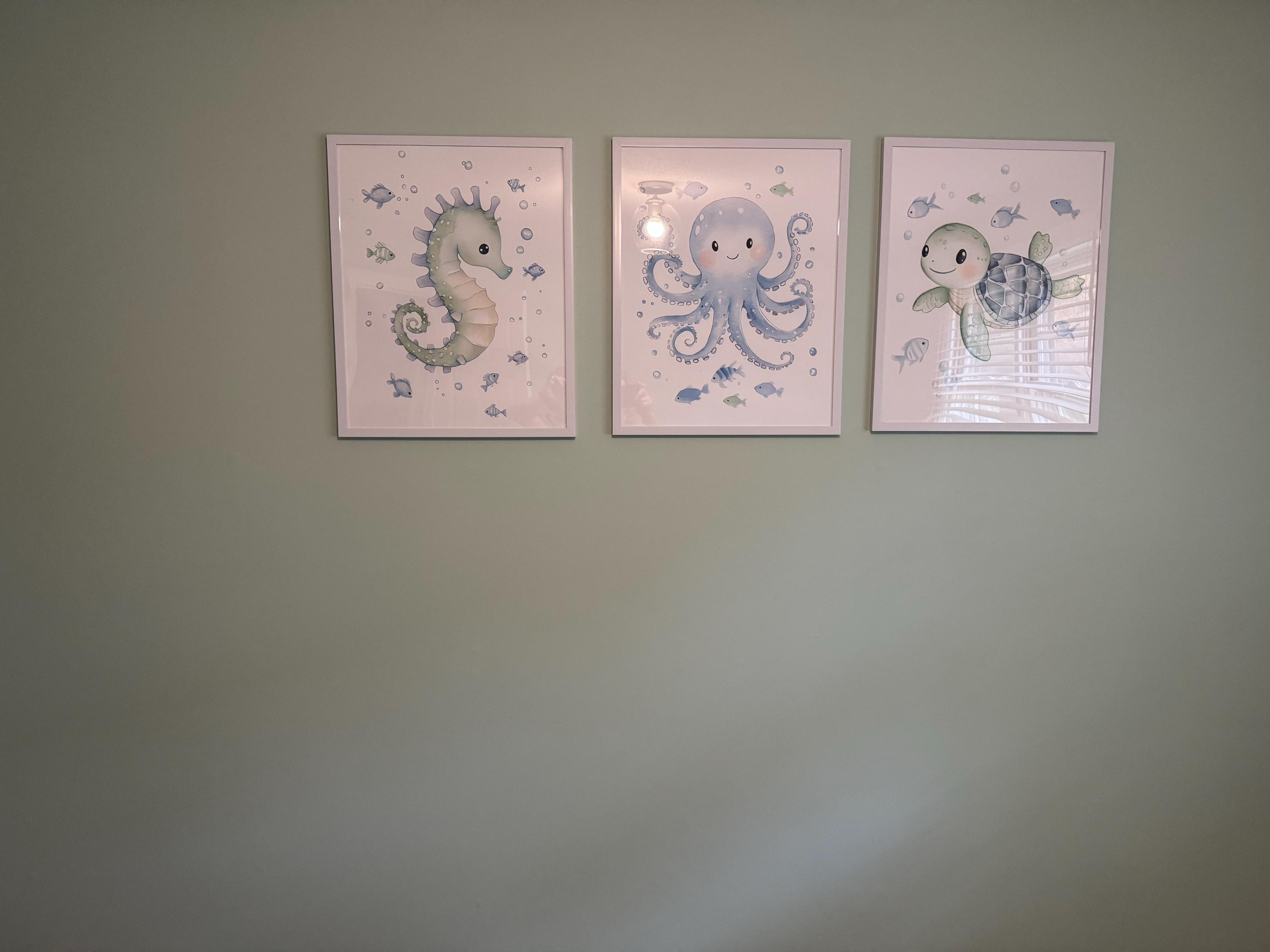 This adorable under-the-sea nursery wall art set features a sweet seahorse, smiling octopus, and playful turtle surrounded by fish and bubbles. Designed in soft watercolor tones of blue and green, it’s perfect for ocean-themed baby rooms, coastal nurseries, or sea animal lovers. A calming, whimsical decor set for baby boys or gender-neutral nurseries.