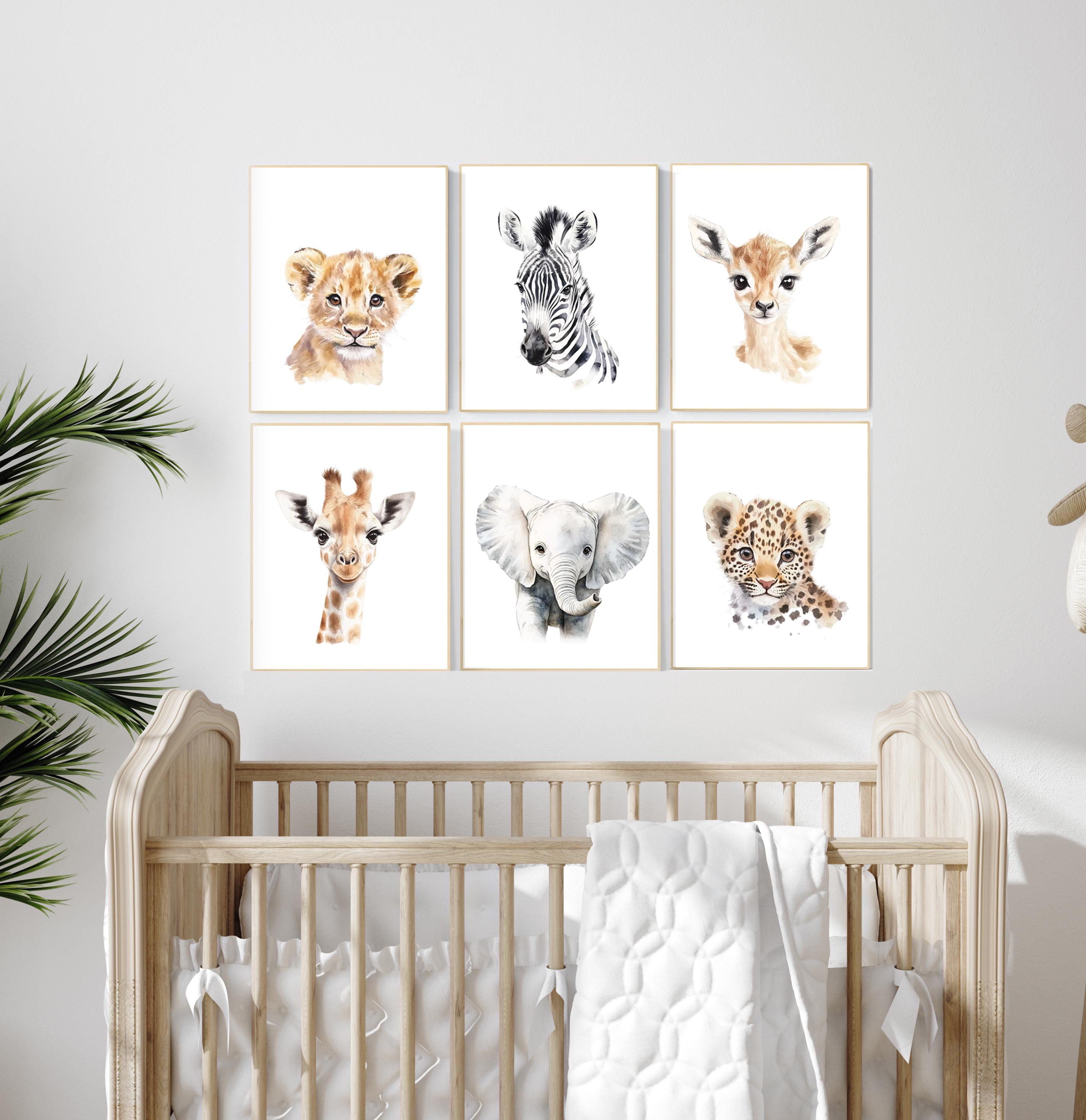 This set of six safari baby animal prints features watercolor portraits of a lion cub, zebra, elephant, giraffe, leopard, and tiger. Perfect for jungle-themed nurseries or kids' rooms, these prints add a sweet and adventurous touch with soft, neutral tones and detailed animal expressions.