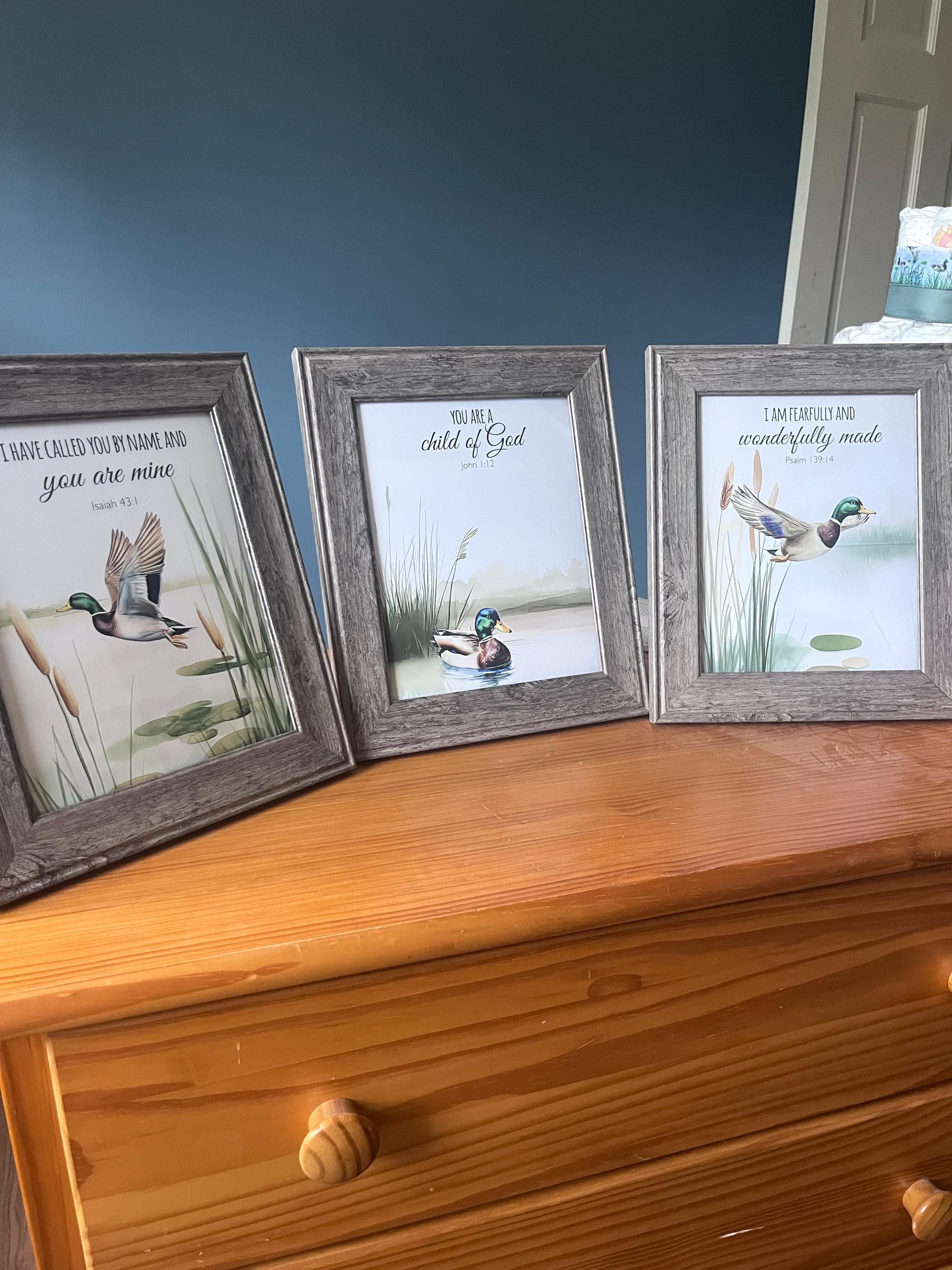 This serene duck wall art set features calming water scenes paired with meaningful Bible verses, perfect for rustic nursery or cabin spaces. The gentle tones and watercolor mallards make a peaceful statement of faith and nature.
