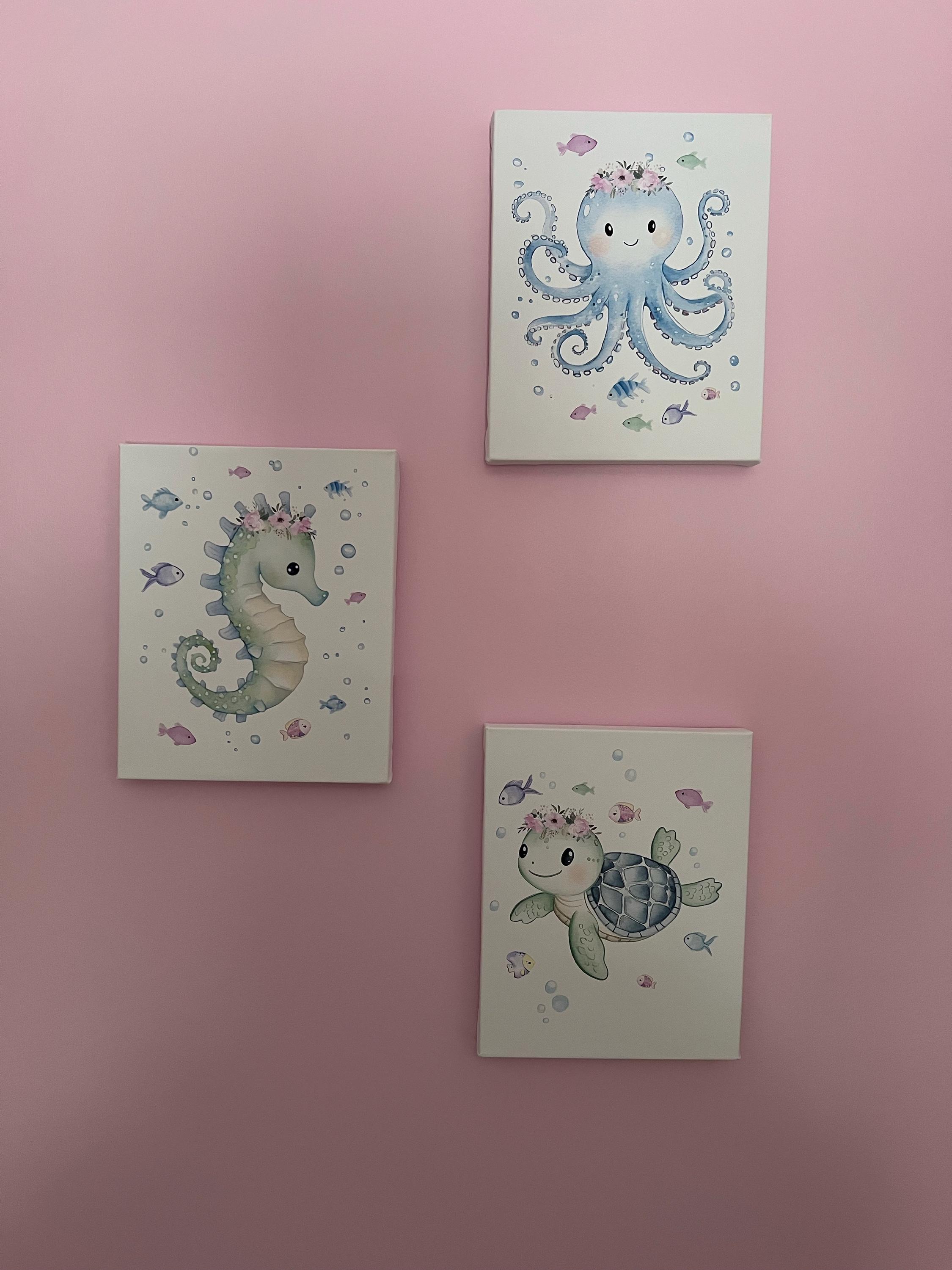 This Pink Under the Sea Nursery Wall Art Set features a sweet seahorse, octopus, and turtle, each adorned with soft floral crowns and surrounded by tiny sea friends.