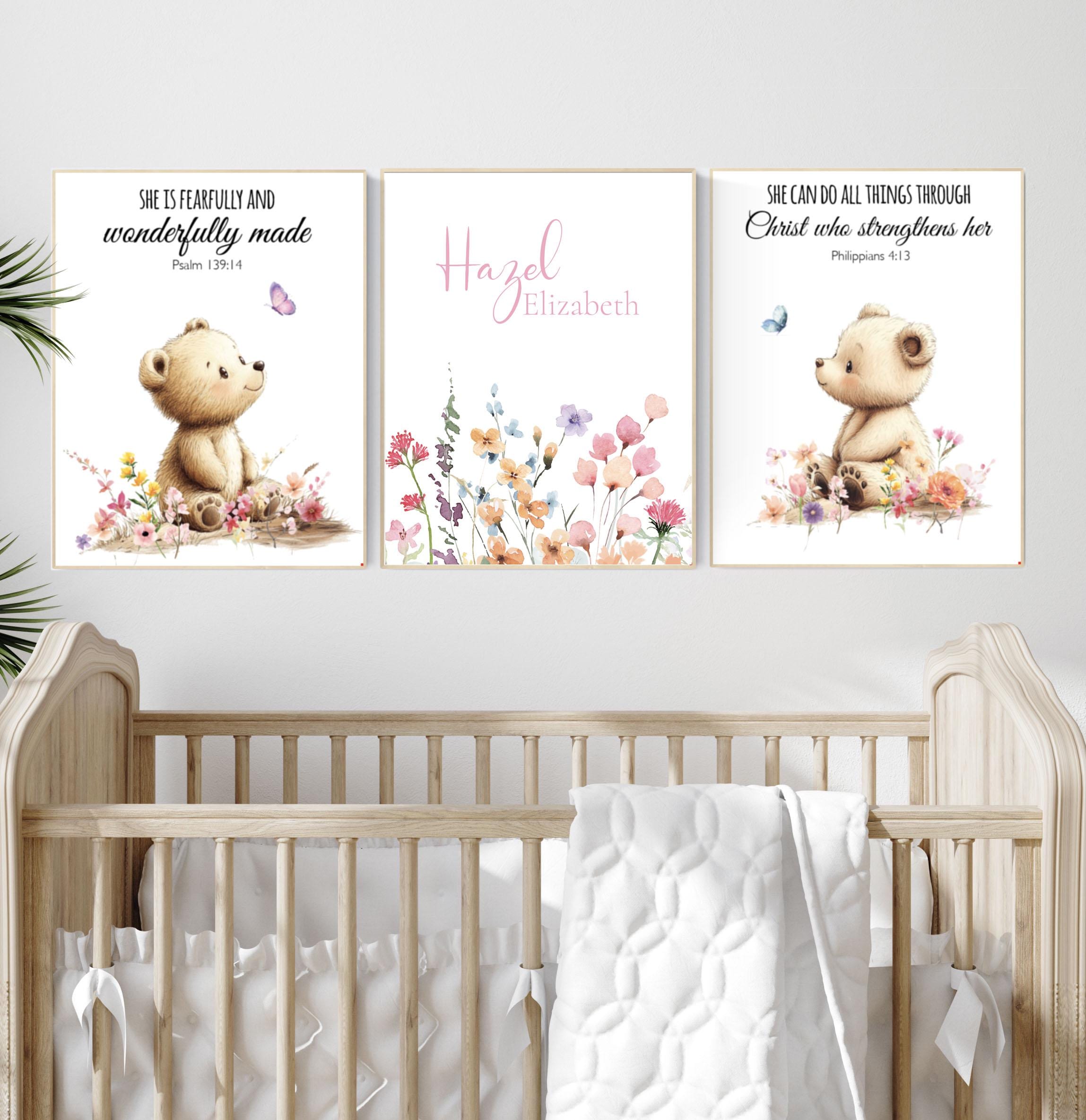 Adorable personalized bear nursery wall art featuring Bible verses and your child’s name, This Christian floral animal print set makes a meaningful gift for baptisms, christenings, or new parents.