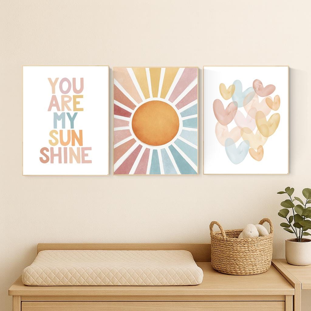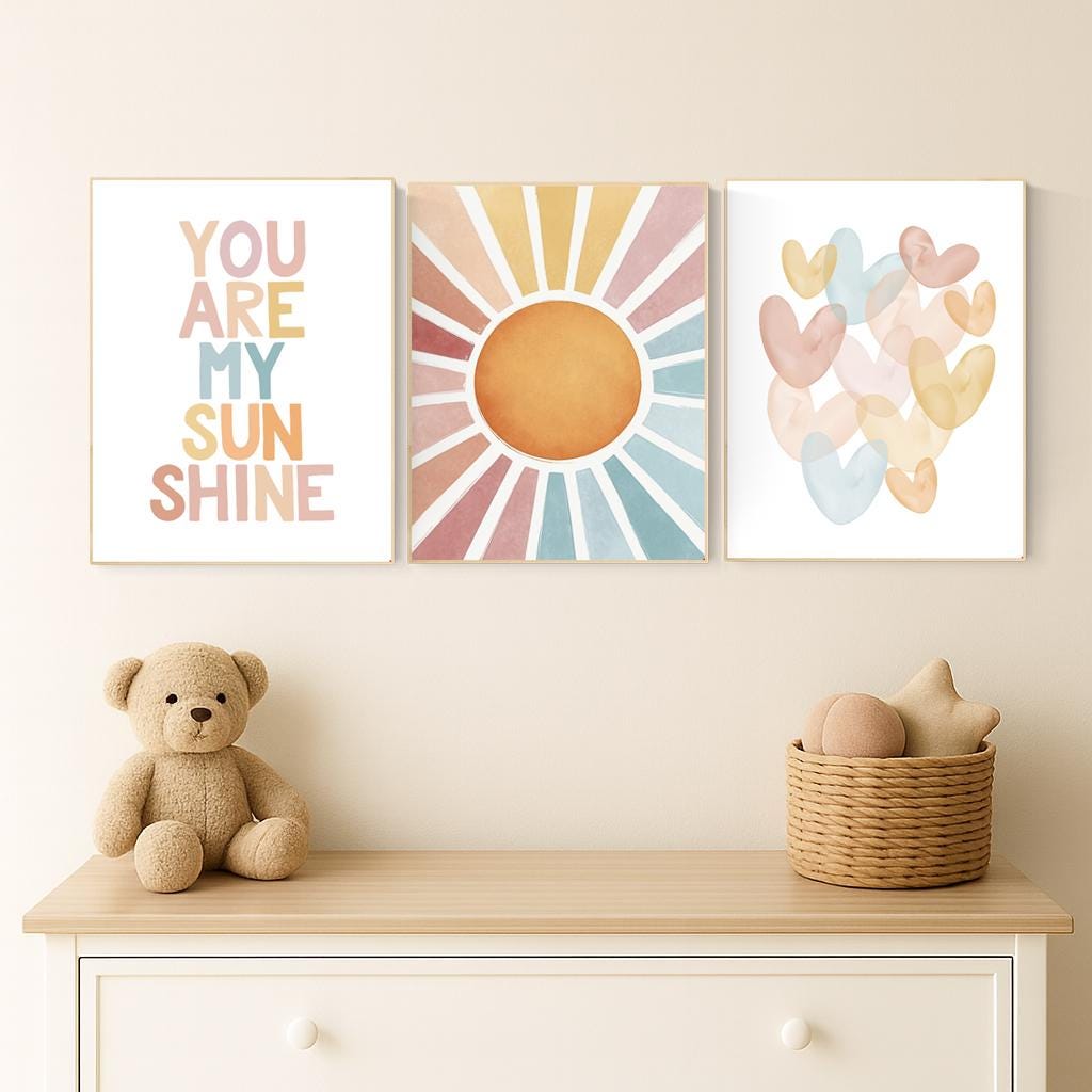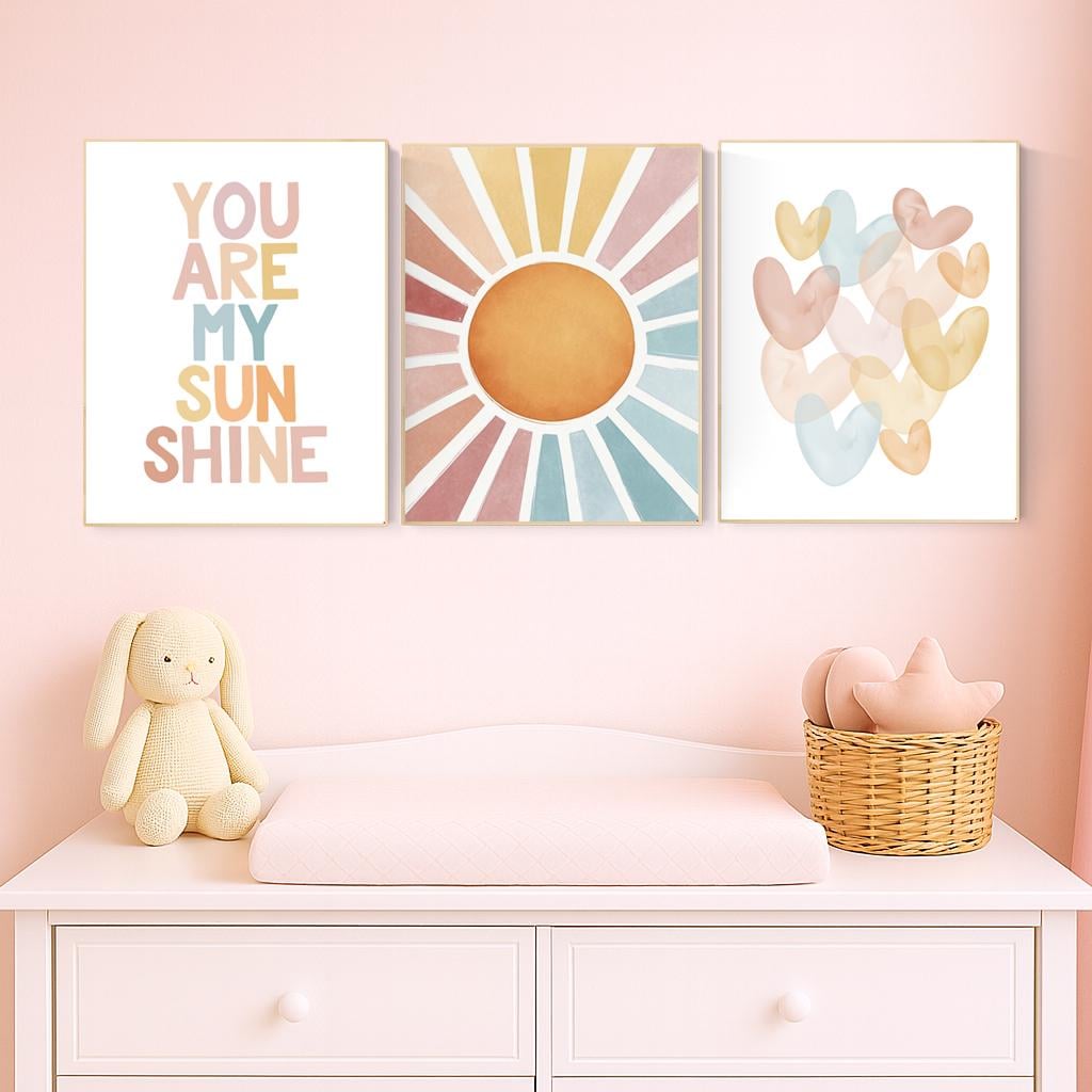 Brighten up your little one’s room with this cheerful “You Are My Sunshine” wall art set. Featuring pastel sunshine, rainbow hearts, and uplifting typography, it’s perfect for nurseries, playrooms, or as a baby shower gift.