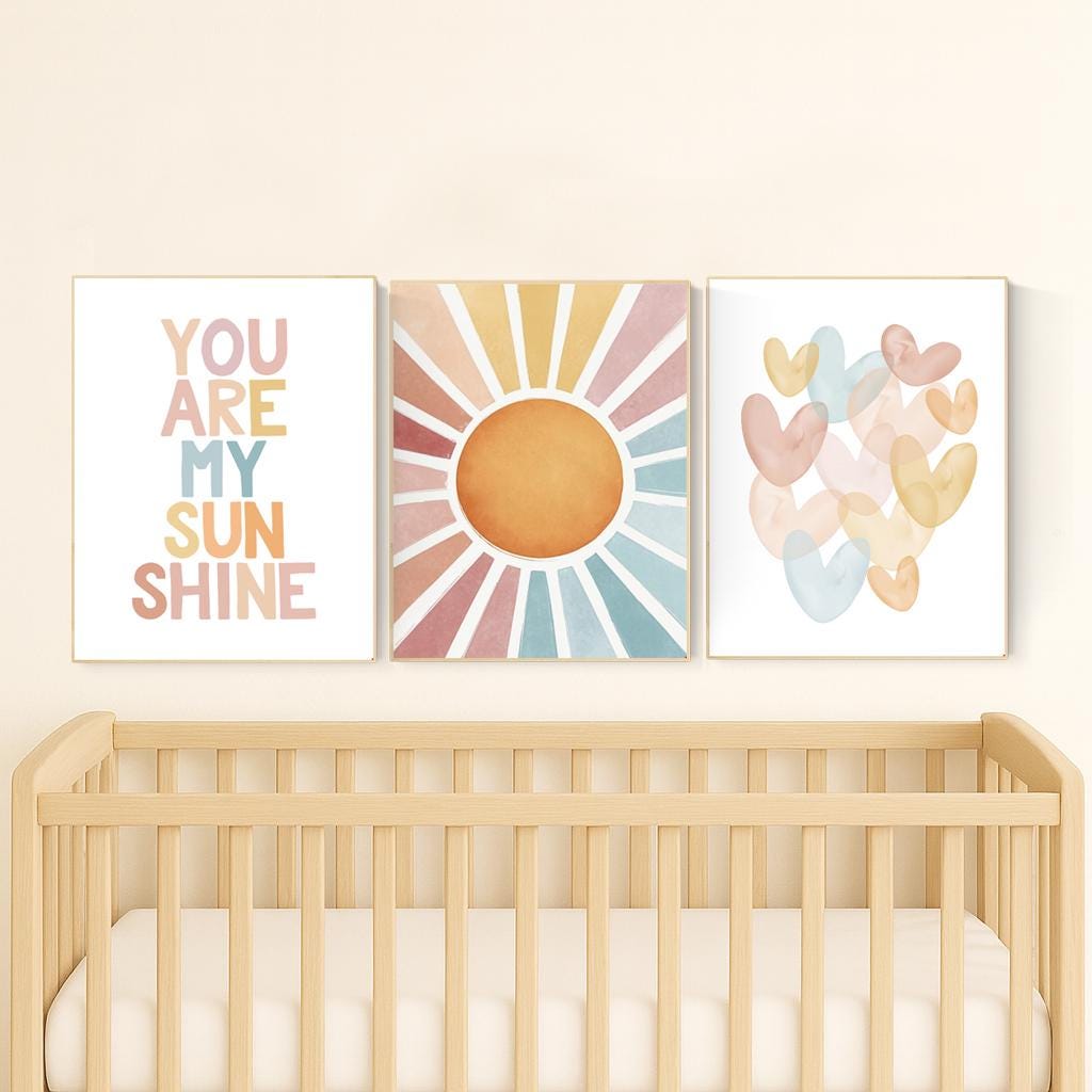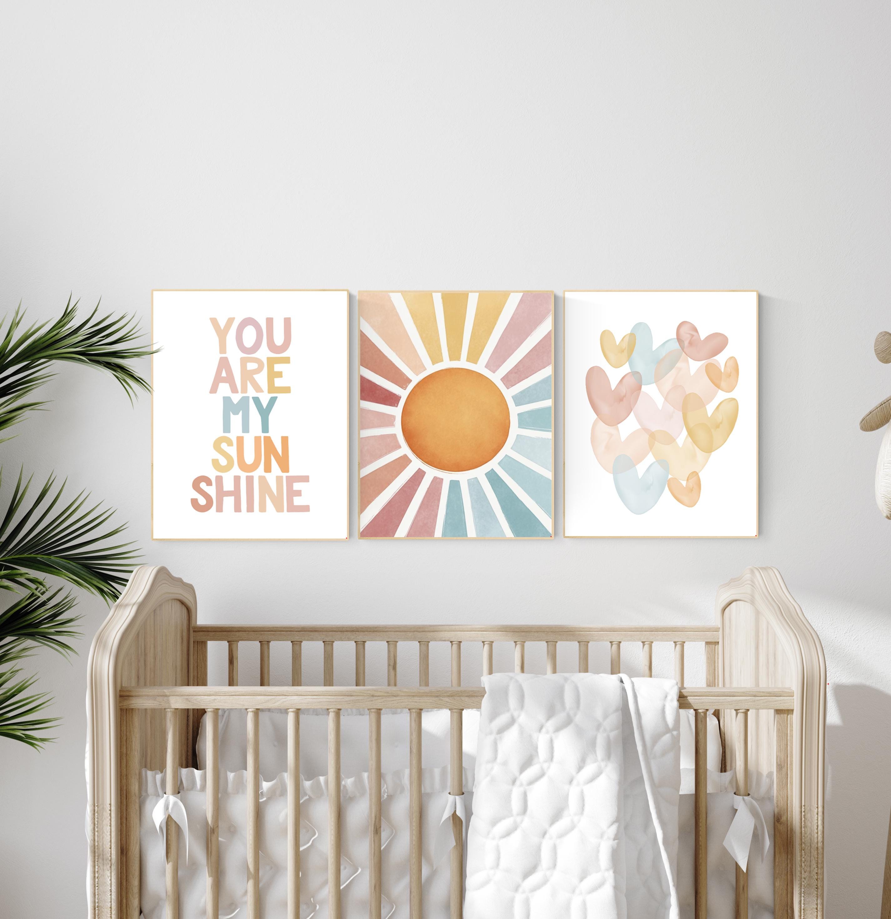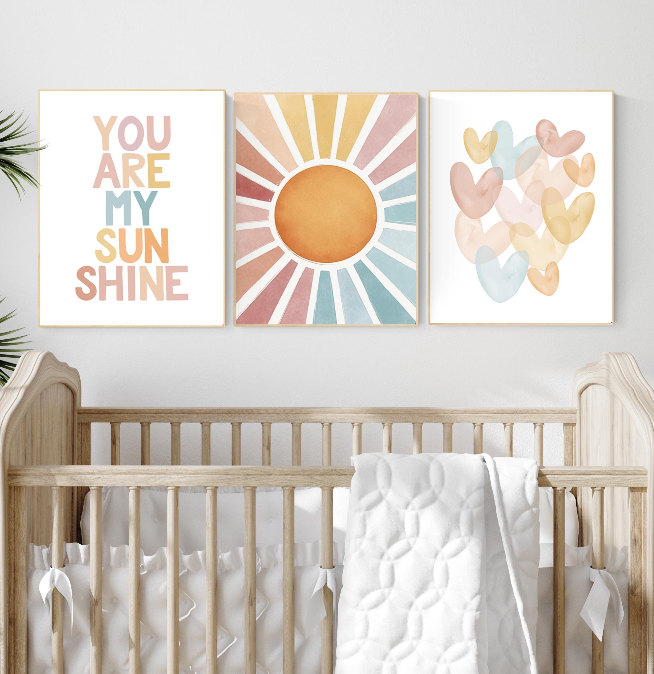 Brighten up your little one’s room with this cheerful “You Are My Sunshine” wall art set. Featuring pastel sunshine, rainbow hearts, and uplifting typography, it’s perfect for nurseries, playrooms, or as a baby shower gift.