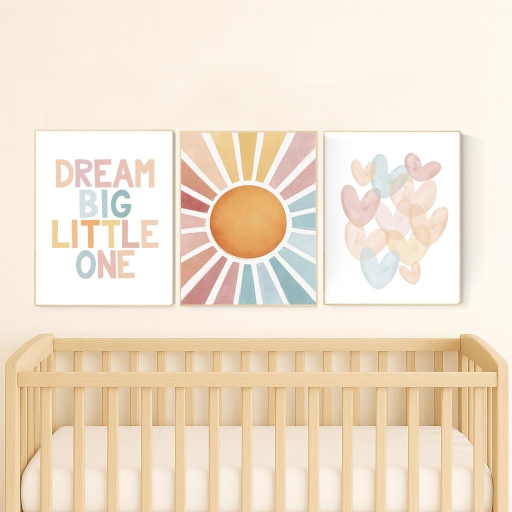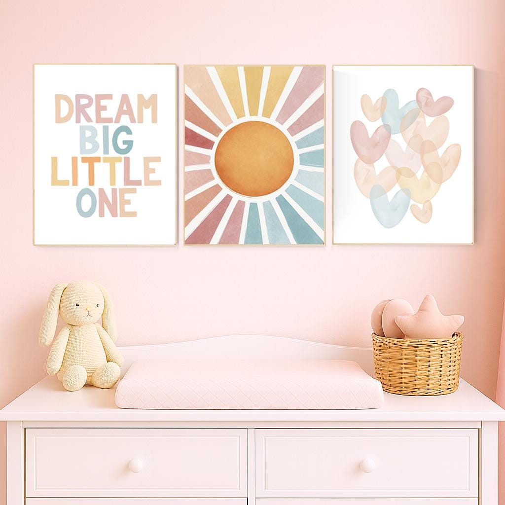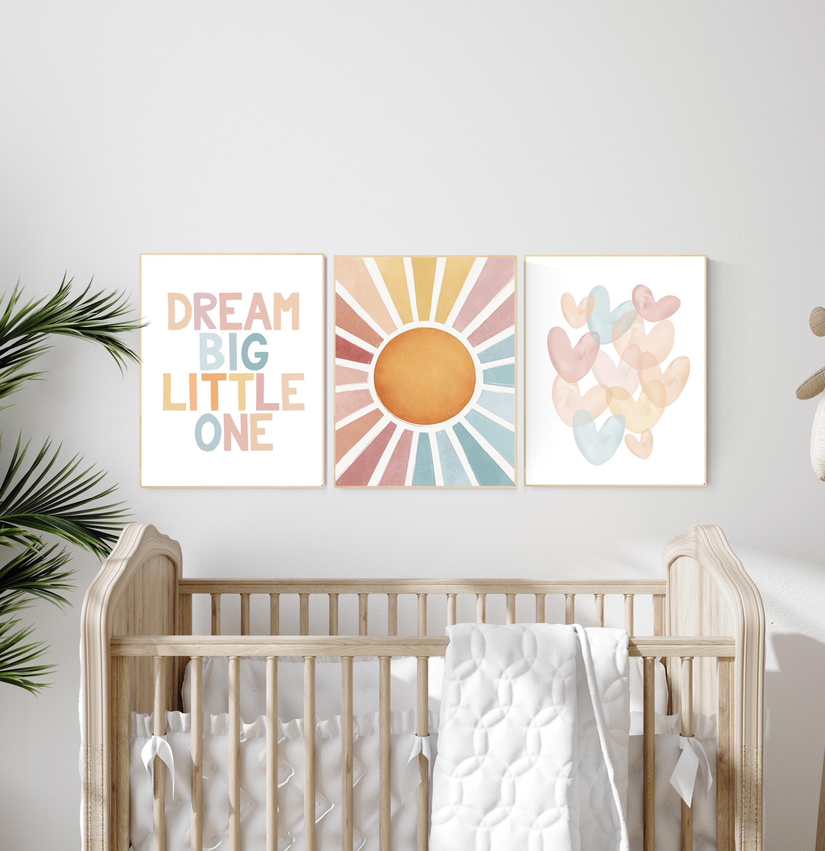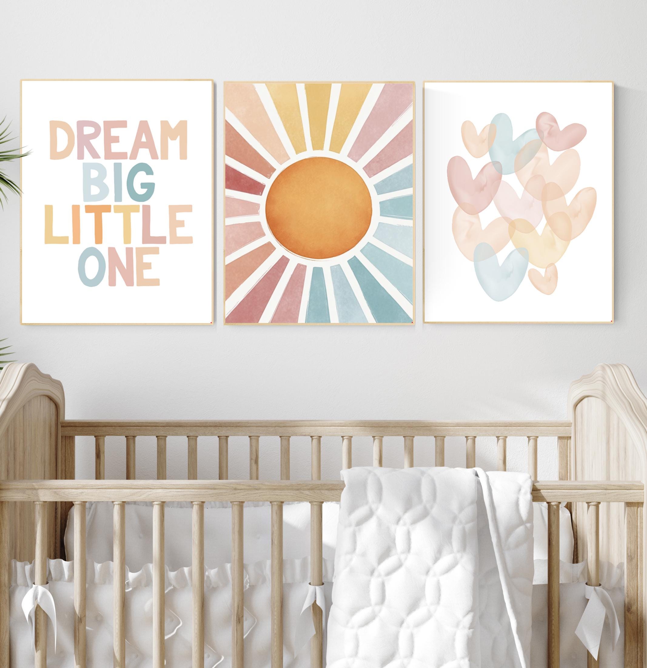 Brighten your nursery with this uplifting “Dream Big Little One” wall art set featuring a rainbow sun and pastel hearts. Perfect for baby rooms, kids’ spaces, or as a thoughtful baby shower gift.