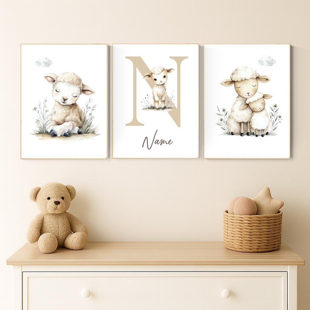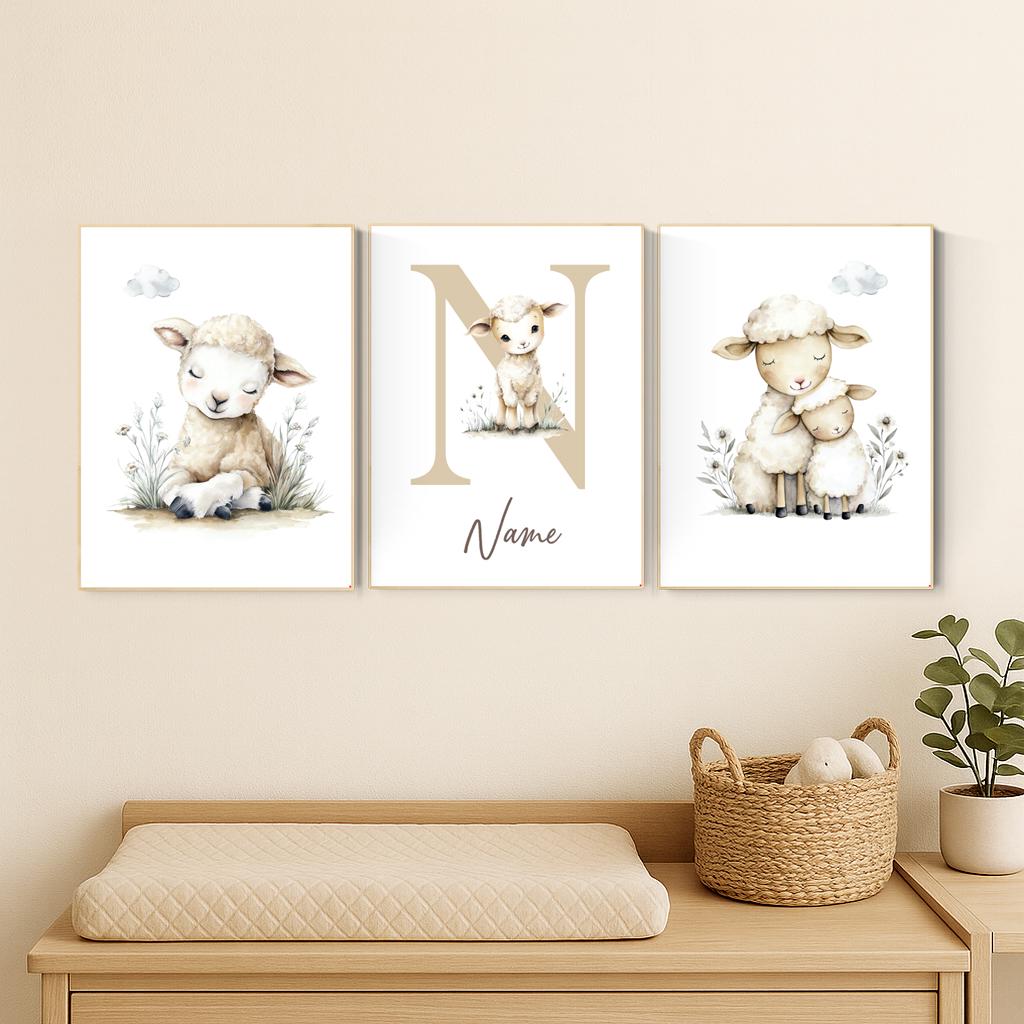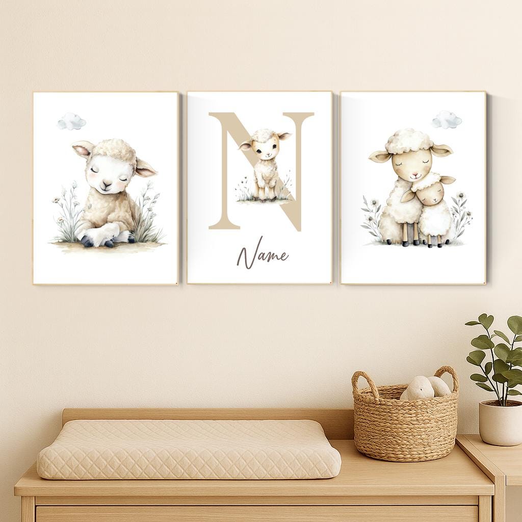 Adorable personalized sheep nursery prints featuring soft beige tones and watercolor details. Perfect for baby rooms or as a thoughtful baby shower gift — customize with your child’s name and initial for a sweet, timeless touch.