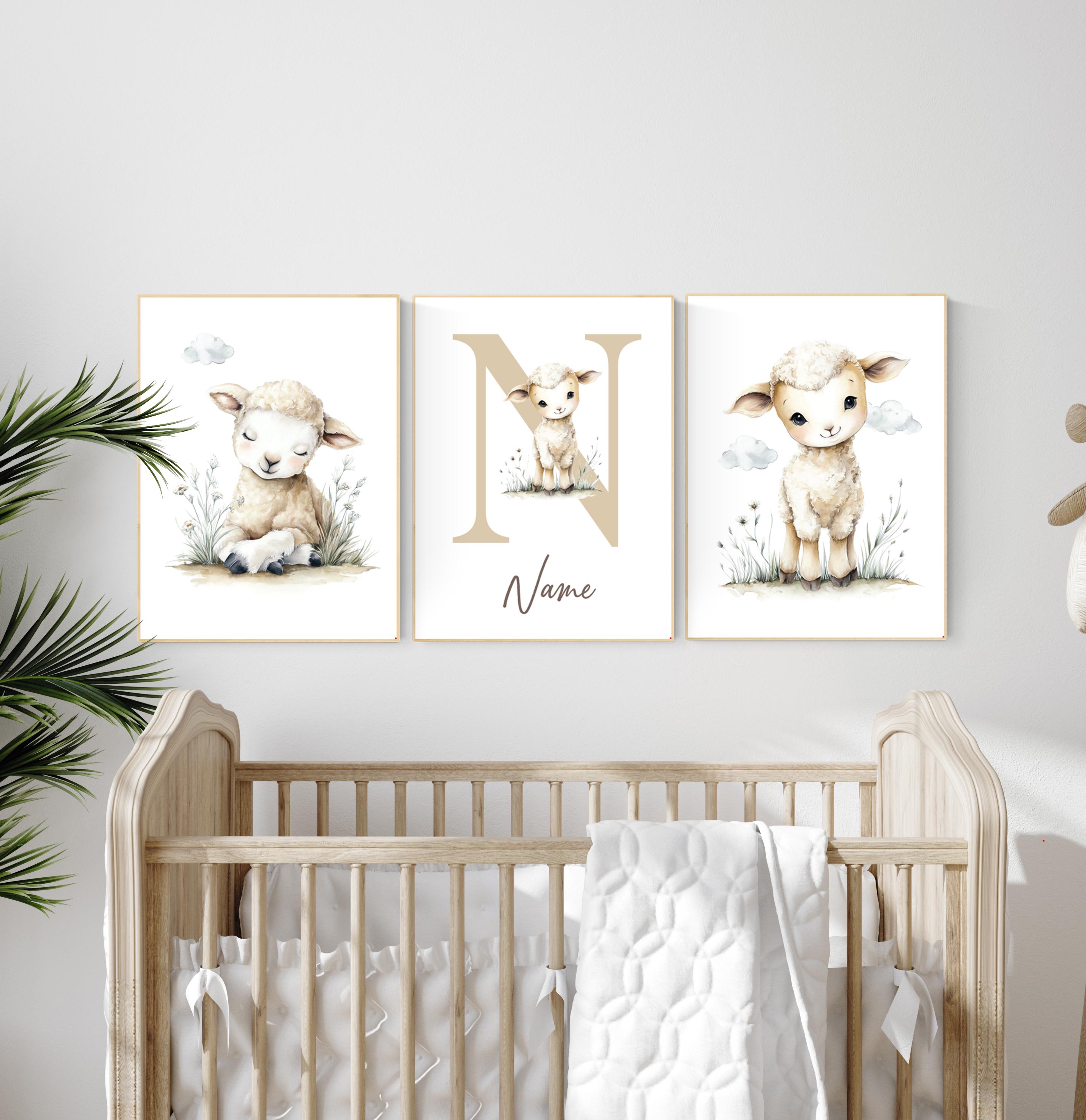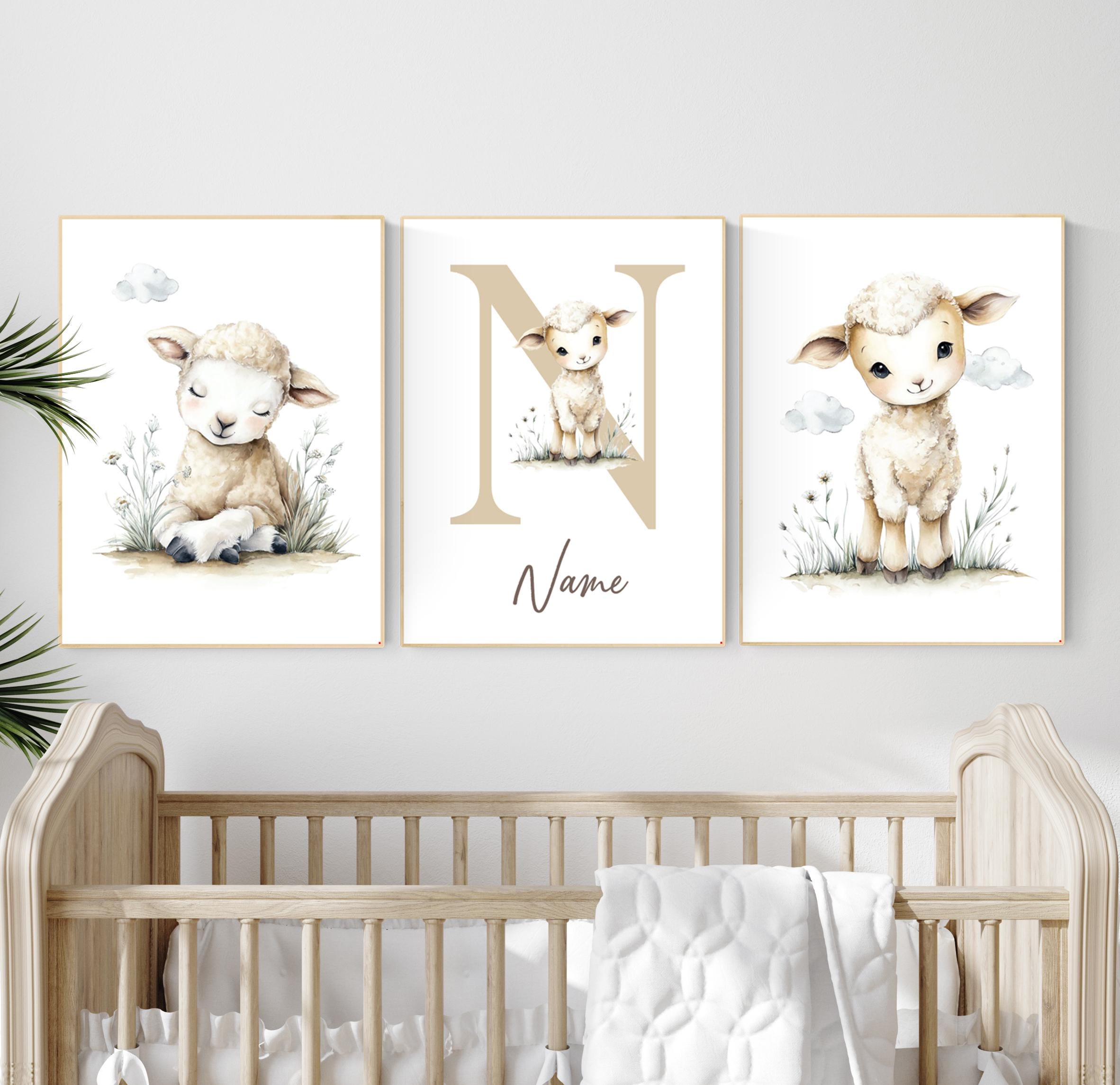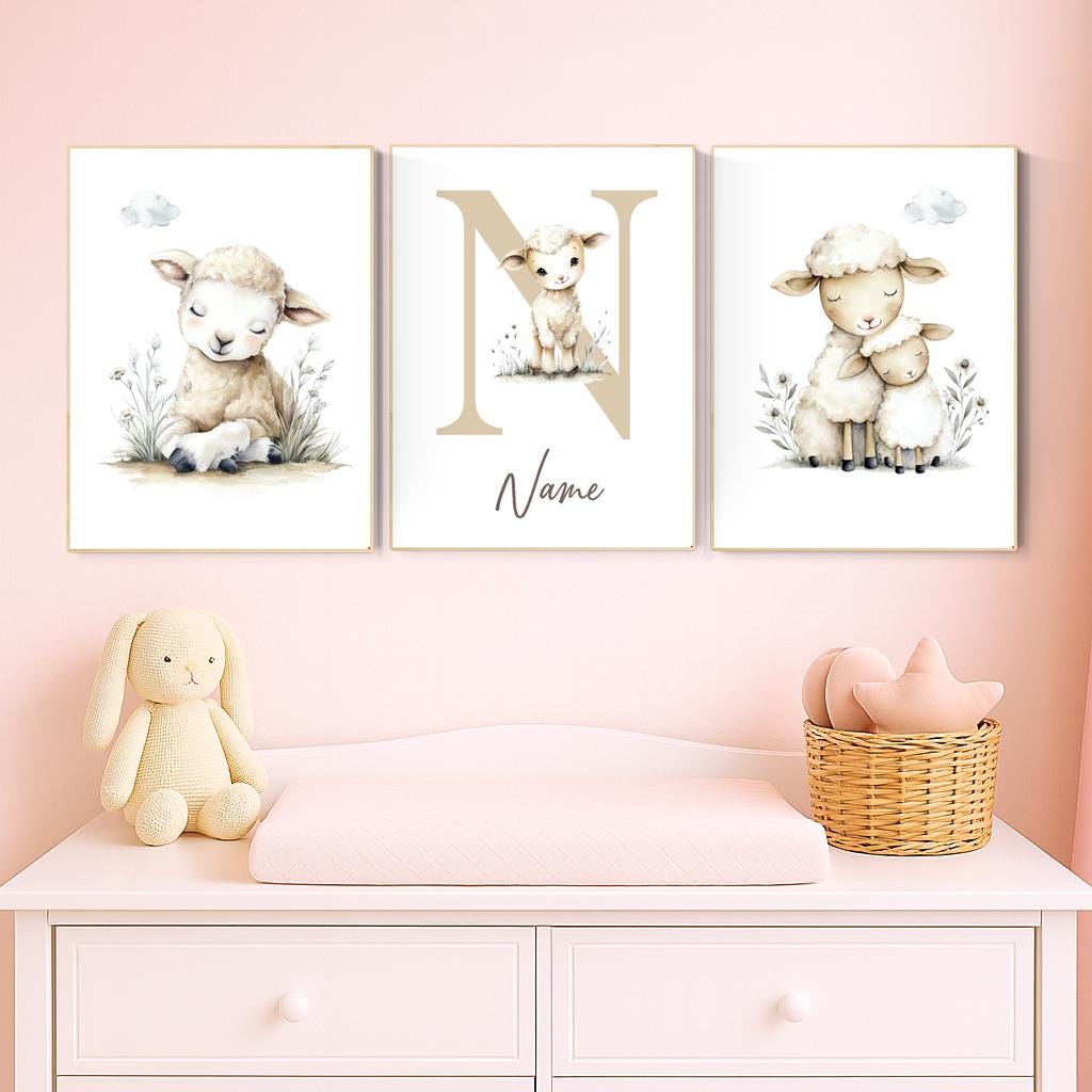 Adorable personalized sheep nursery prints featuring soft beige tones and watercolor details. Perfect for baby rooms or as a thoughtful baby shower gift — customize with your child’s name and initial for a sweet, timeless touch.