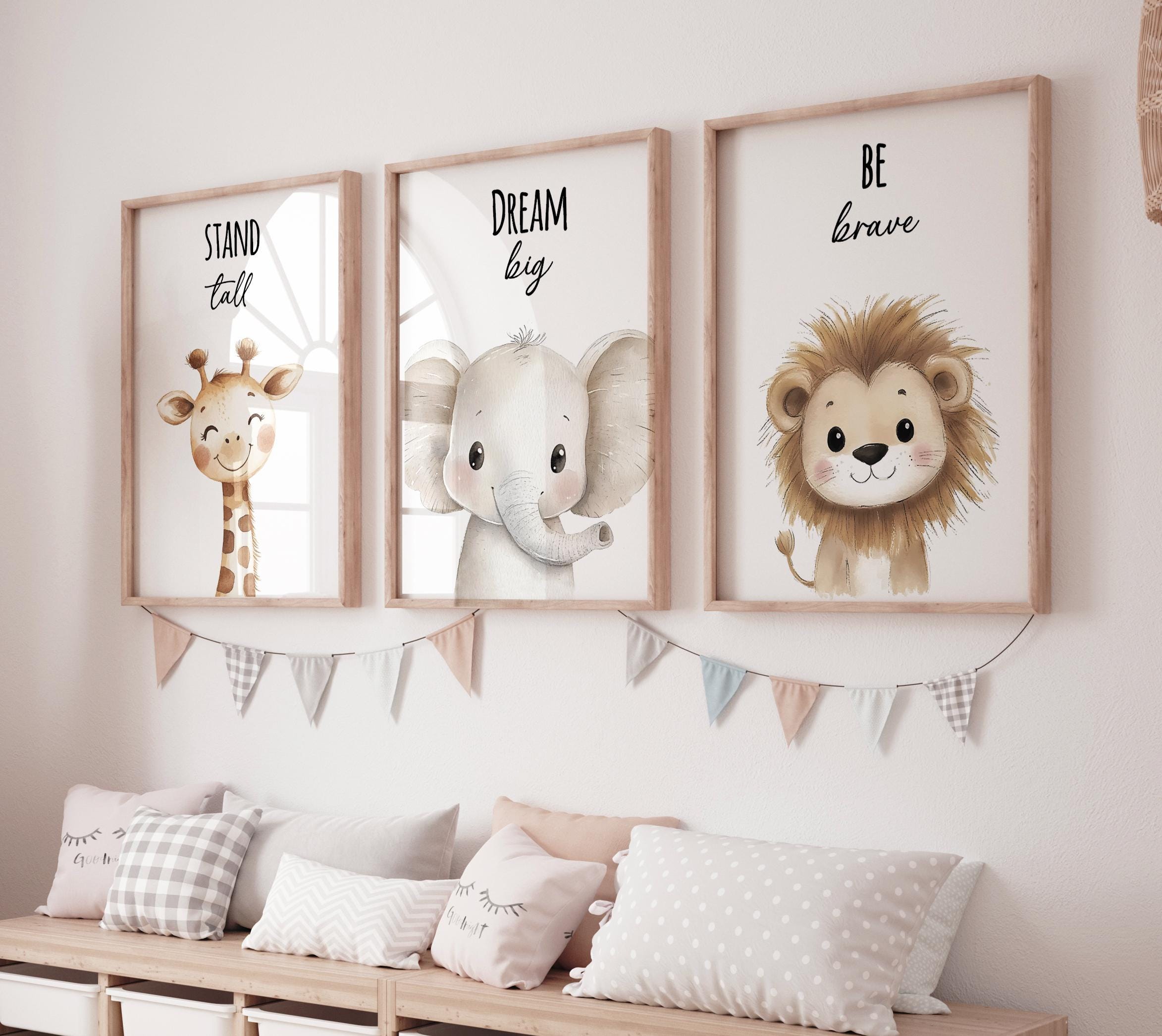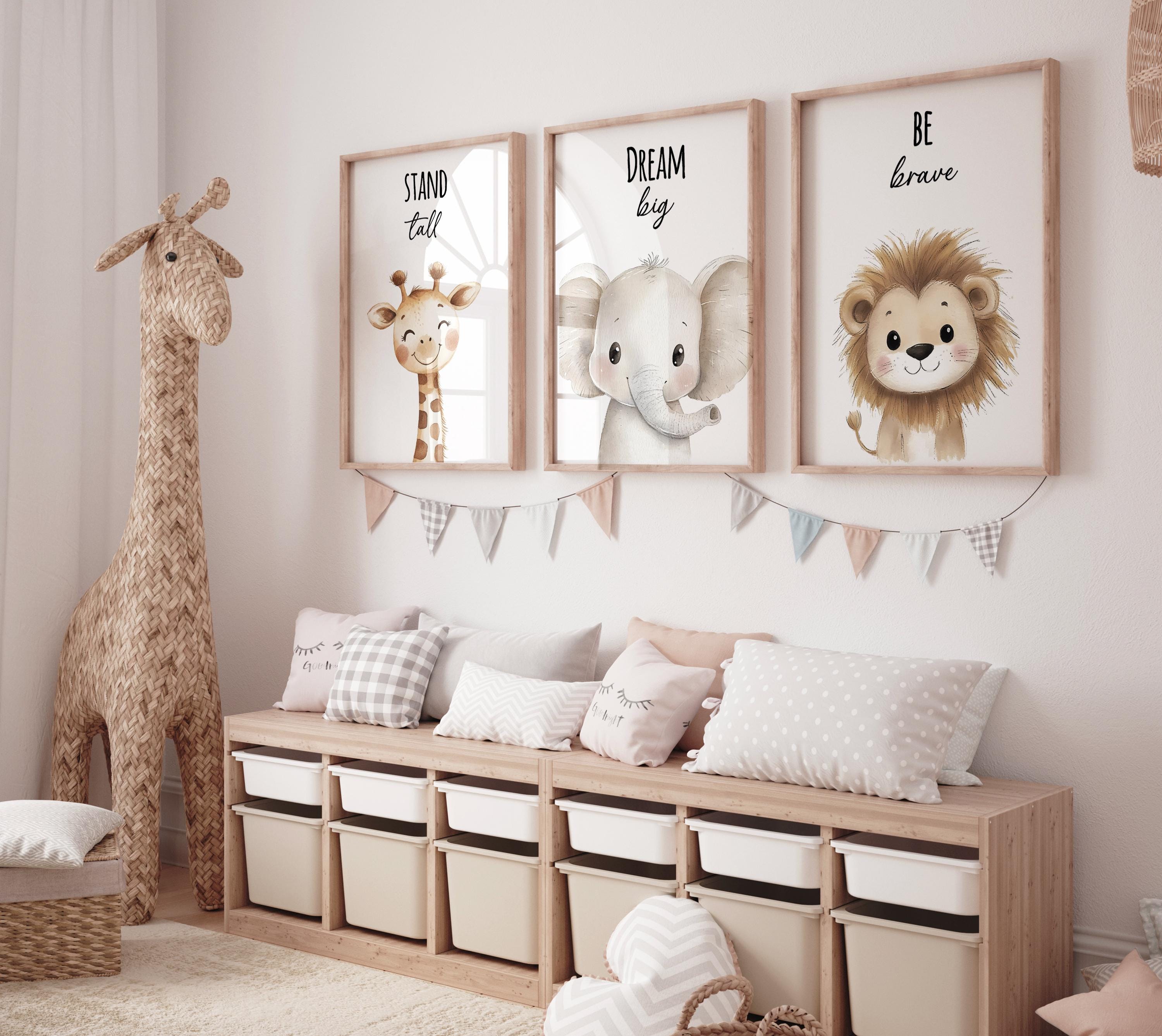 Bring warmth and inspiration to your little one’s space with this adorable safari-themed nursery wall art set. Featuring a giraffe, elephant, and lion with the uplifting quotes “Stand Tall,” “Dream Big,” and “Be Brave,” this collection is perfect for both boys’ and girls’ rooms.
