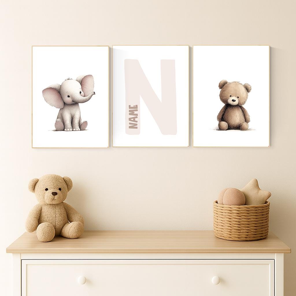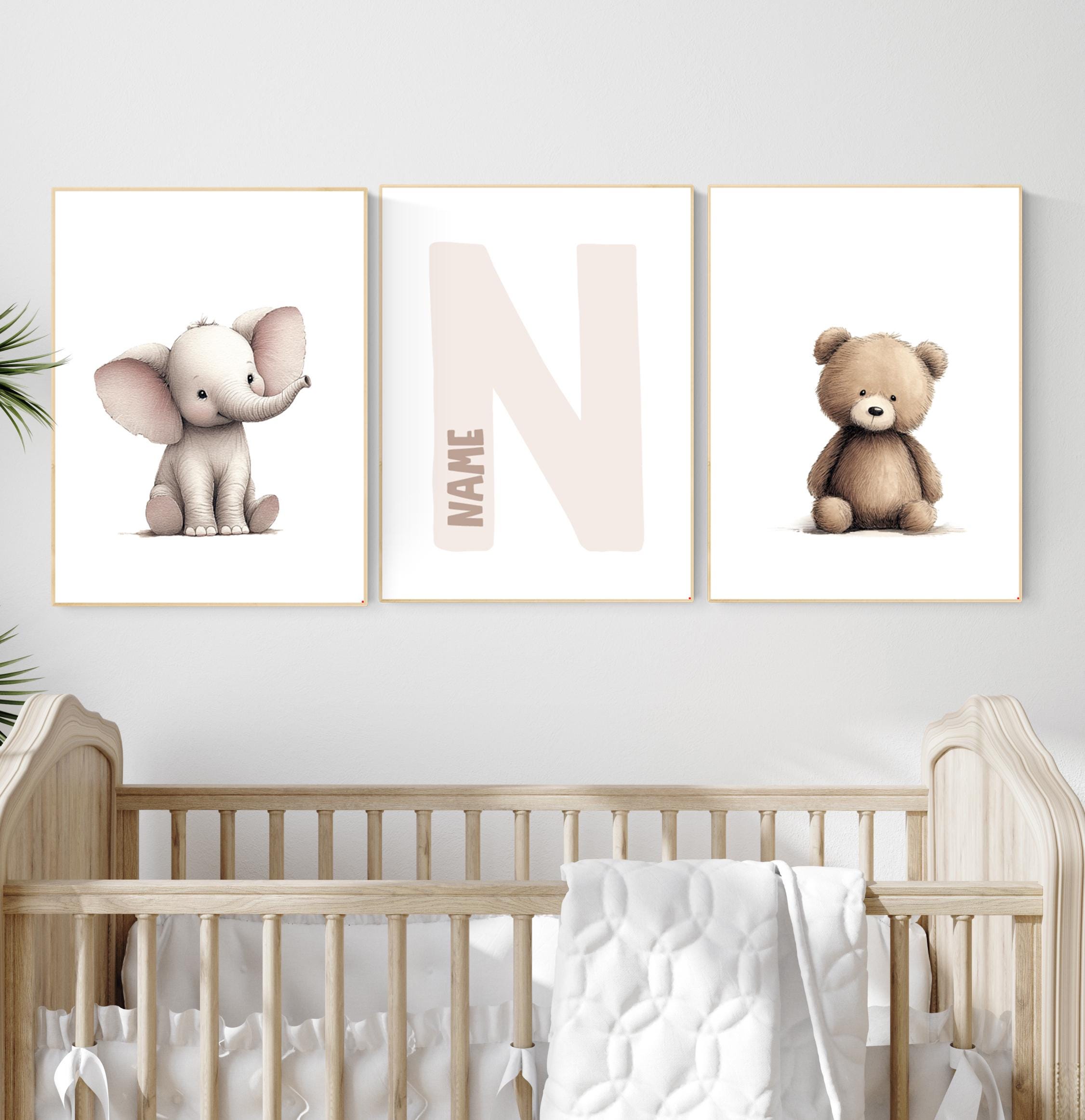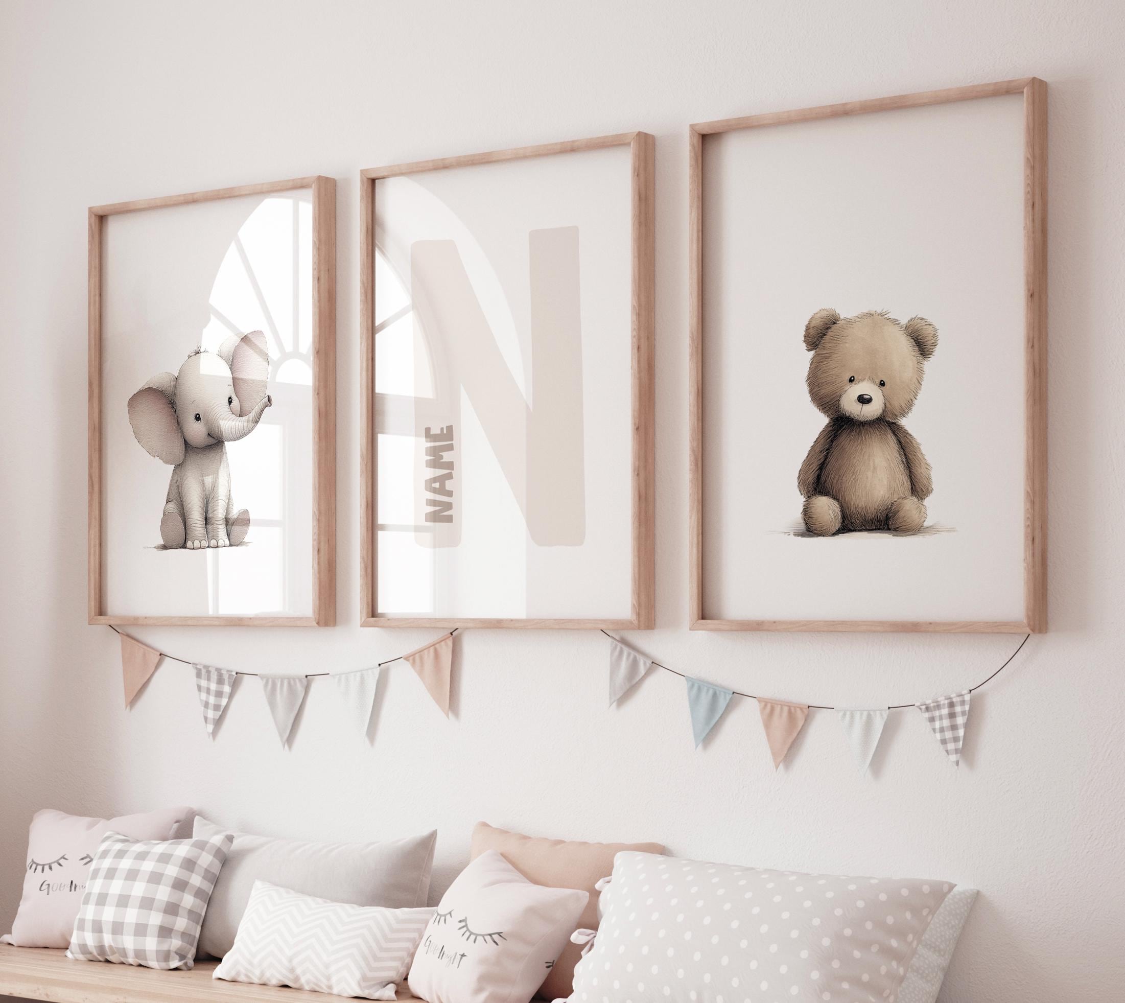 Transform your baby’s room into a cozy, heart-warming space with this adorable Elephant and Bear Nursery Wall Art Set. Featuring two cute animal prints and a personalized initial print in the center, this set makes a perfect keepsake for your little one’s nursery or a thoughtful baby shower gift.