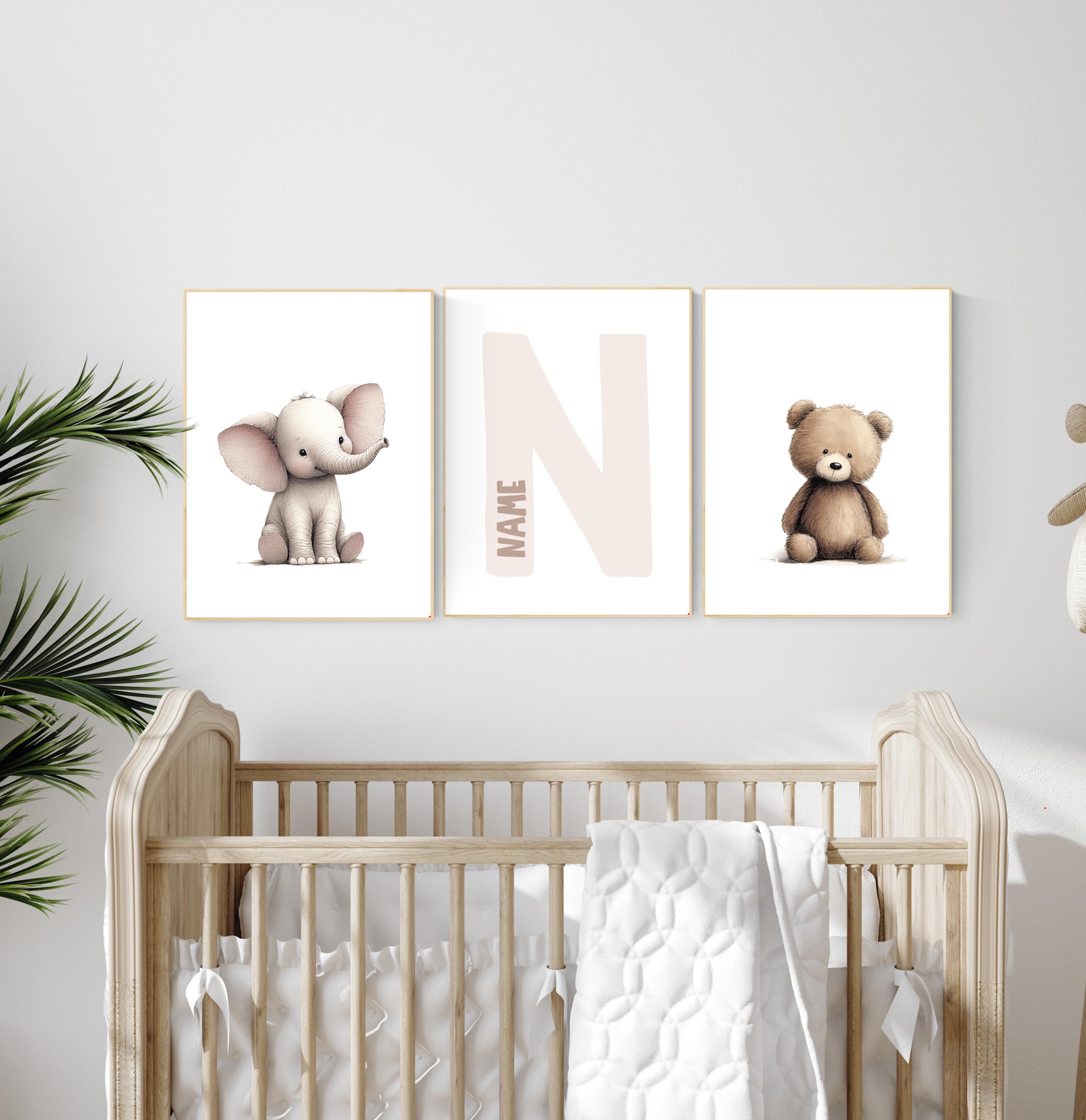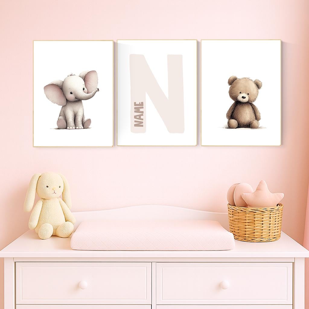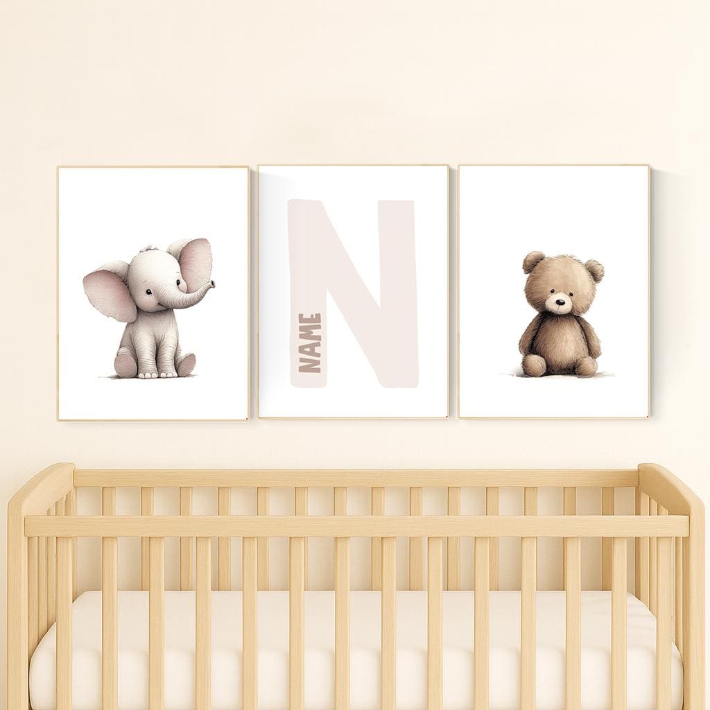 Transform your baby’s room into a cozy, heart-warming space with this adorable Elephant and Bear Nursery Wall Art Set. Featuring two cute animal prints and a personalized initial print in the center, this set makes a perfect keepsake for your little one’s nursery or a thoughtful baby shower gift.