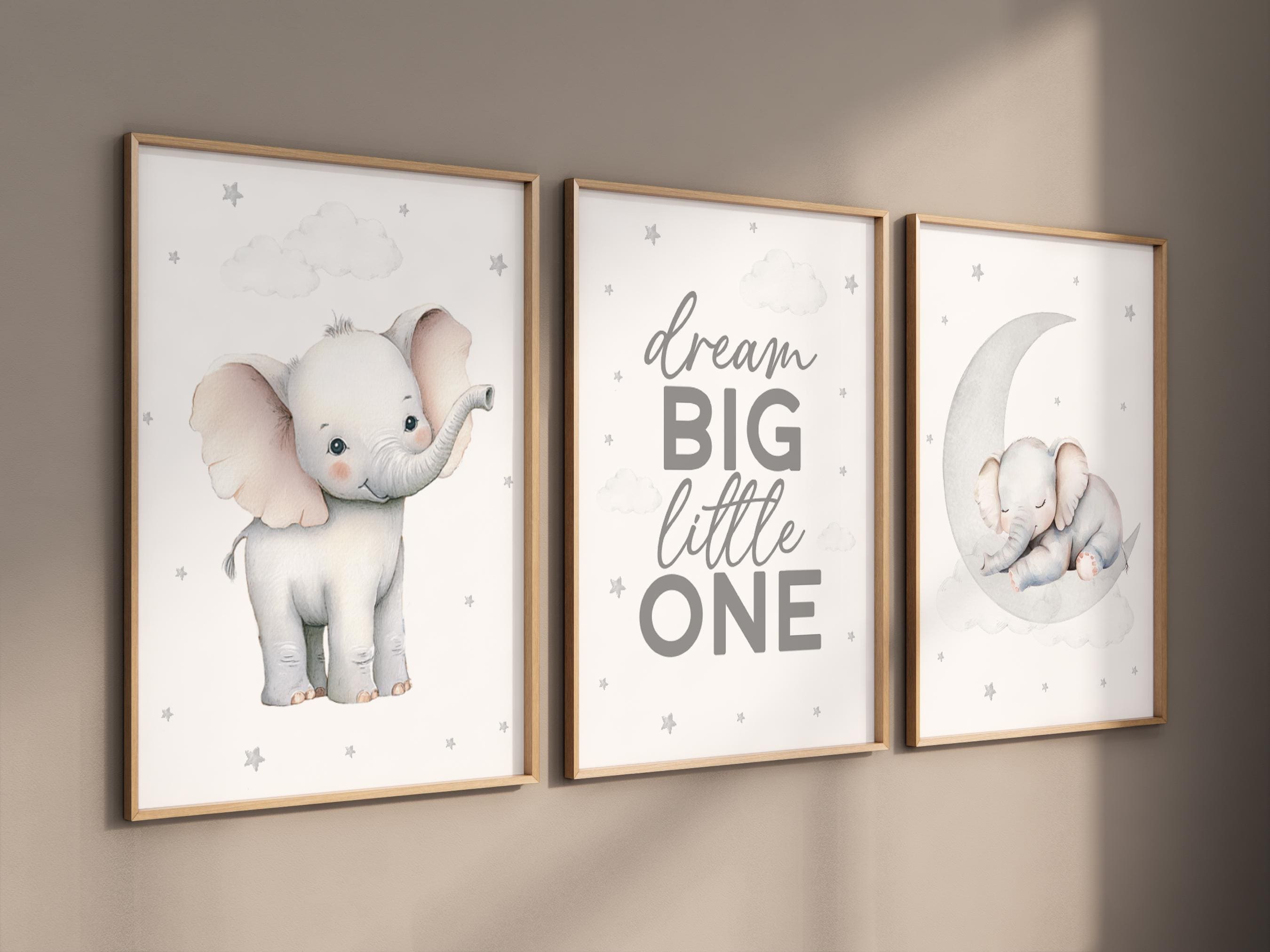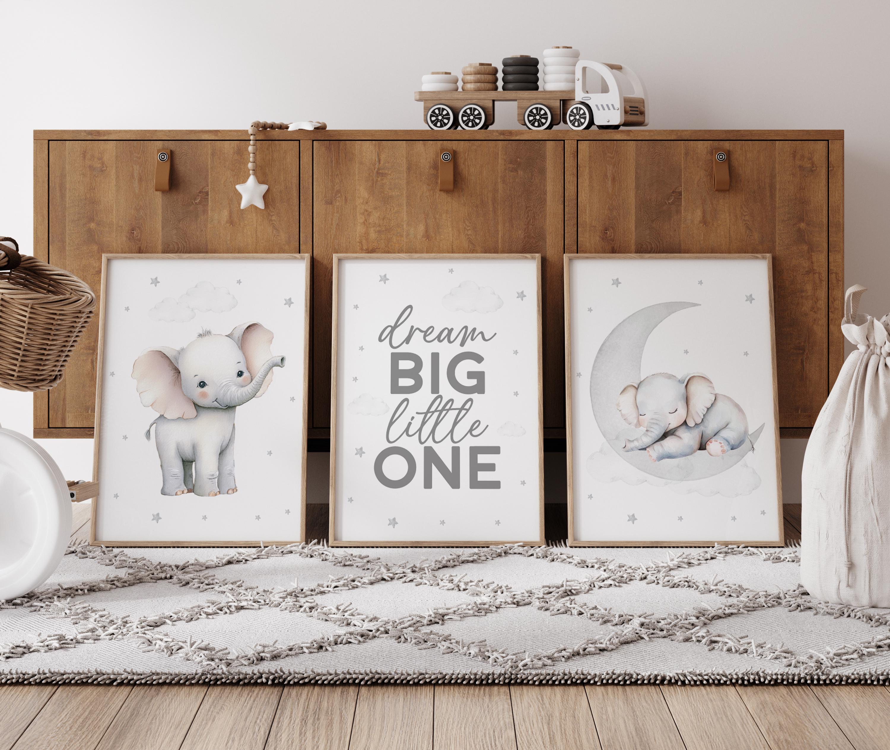 Bring warmth and serenity to your baby’s room with this charming Elephant Nursery Wall Art Set. Designed in soft neutral tones, it features a playful baby elephant, a sleeping elephant on the moon, and a heartwarming quote — “Dream Big Little One.”