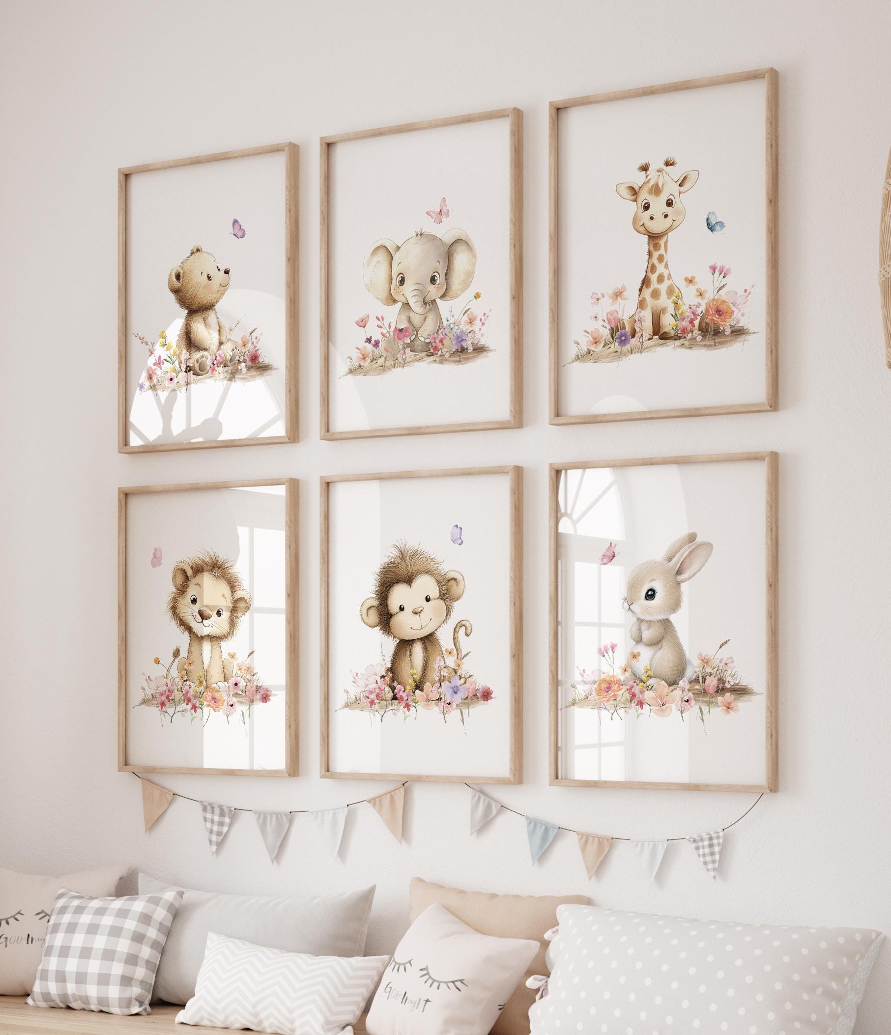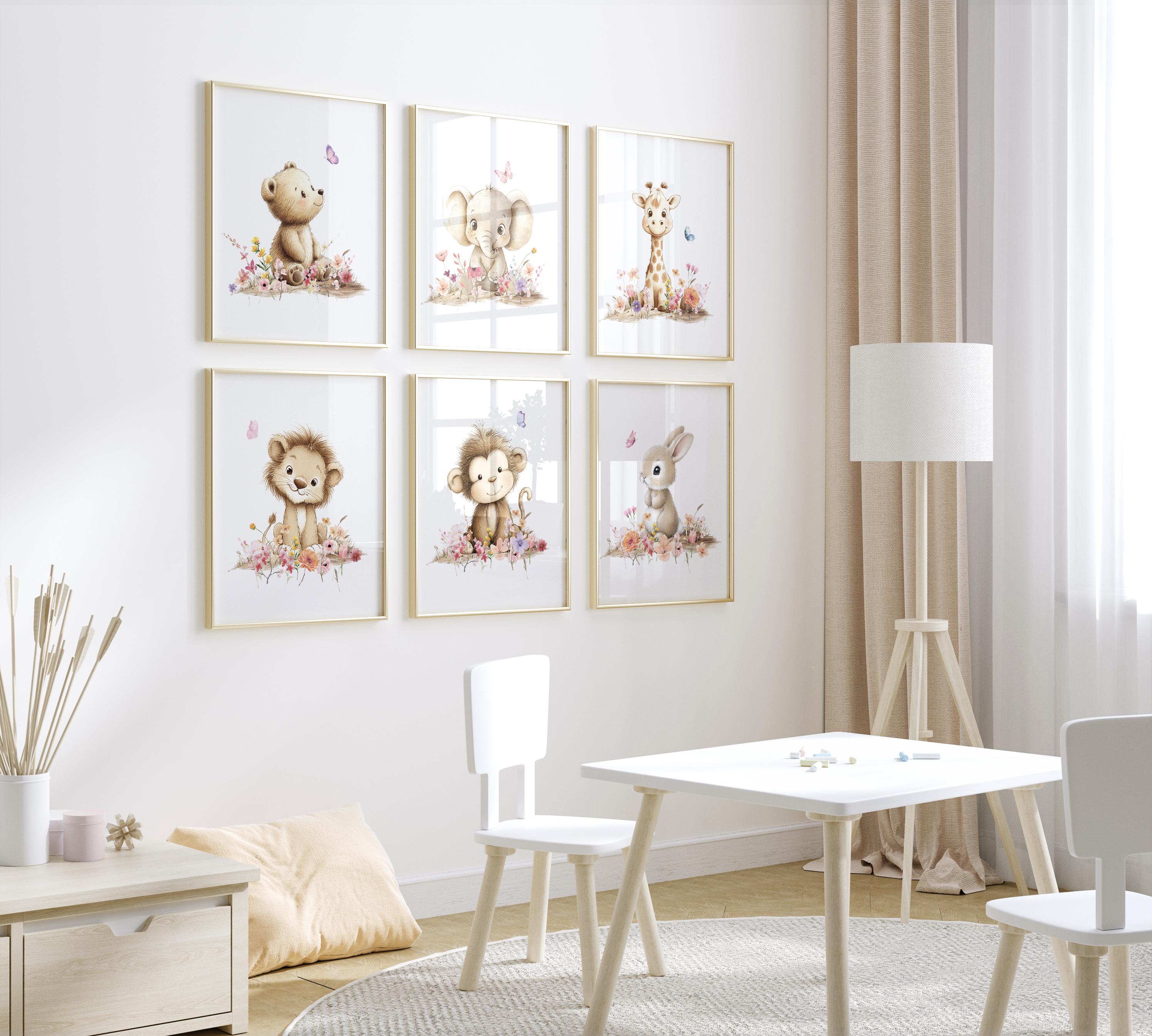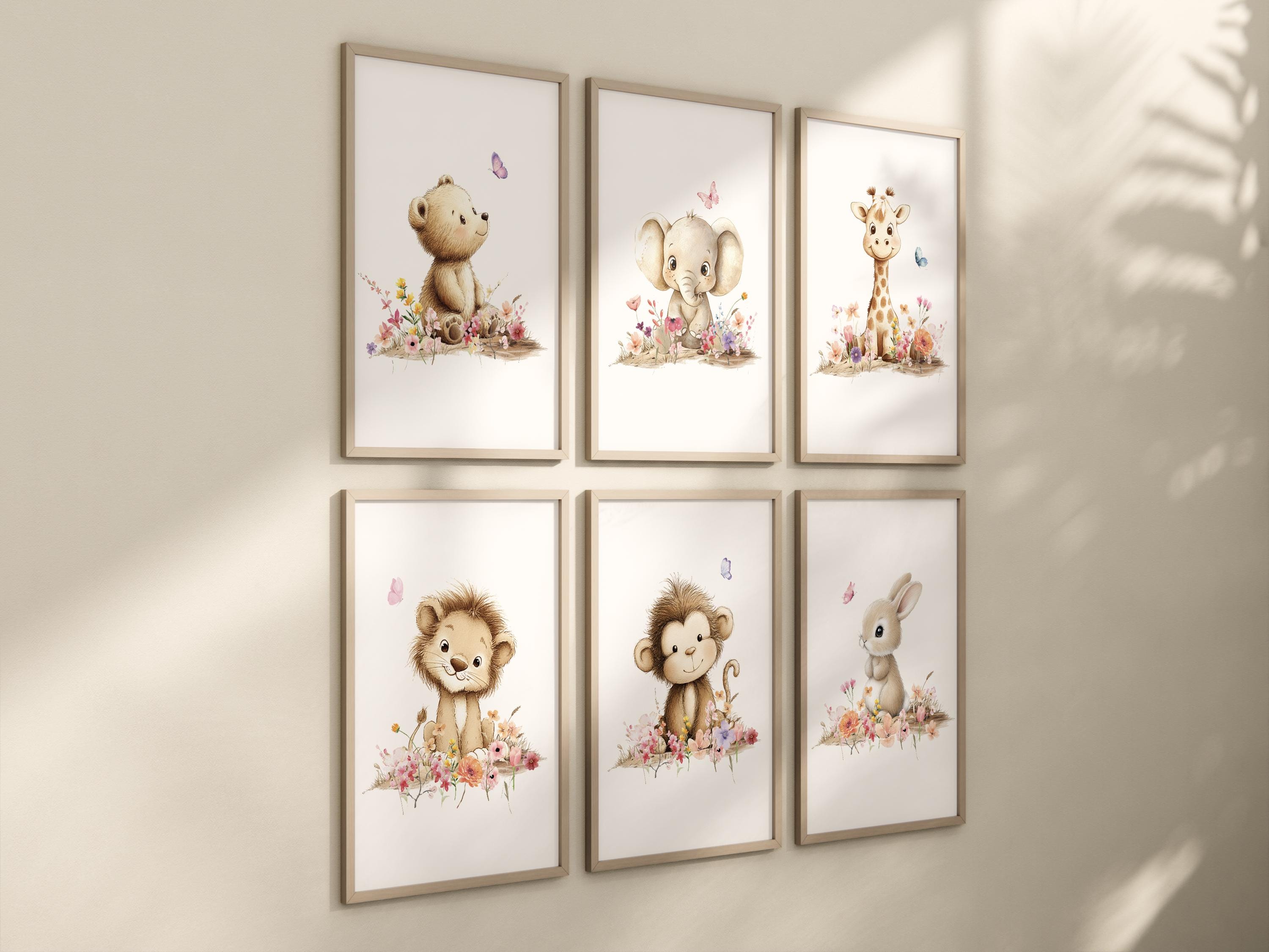 Each print features a baby safari friend — bear, elephant, giraffe, lion, monkey, and bunny — surrounded by soft watercolor flowers and butterflies.