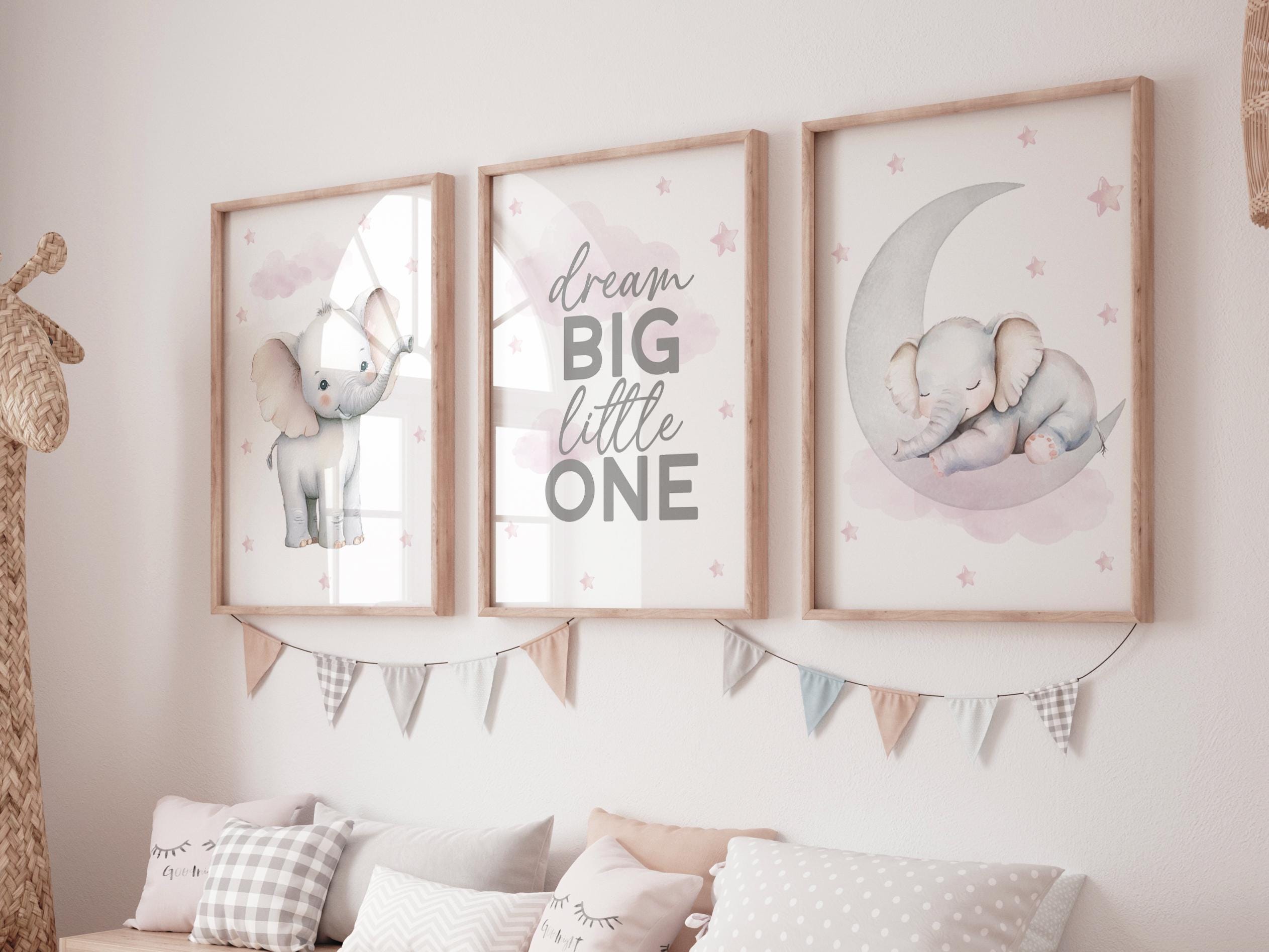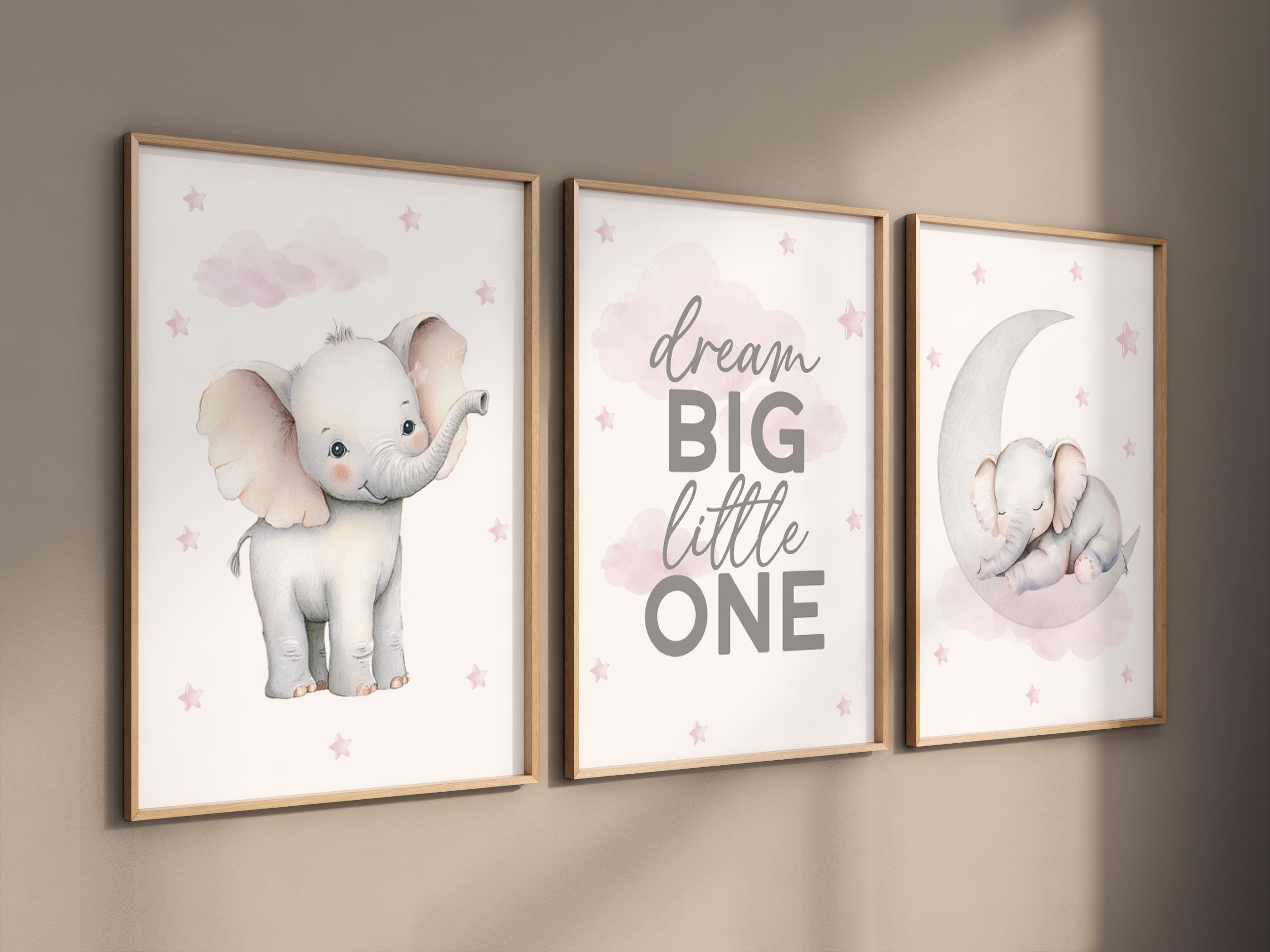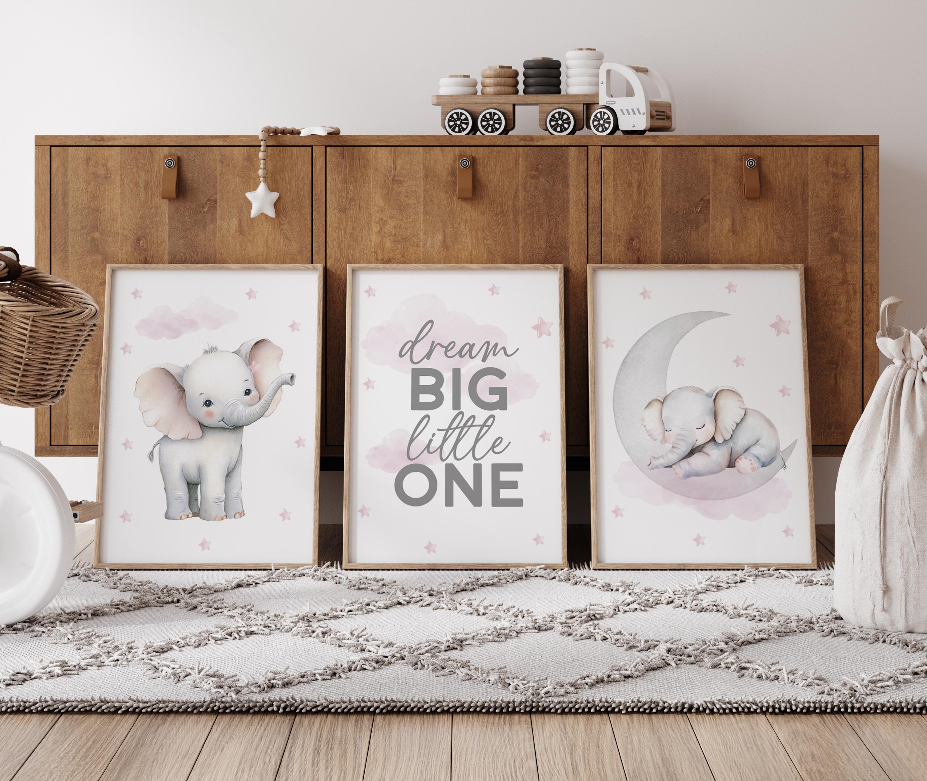 Featuring three matching prints — a standing baby elephant, “Dream Big Little One” quote, and a sleeping elephant on the moon — this soft pastel set adds charm and love to any nursery.