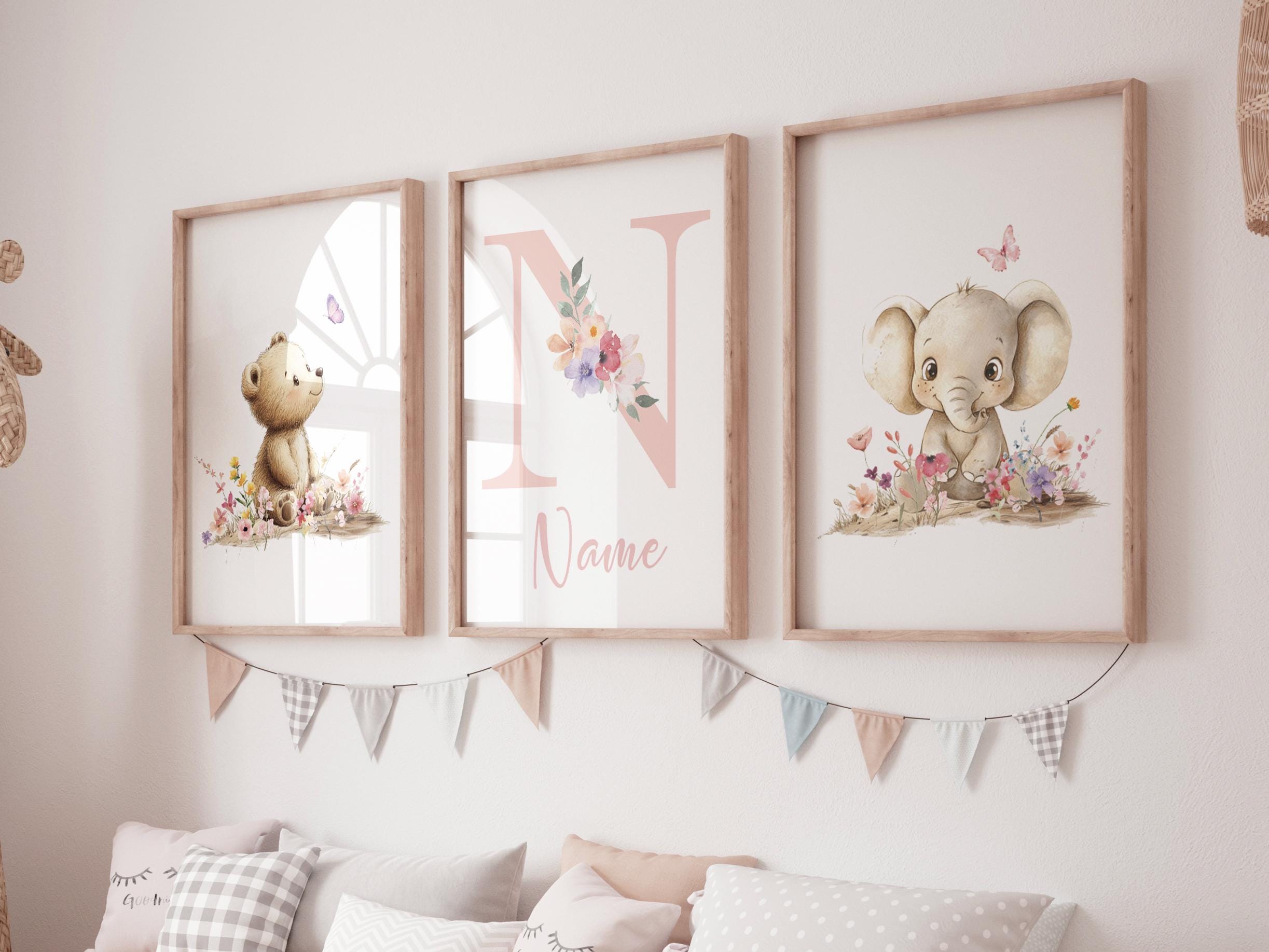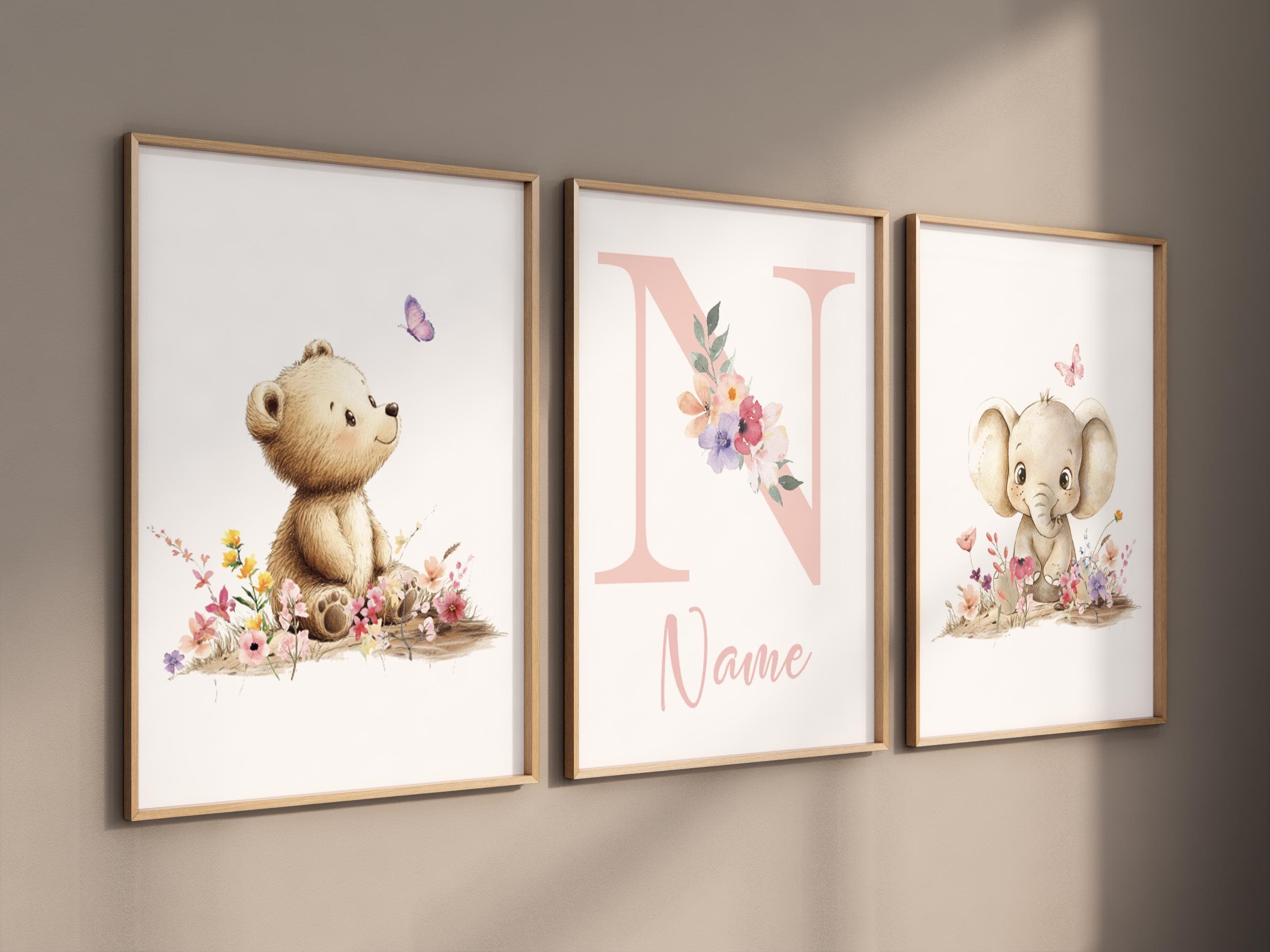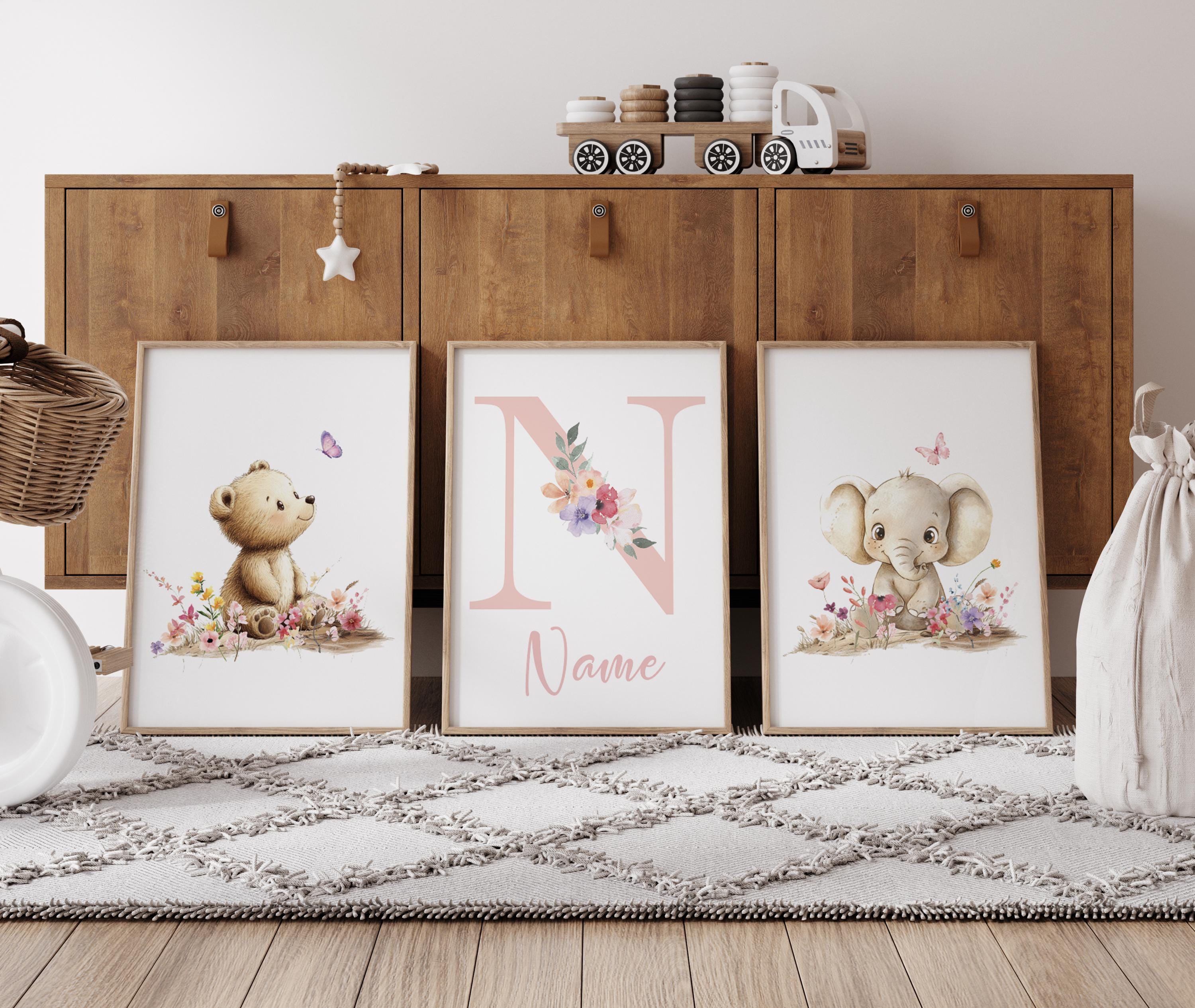 Create a dreamy and personal touch in your little one’s room with this personalized nursery wall art set, featuring a sweet bear, an adorable elephant, and a custom name initial surrounded by delicate watercolor flowers.