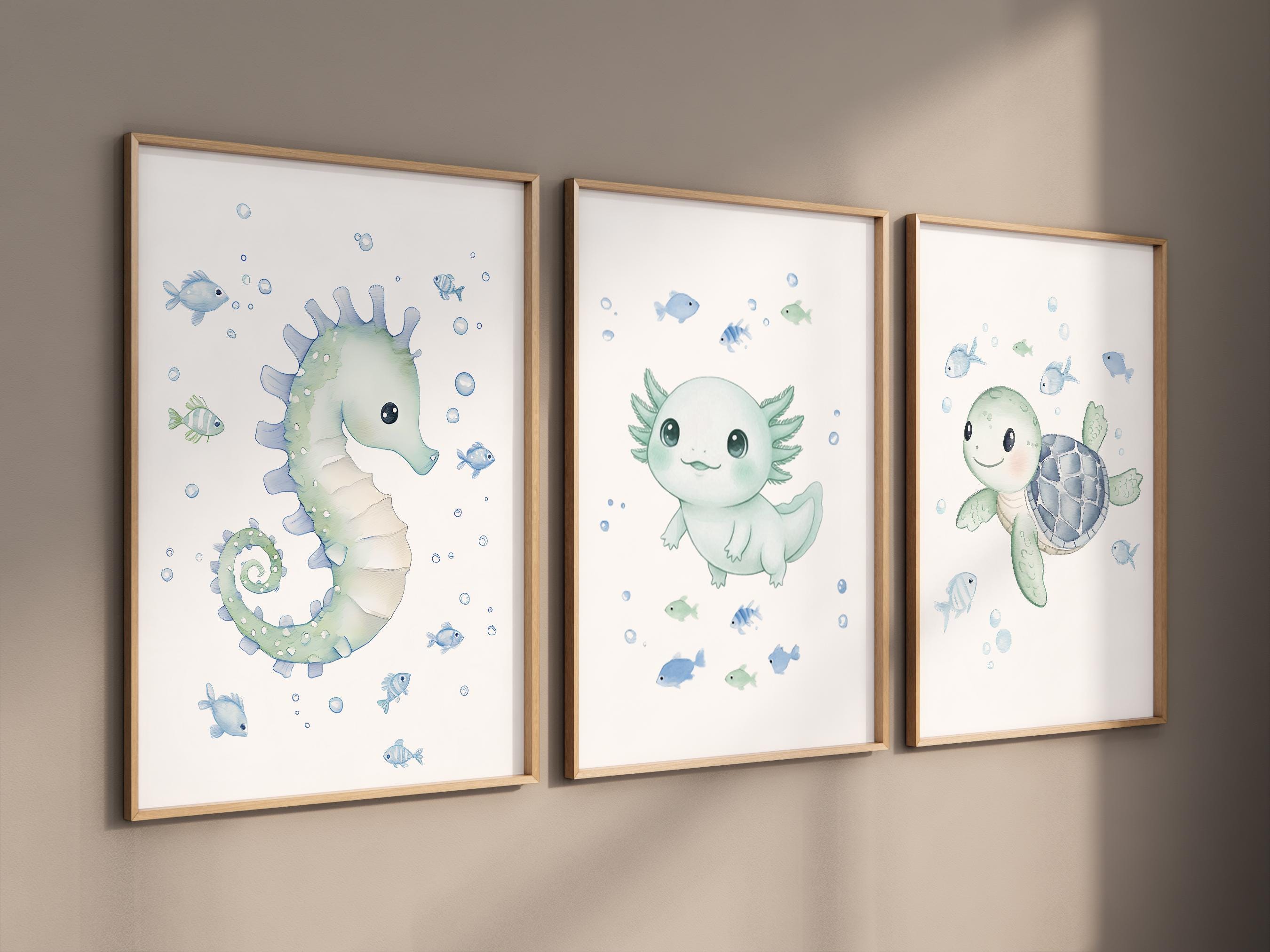 Featuring a gentle seahorse, a smiling axolotl, and a happy sea turtle, these watercolor-style prints add a peaceful coastal charm to any nursery or playroom. Perfect for ocean-themed spaces, beach houses, or baby shower gifts.
