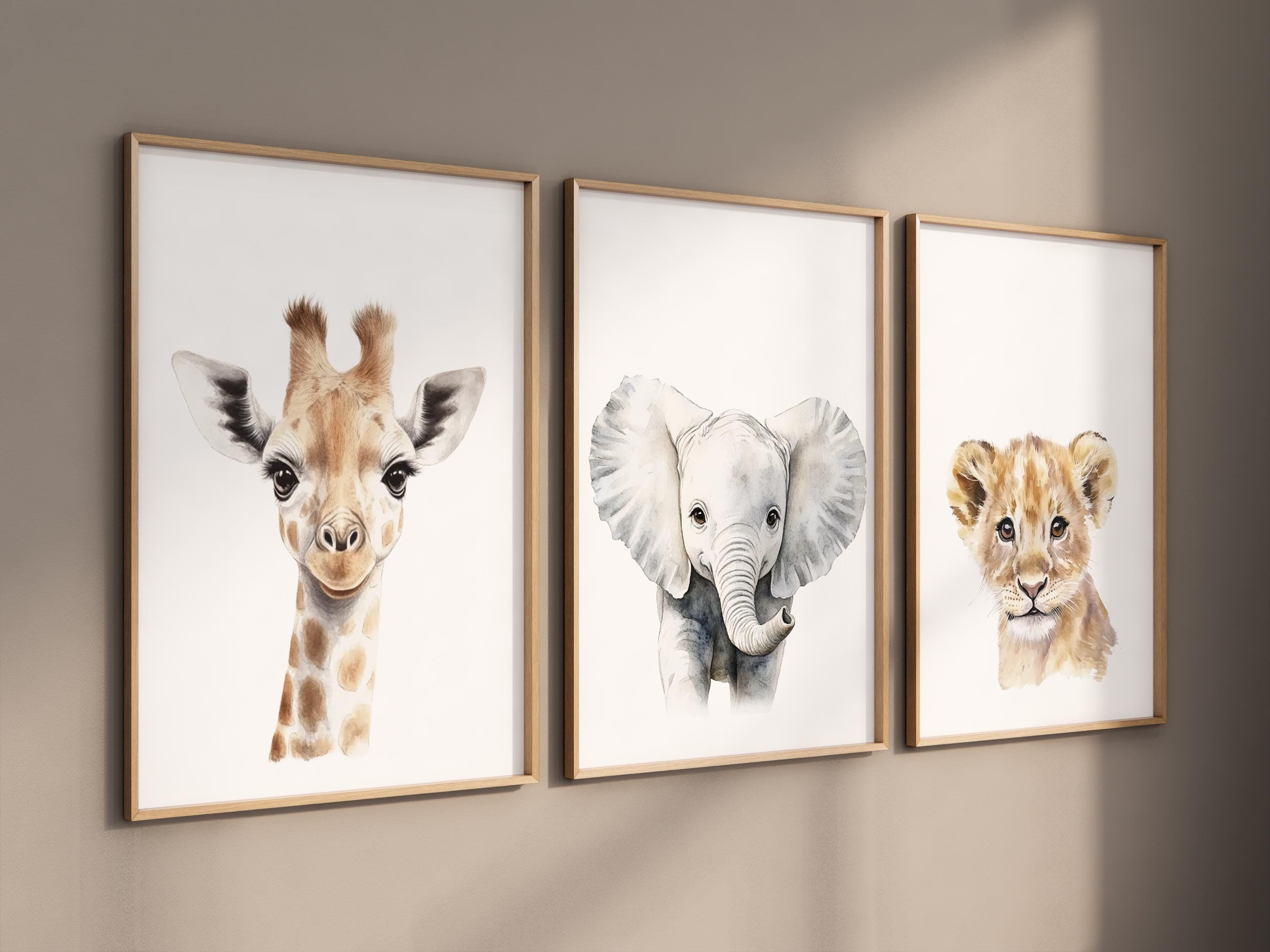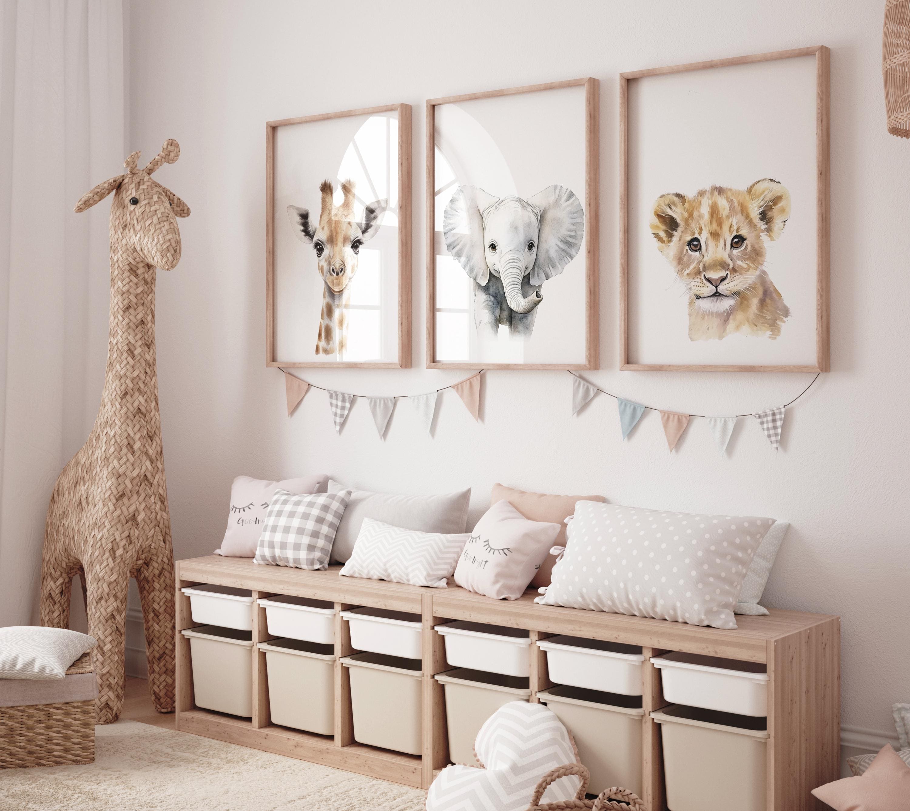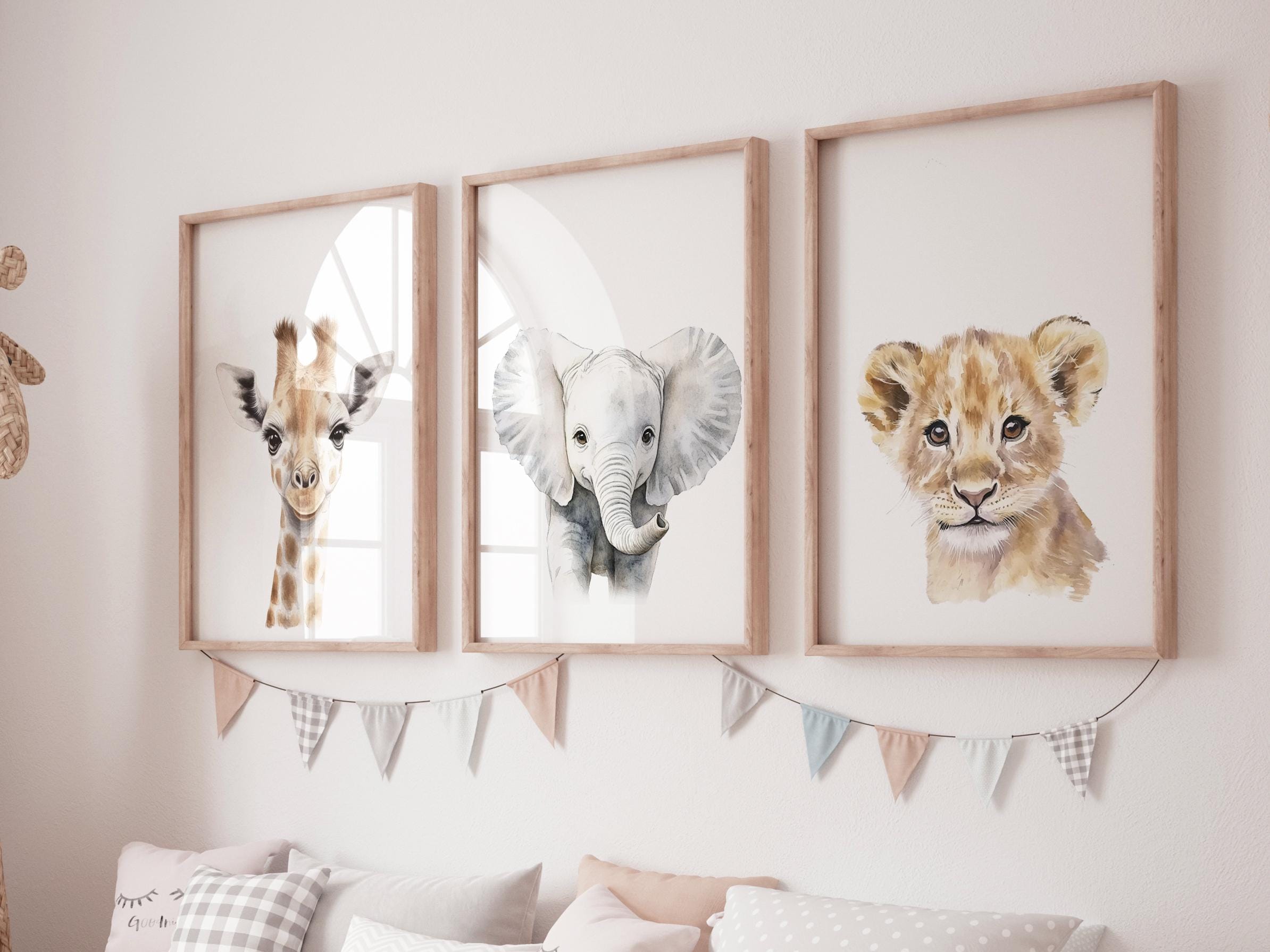Create a warm and playful atmosphere in your little one’s room with this adorable Safari Animal Nursery Wall Art Set. Featuring a sweet giraffe, elephant, and lion cub, these soft watercolor illustrations are perfect for a neutral, jungle or safari-themed nursery.