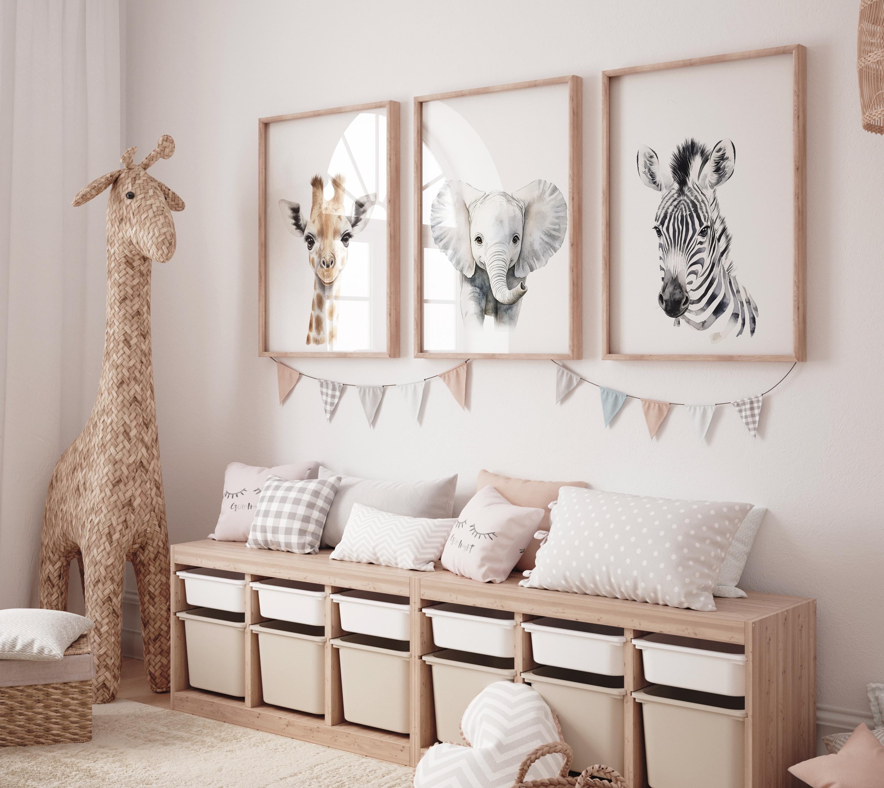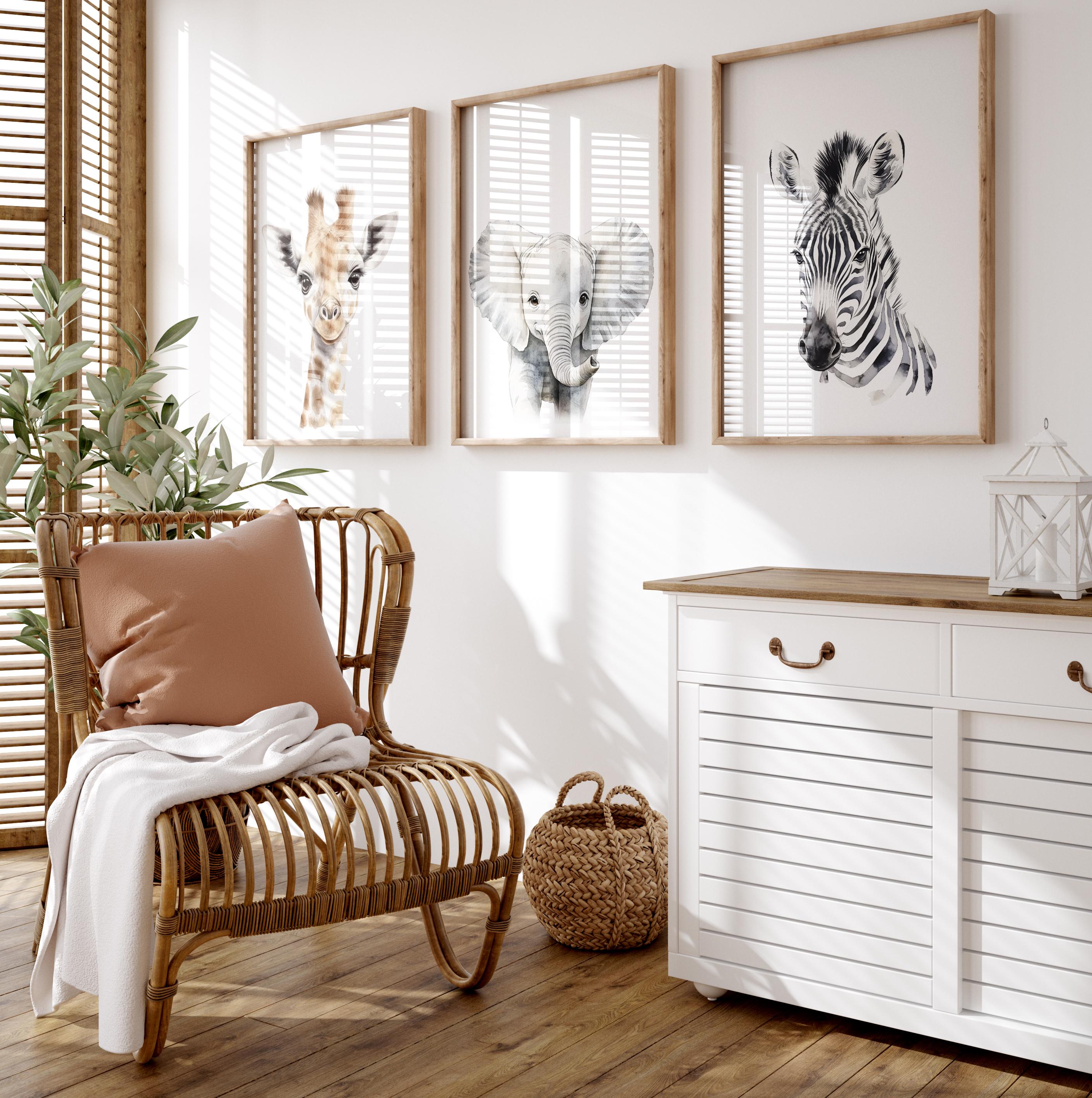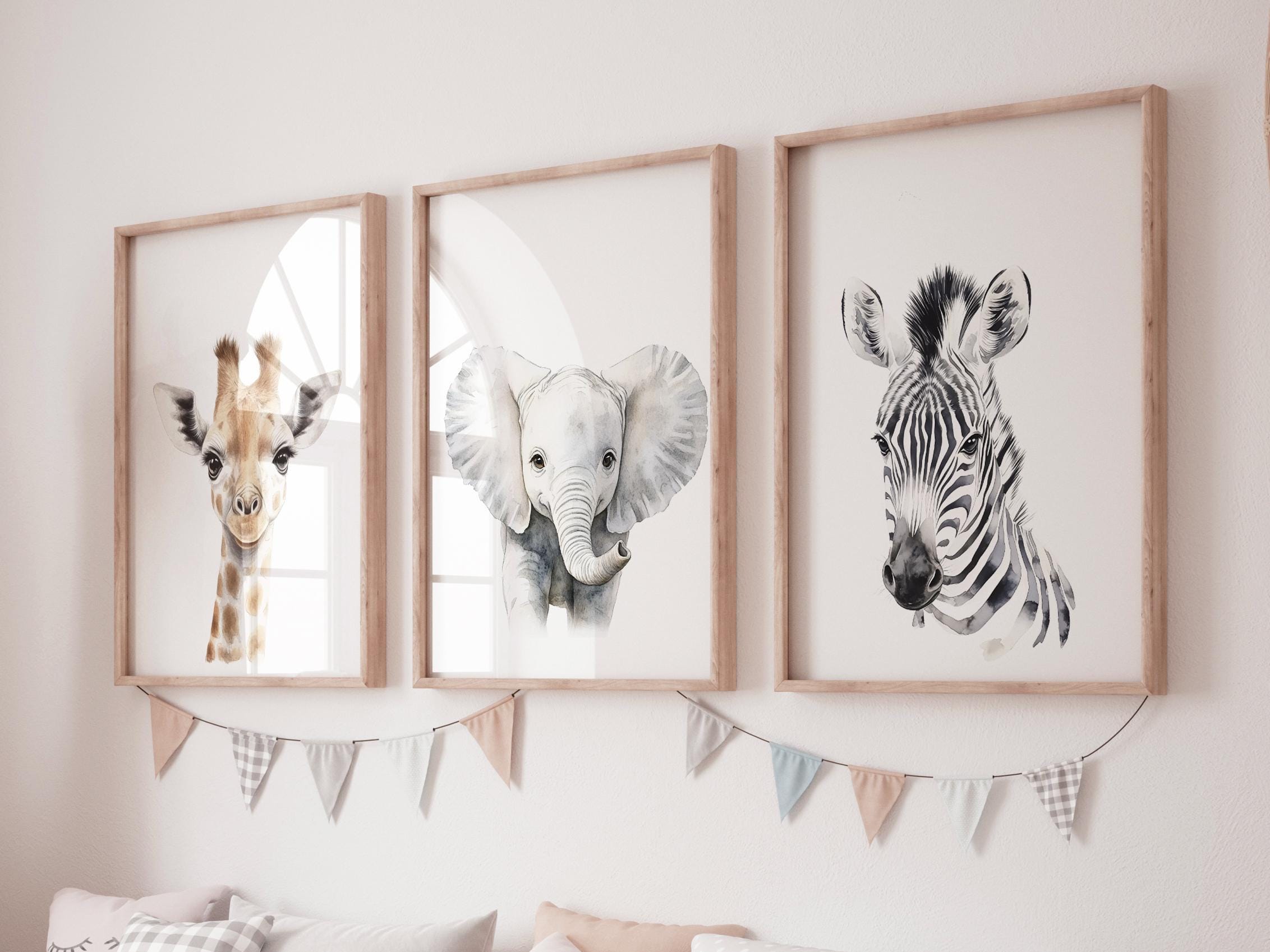 Featuring a sweet giraffe, elephant, and zebra, painted in soft watercolor tones and framed by gentle neutrals — perfect for a modern, boho, or Scandinavian-inspired nursery.