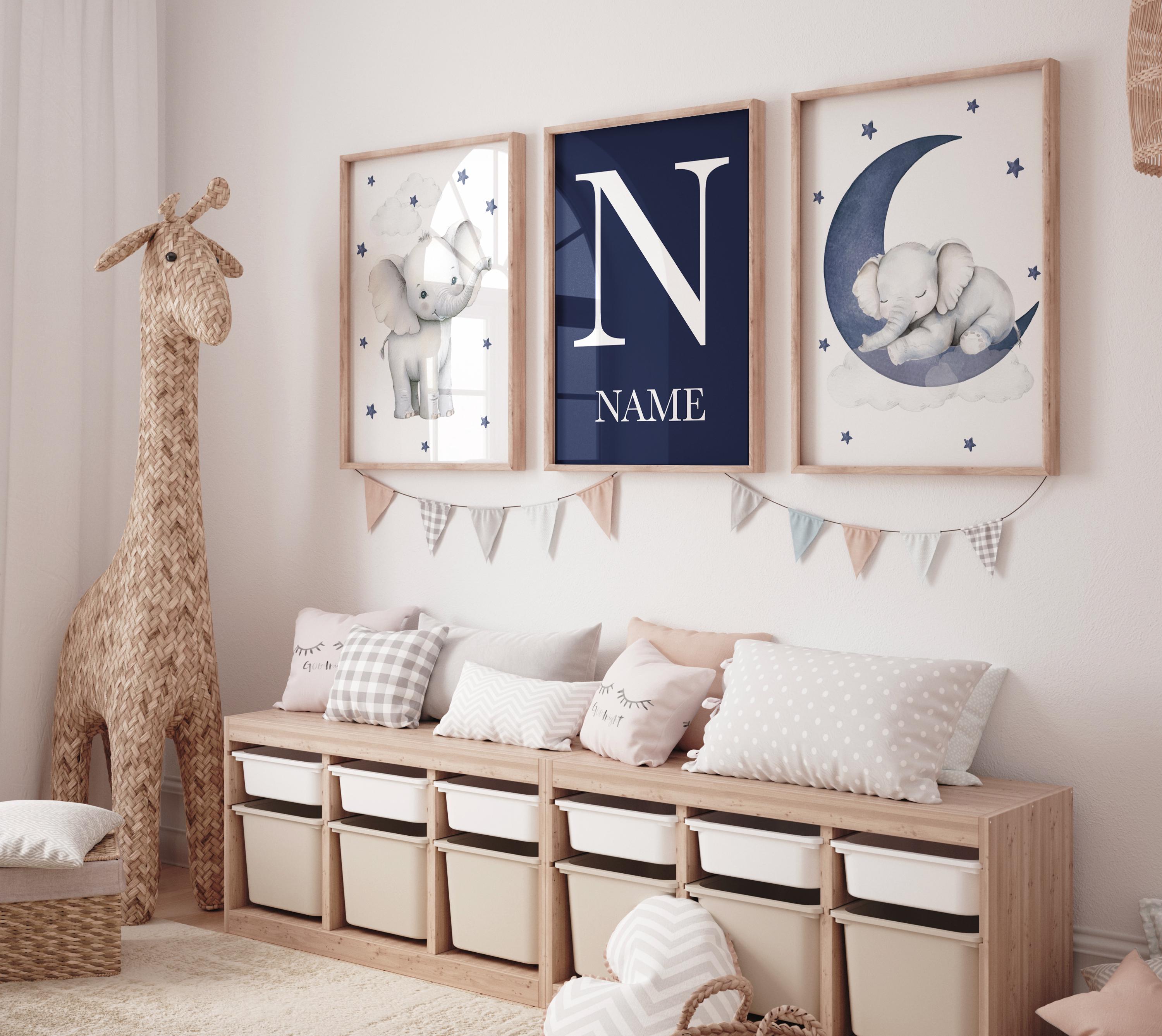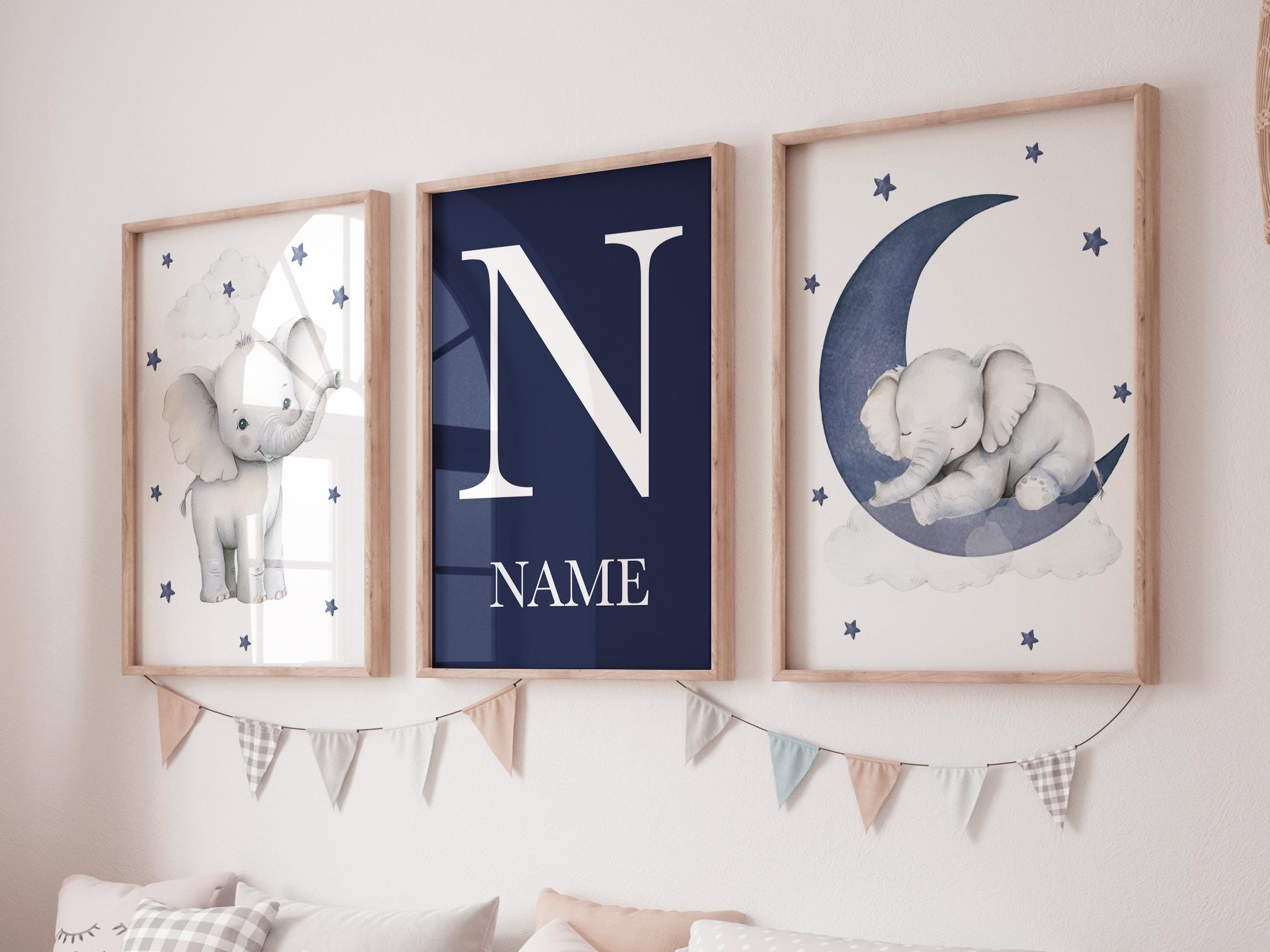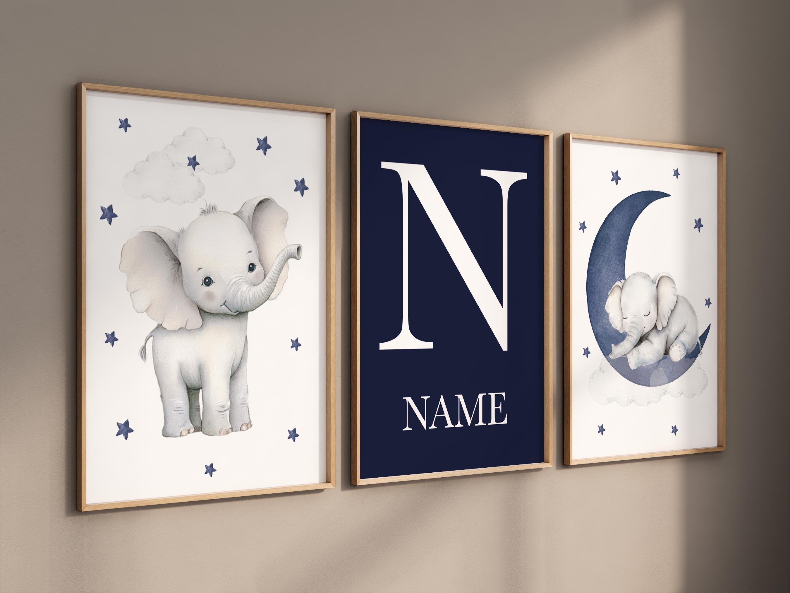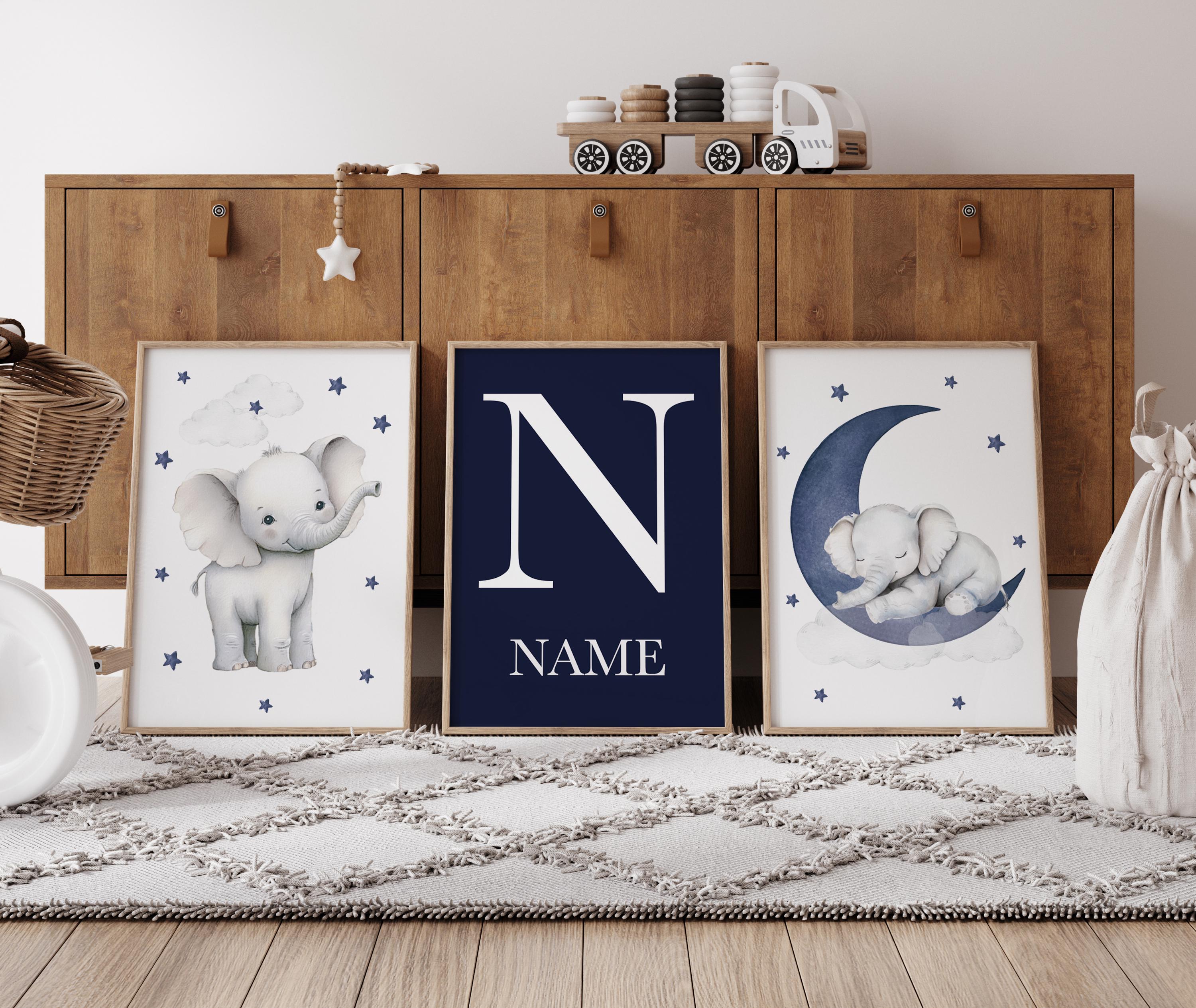 Nursery decor boy, elephant nursery, navy nursery decor, boy nursery wall art, moon and stars, navy blue nursery wall decor, name nursery