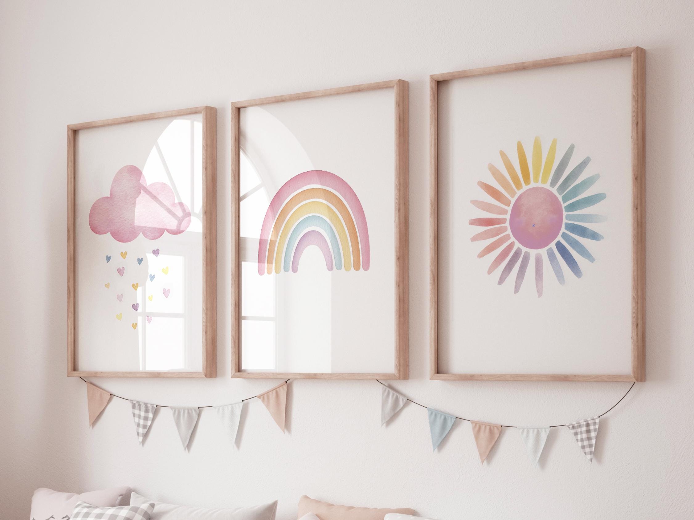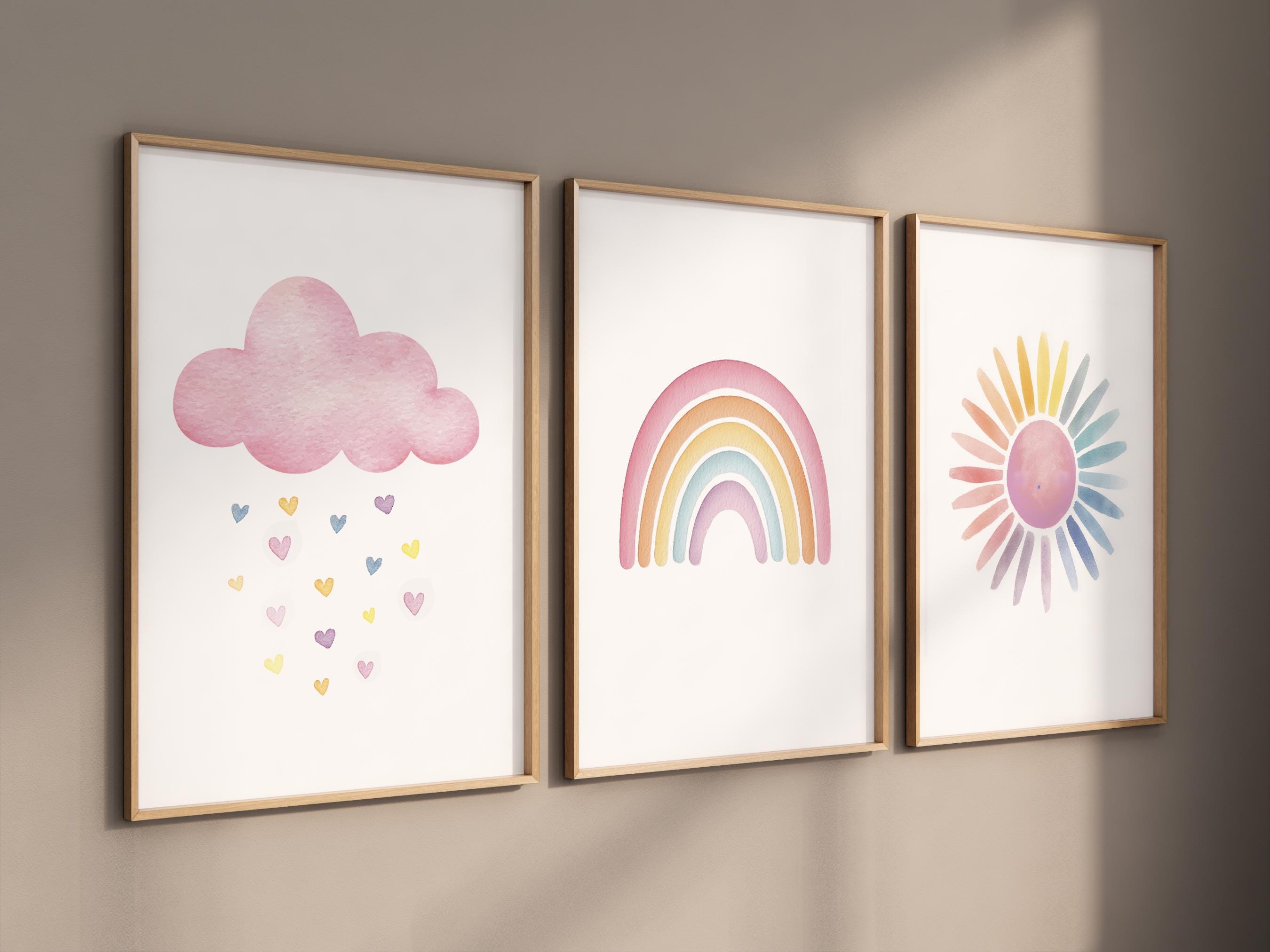 Transform your little one’s room with this soft and cheerful 3-piece watercolor nursery wall art set featuring a pink cloud, pastel rainbow, and sunshine. Designed in warm pastel tones, these prints create a calm, happy, and modern atmosphere—perfect for a baby girl’s nursery, toddler room, or playroom.