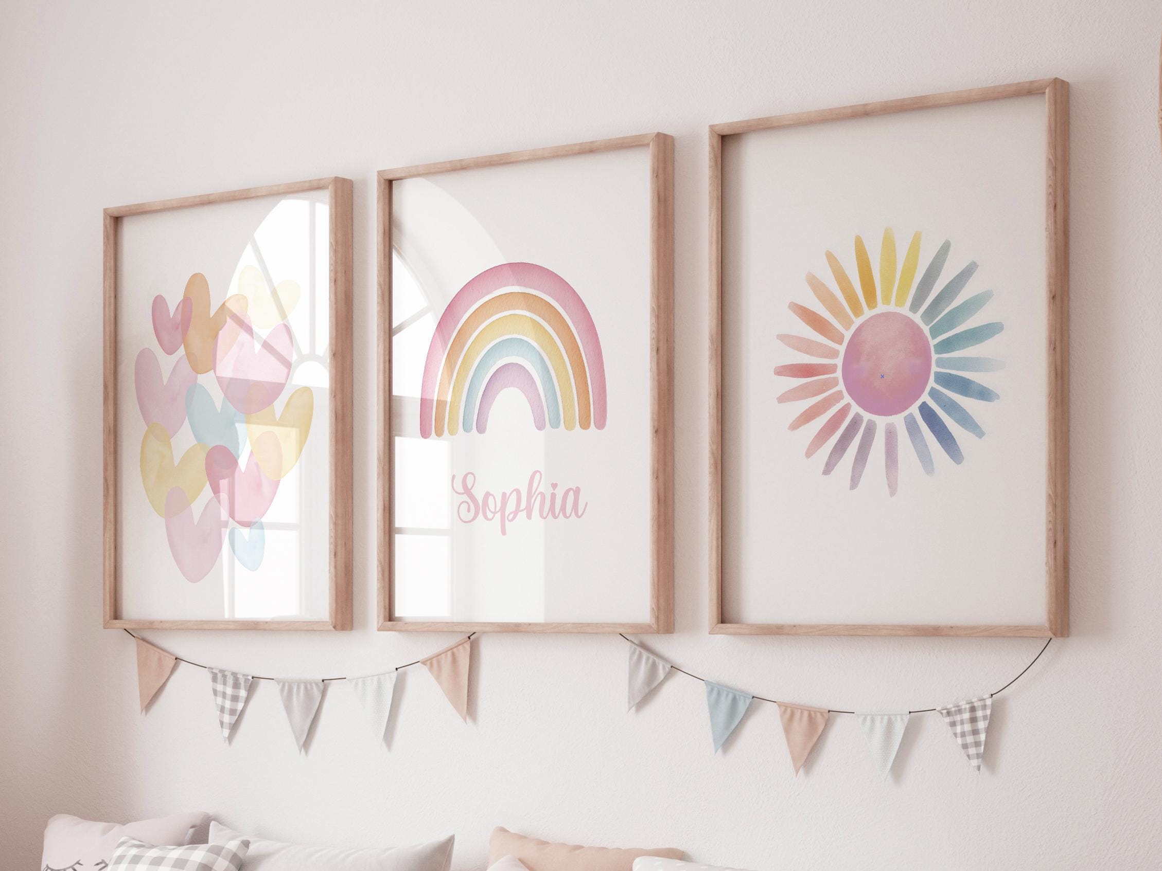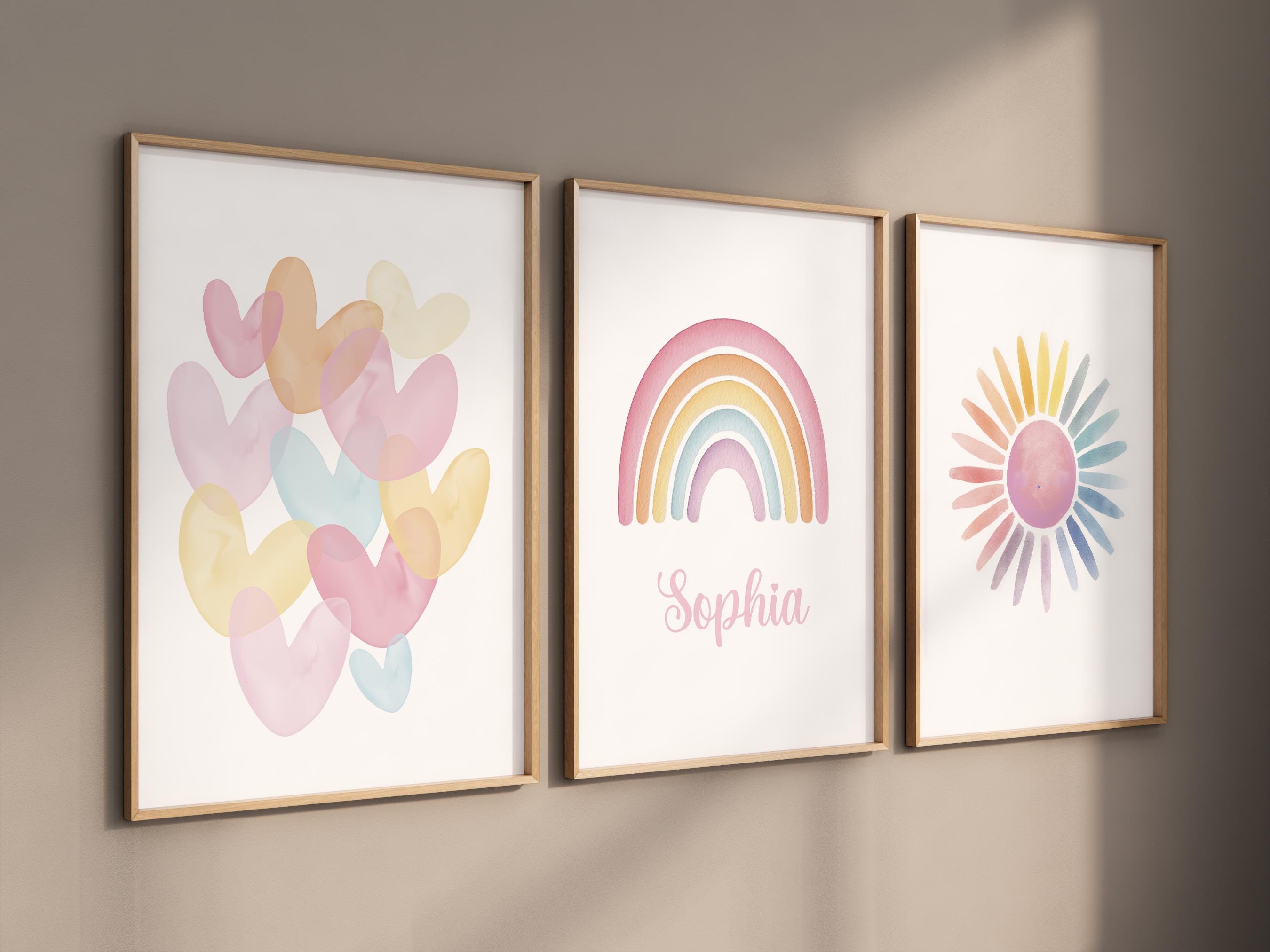 Create the sweetest, most welcoming nursery with this personalized 3-piece wall art set, featuring soft watercolor hearts, a customizable rainbow name print, and a cheerful sun. Designed in gentle pastel tones, this set brings warmth, joy, and a dreamy feel to any baby girl’s room.