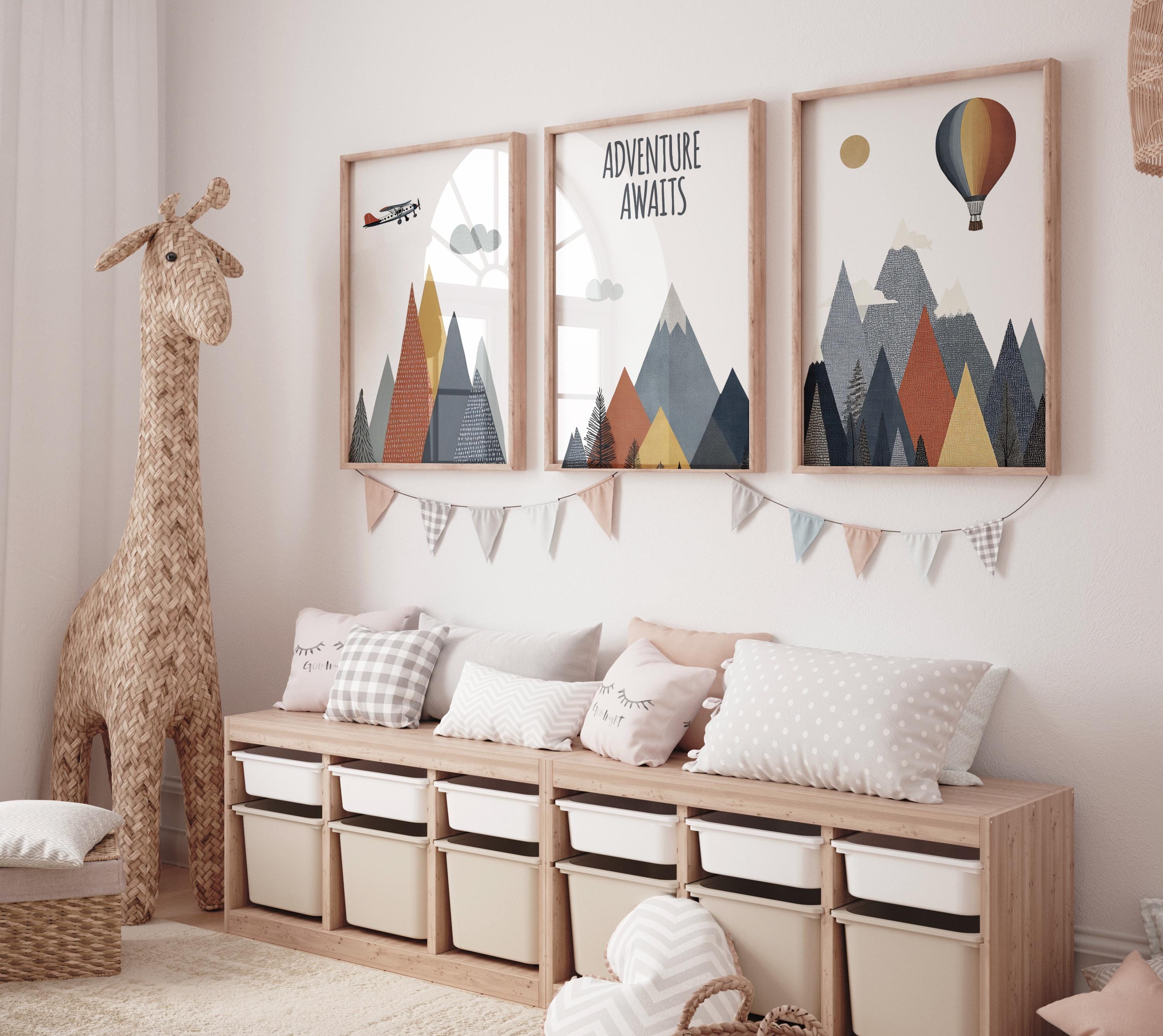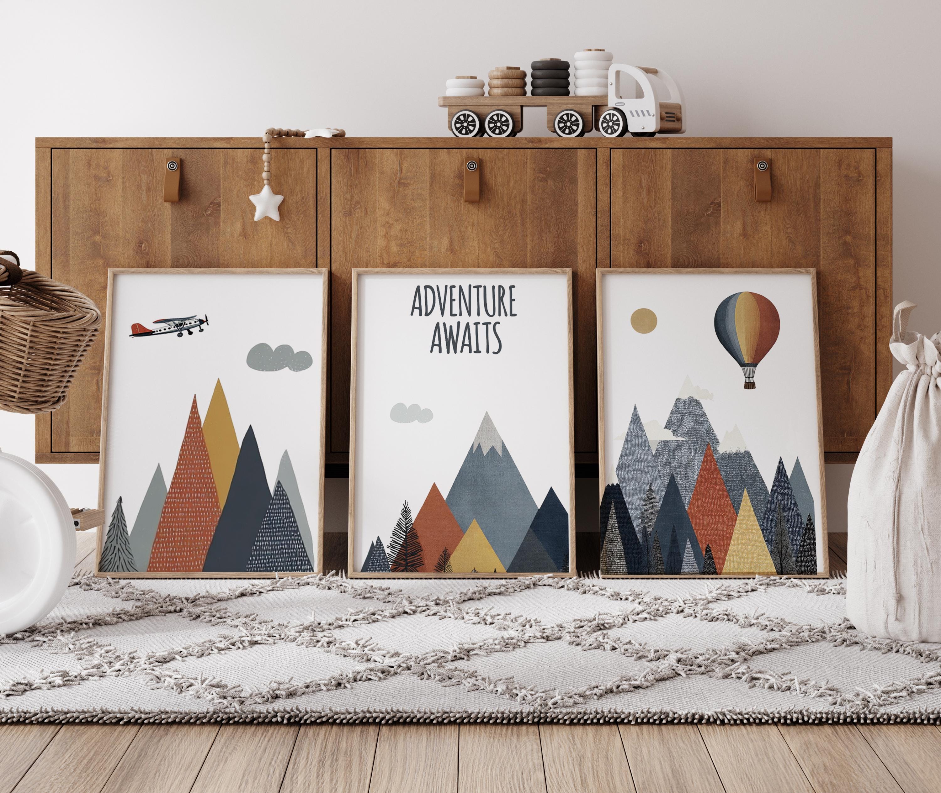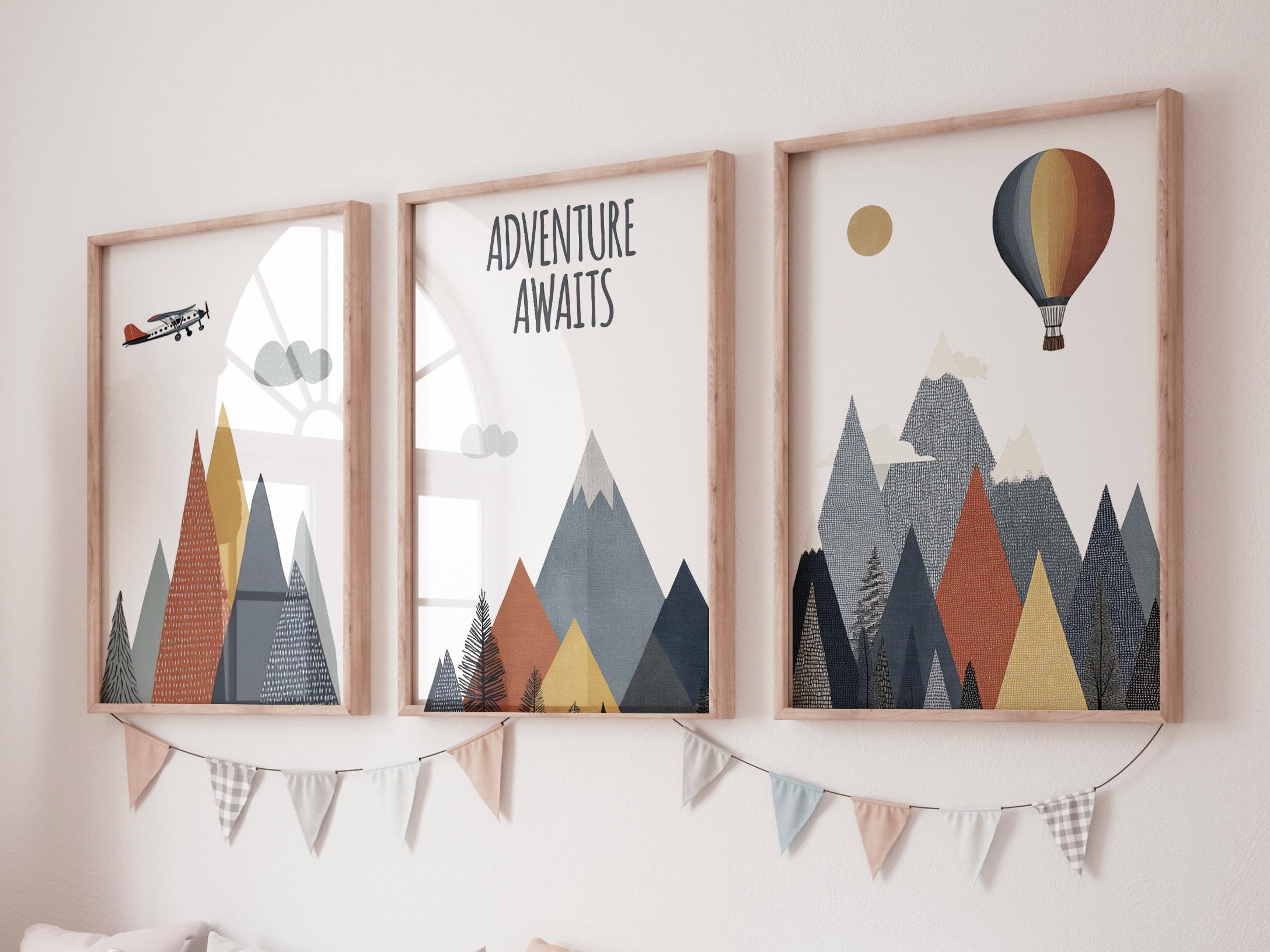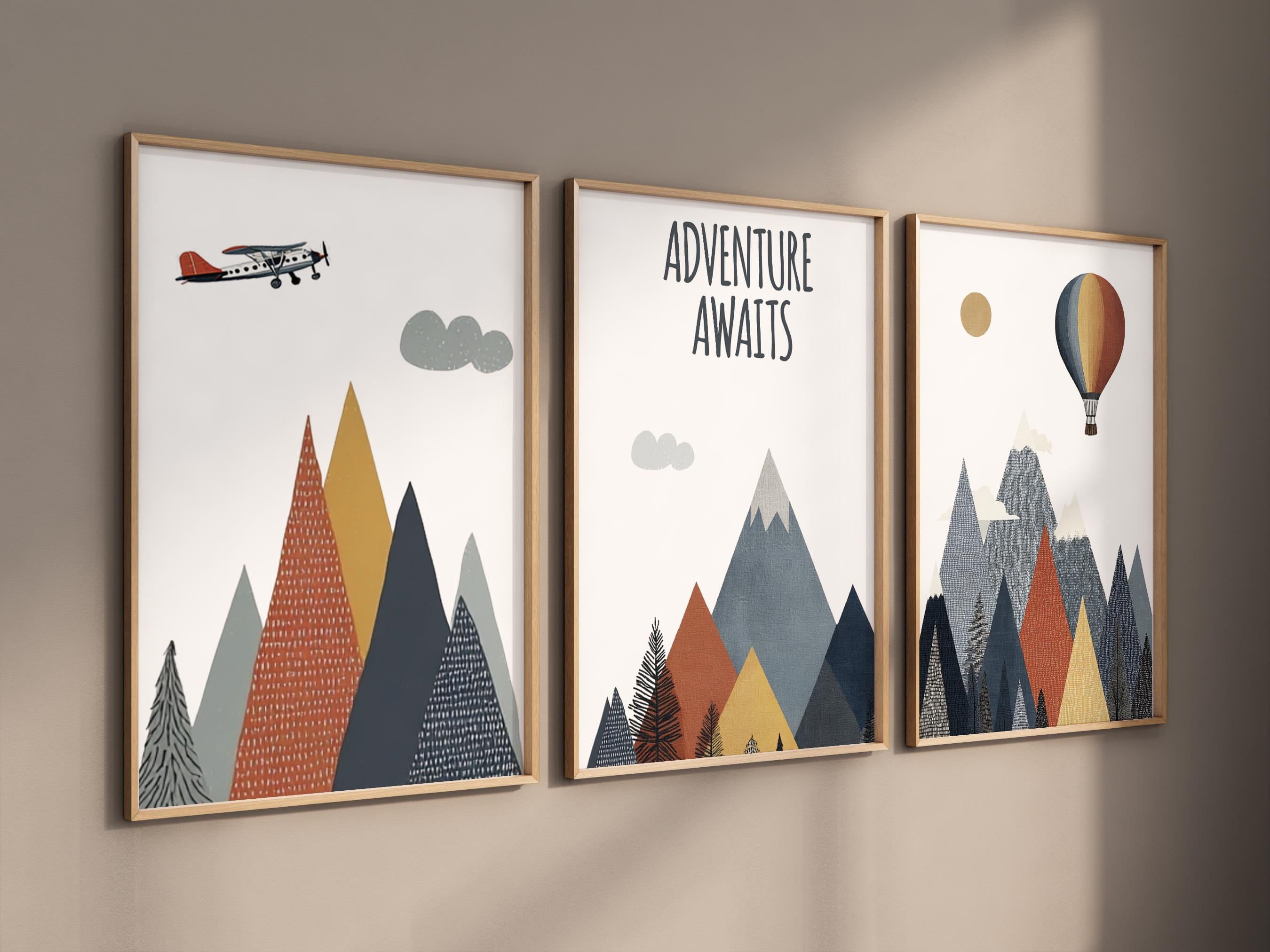 Bring a sense of wonder and exploration to your little one’s space with this Adventure Awaits nursery wall art set. Featuring soft mountains, a playful airplane, and a dreamy hot air balloon, this trio creates a calm yet adventurous atmosphere—perfect for baby boys, toddlers, or gender-neutral nurseries.