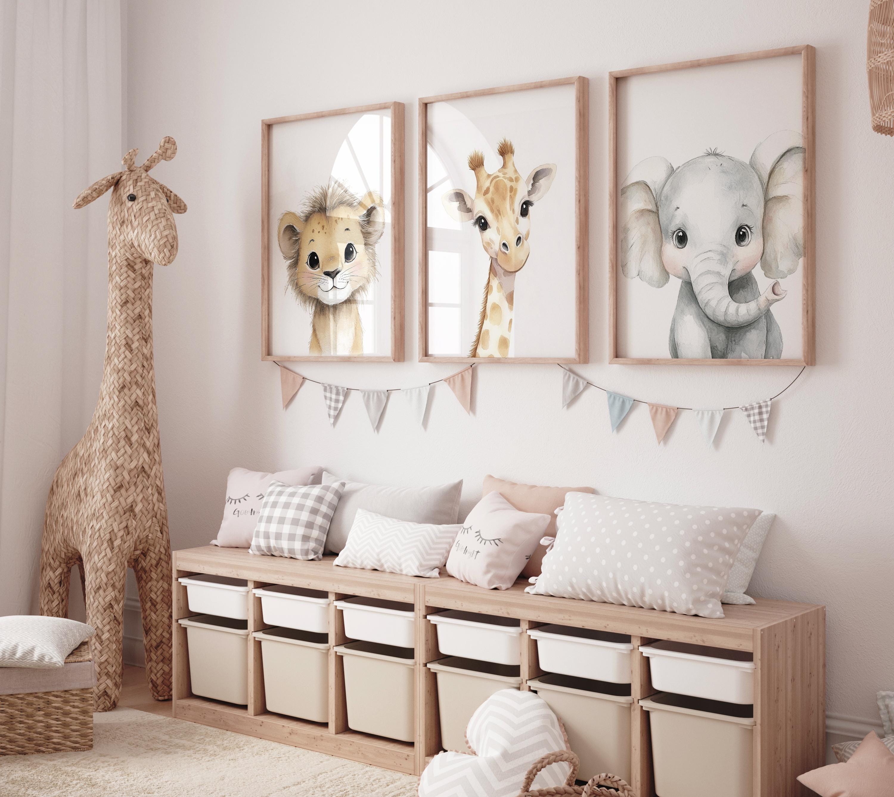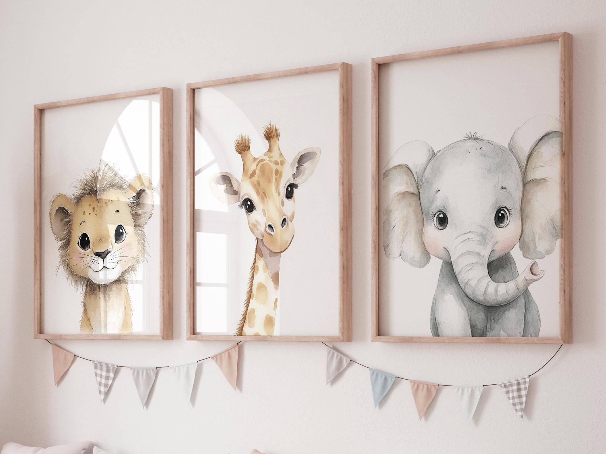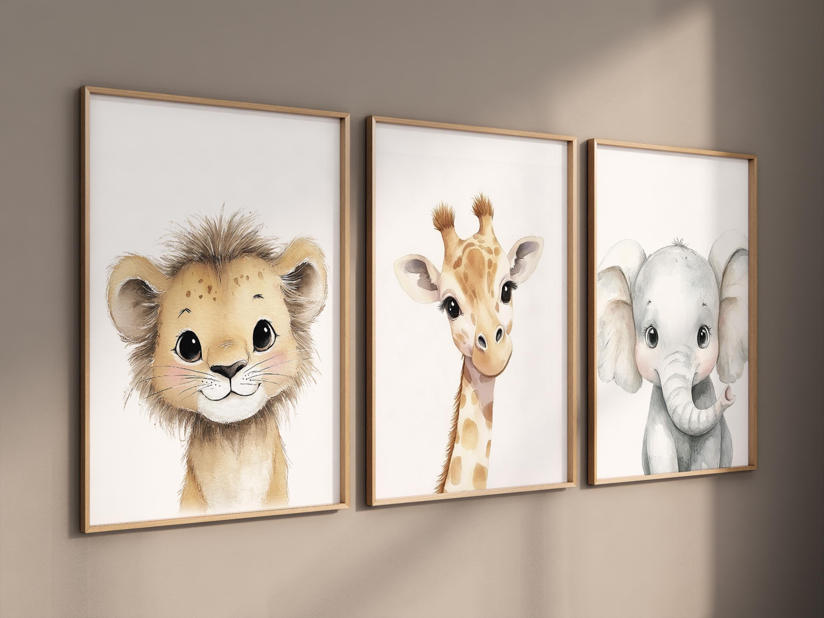 ring charm and warmth to your nursery with this neutral safari animal wall art set featuring a lion, giraffe, and elephant in soft watercolor tones. Perfect for jungle-themed nurseries, this trio adds a playful and calming touch to baby boy, girl, or gender-neutral rooms.