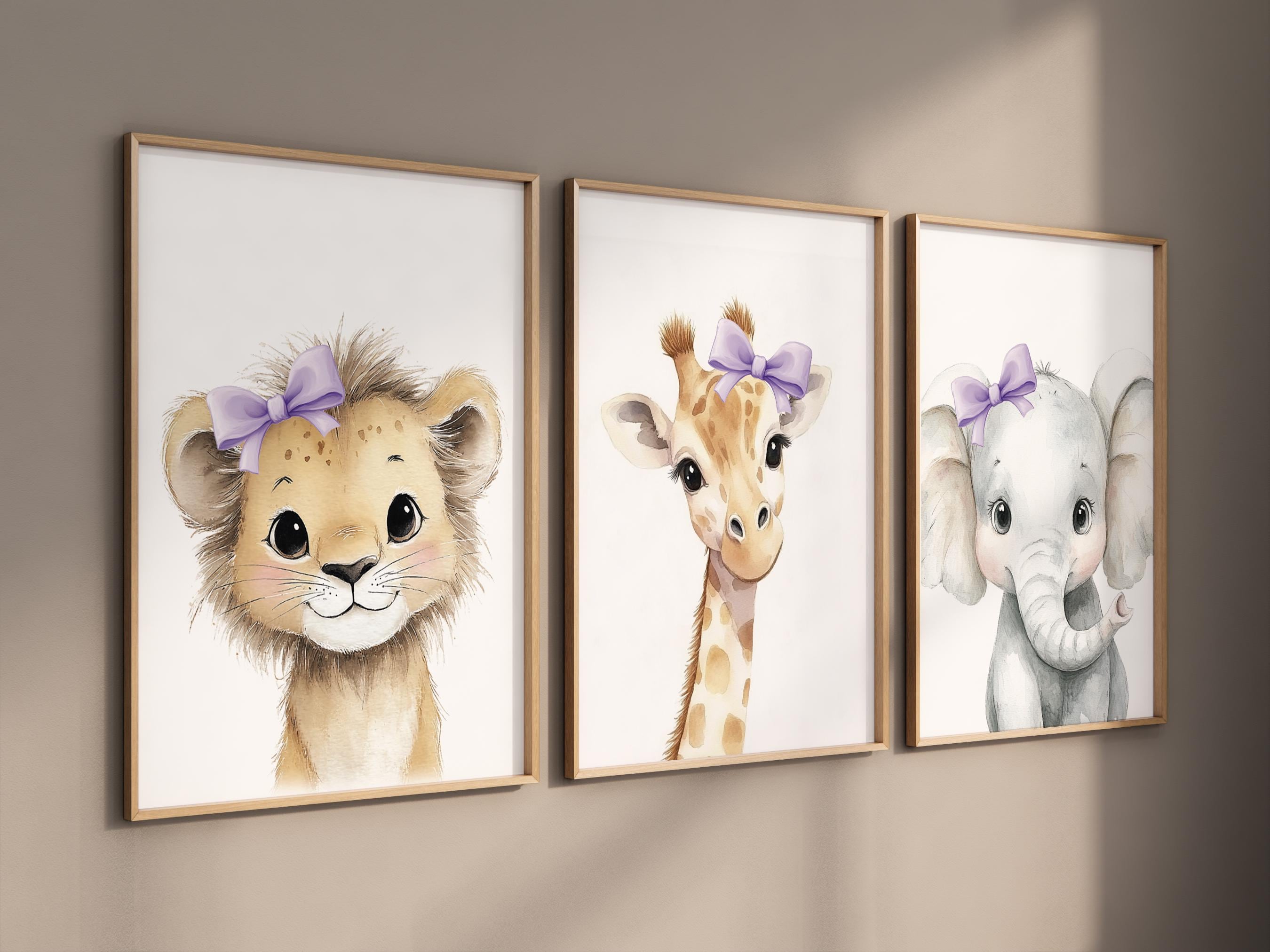 Add a calm and elegant touch to your baby girl’s nursery with this safari animal wall art set, featuring a sweet elephant, giraffe, and lion illustrated in soft neutral tones with delicate purple bows. The muted beige and lavender palette creates a cozy, timeless look that works beautifully in modern, boho, or Scandinavian-style nurseries.