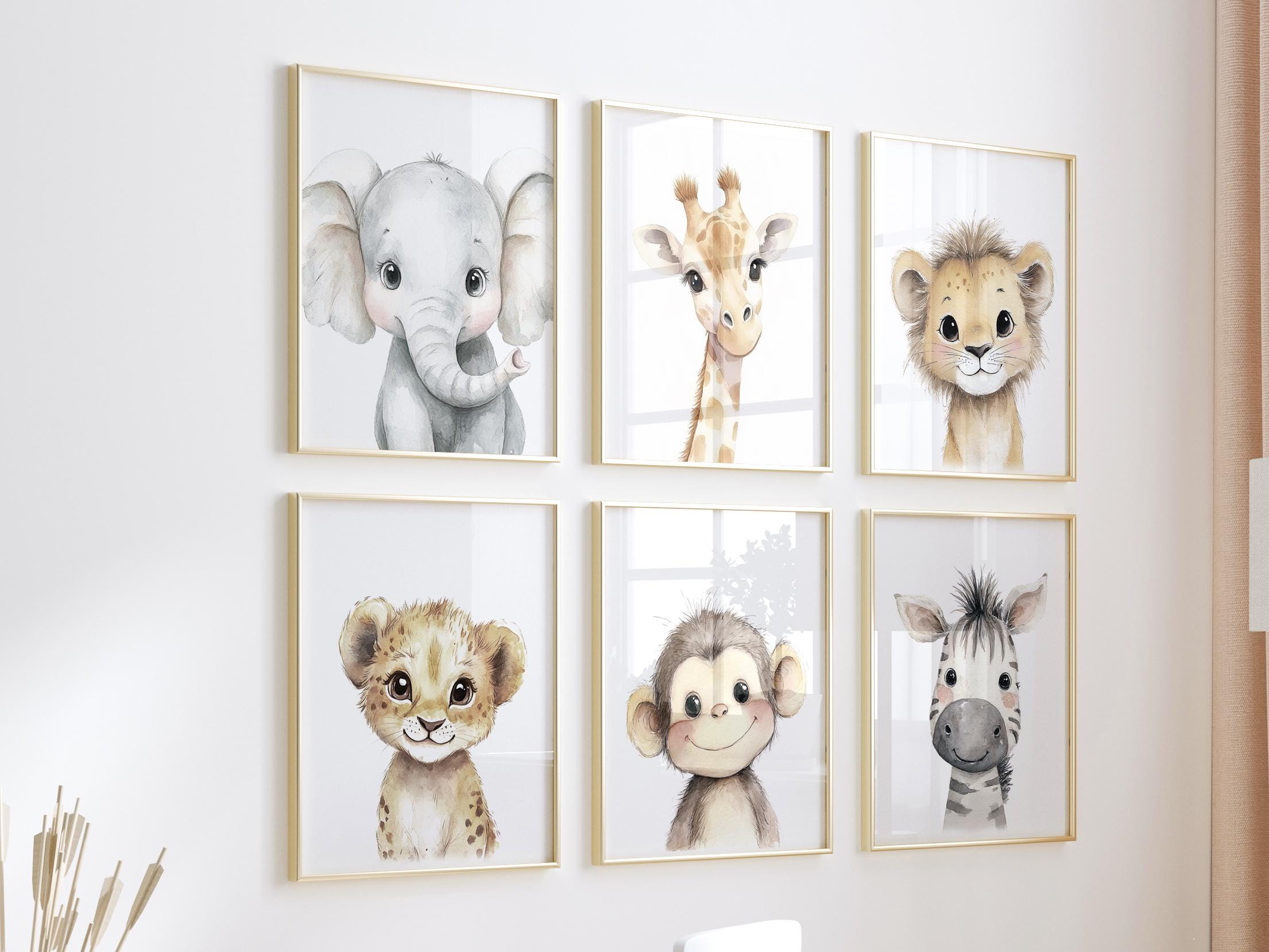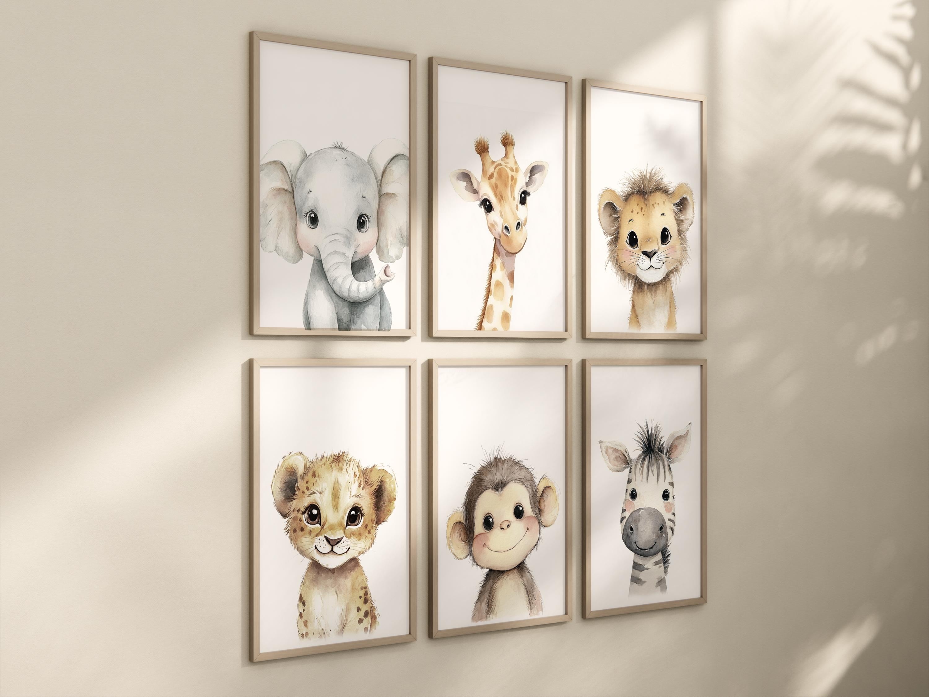 This charming safari animal wall art set features six watercolor jungle animals—lion, giraffe, elephant, tiger, monkey, and zebra—perfect for creating a playful and gender-neutral nursery. With soft beige tones and sweet expressions, these prints bring warmth and whimsy to any baby room or toddler space.