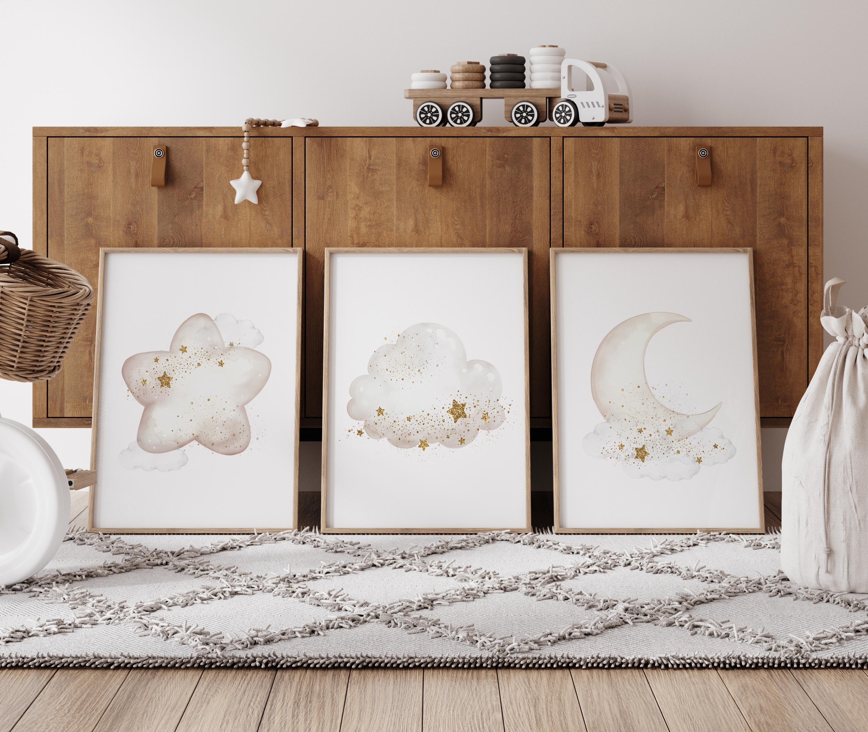Create a peaceful and dreamy nursery with this neutral moon nursery wall art set of 3. Featuring soft watercolor illustrations of a moon, cloud, and star with delicate gold accents, this set is designed to bring a sense of calm, warmth, and wonder to your baby’s space.