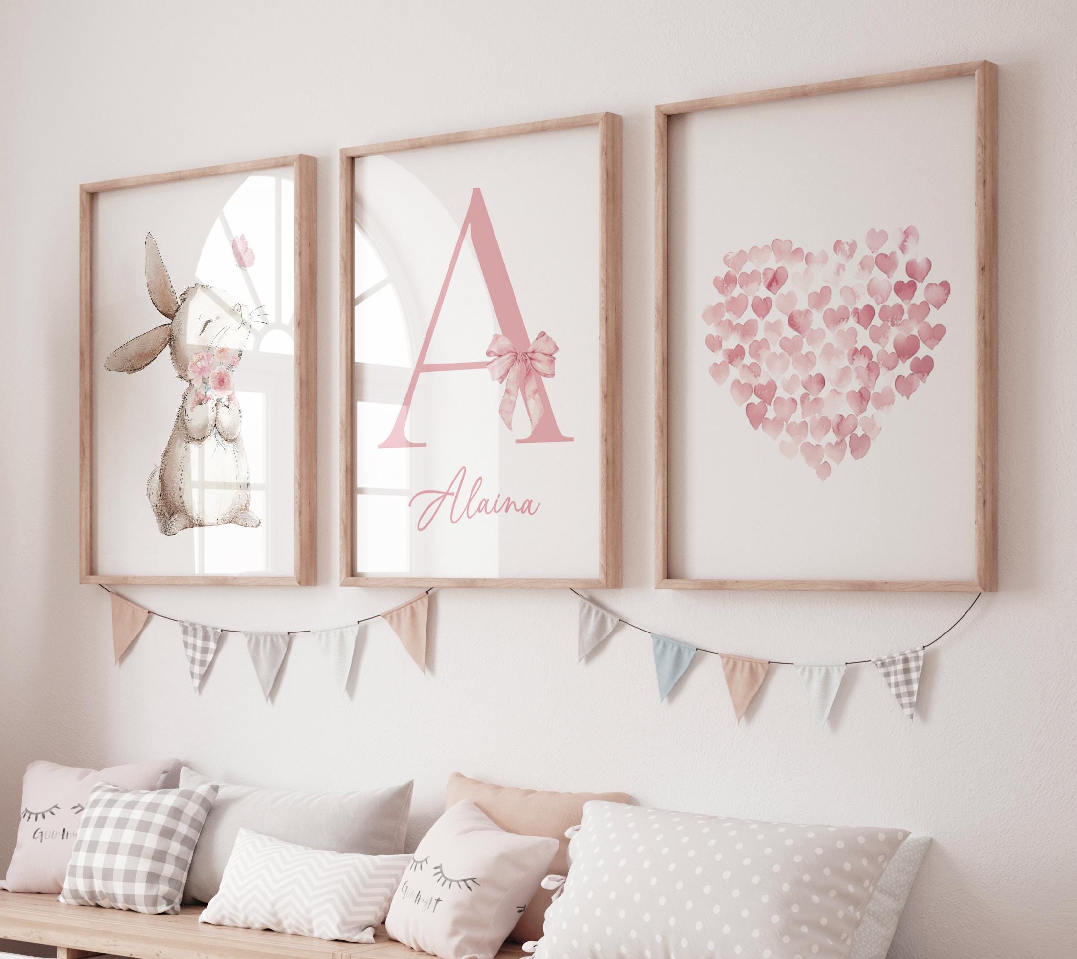 This charming personalized nursery wall art set features a sweet bunny illustration, a custom initial with your child’s name, and a soft pink heart print made of delicate watercolor hearts. Designed in gentle blush tones, this set is perfect for a girl’s nursery, baby room, or floral woodland theme.