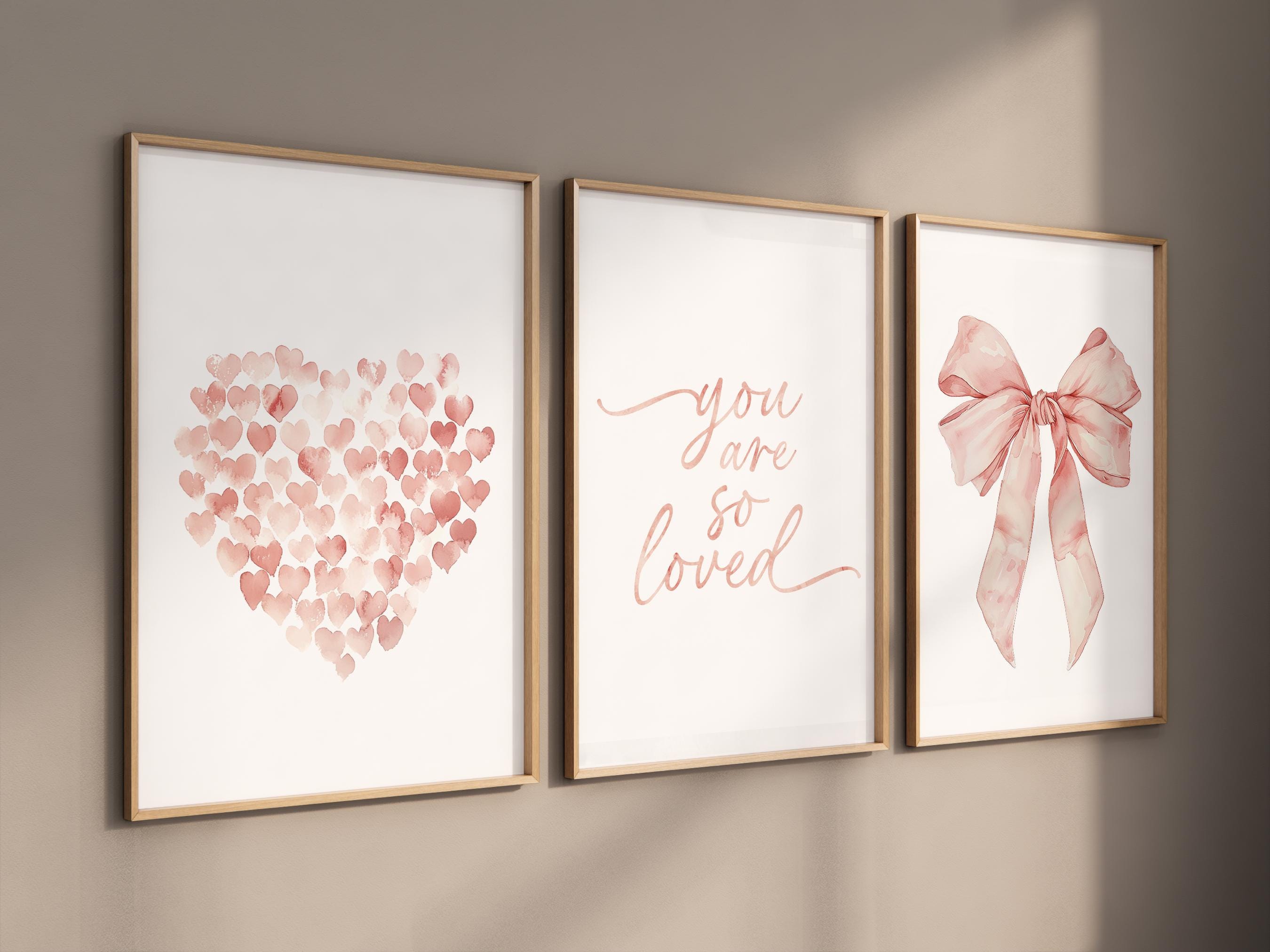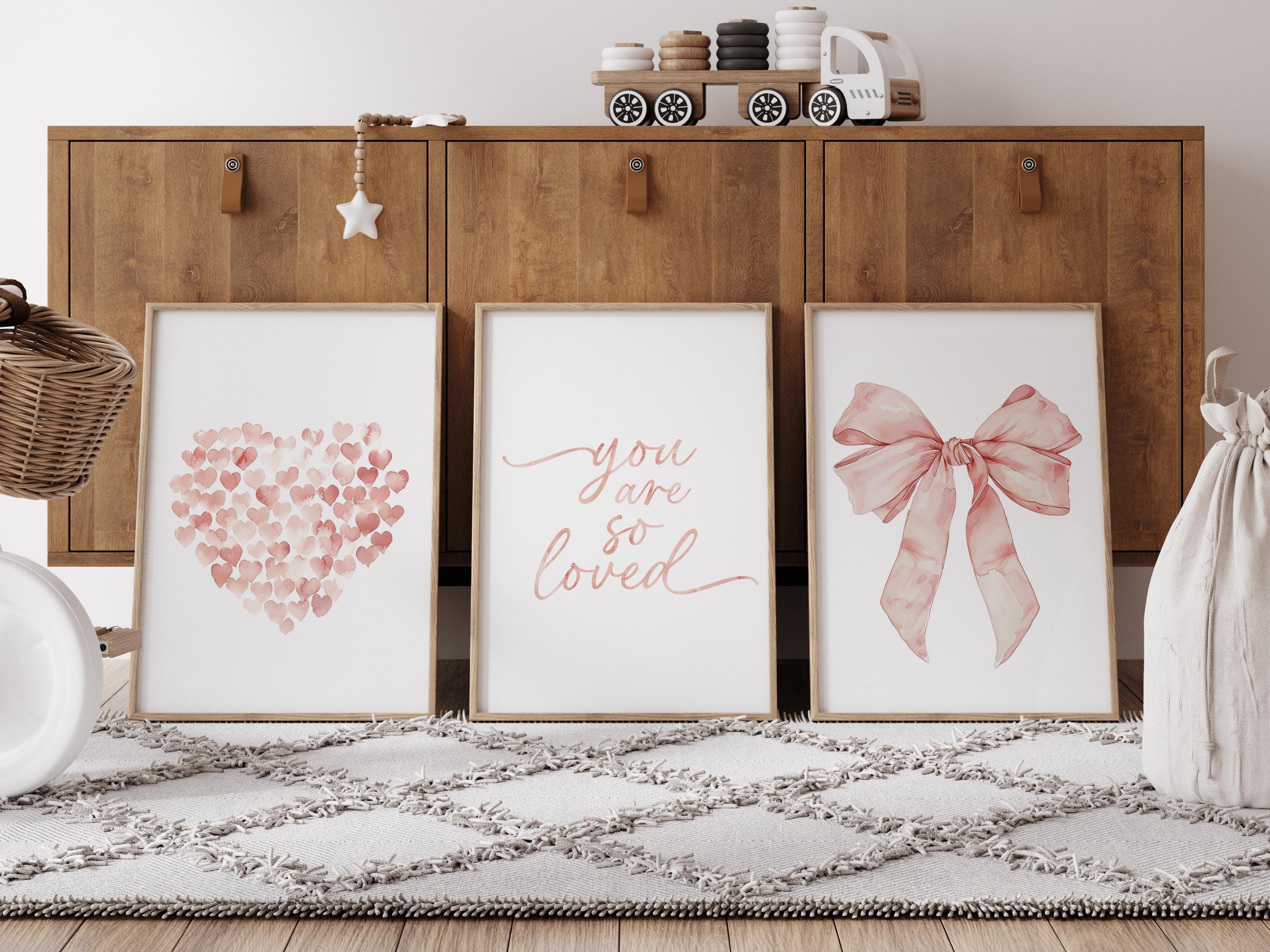 Add warmth and sweetness to your baby girl’s nursery with this elegant set of 3 wall art prints. Featuring a watercolor heart made of soft pink-peach hearts, a matching “You Are So Loved” quote, and a beautiful bow illustration—this set creates a delicate and loving atmosphere in any baby room.