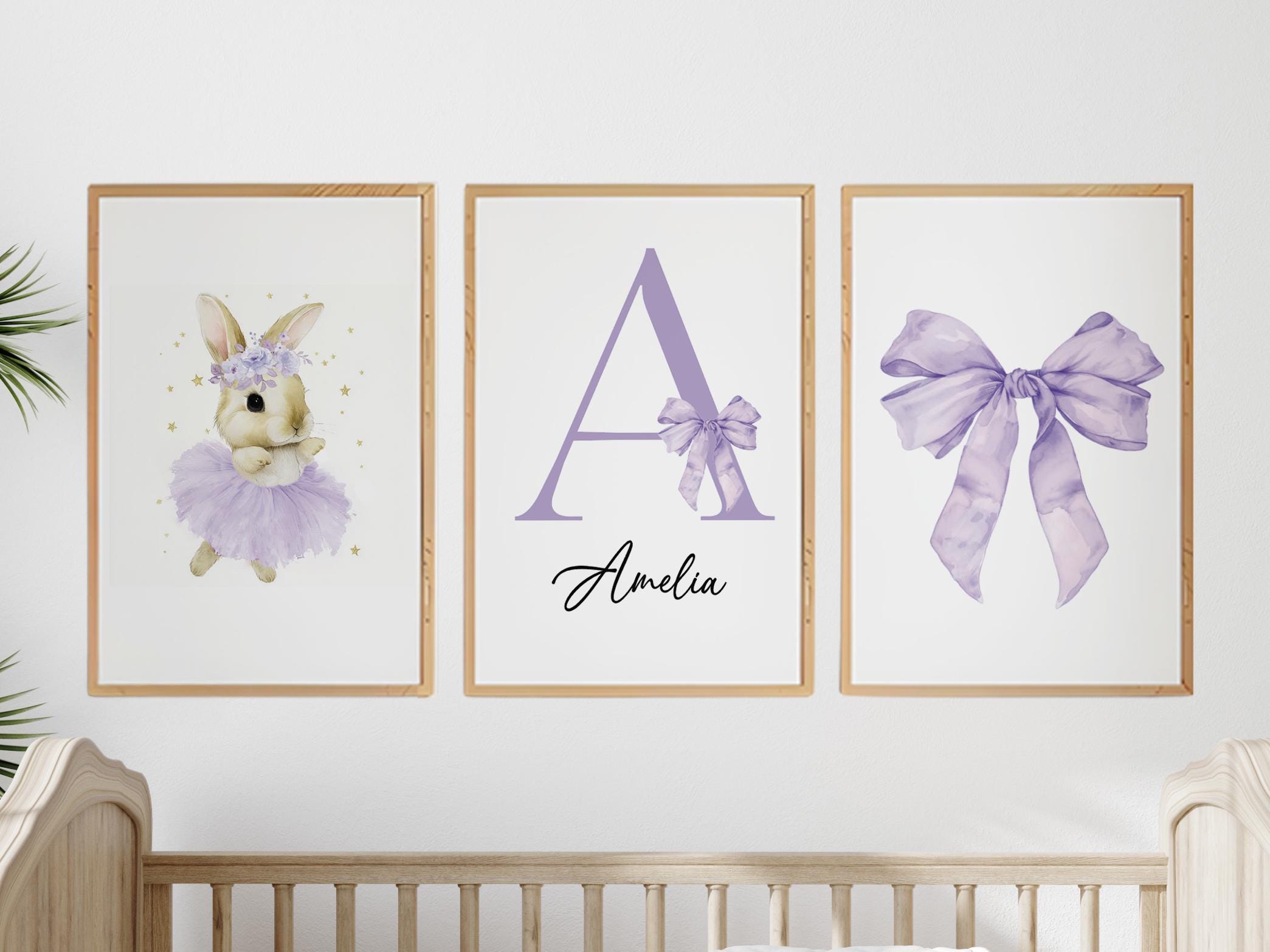 Make your little girl’s room feel magical with this adorable personalized purple nursery wall art set. Featuring a sweet ballerina bunny in a lavender tutu, a custom initial + name print, and a matching watercolor bow, this coordinated set brings soft charm and elegance to any nursery or toddler room.