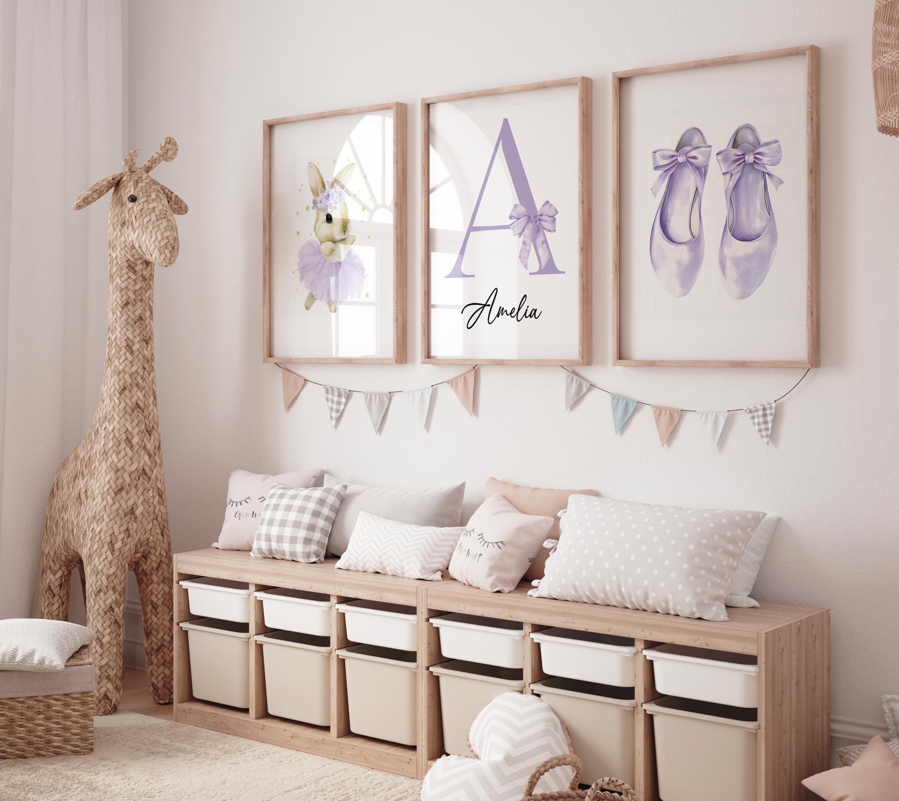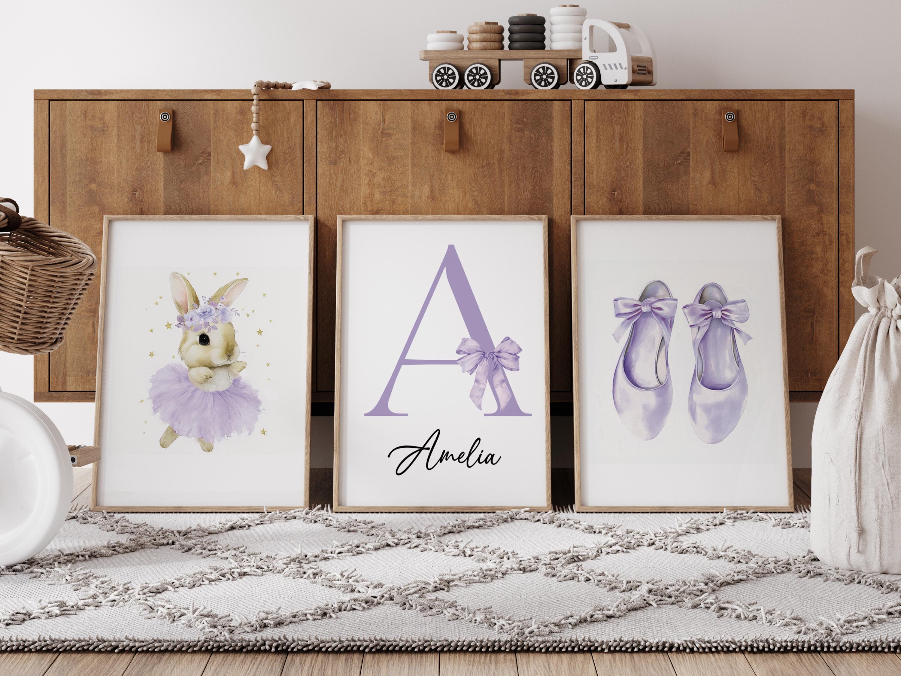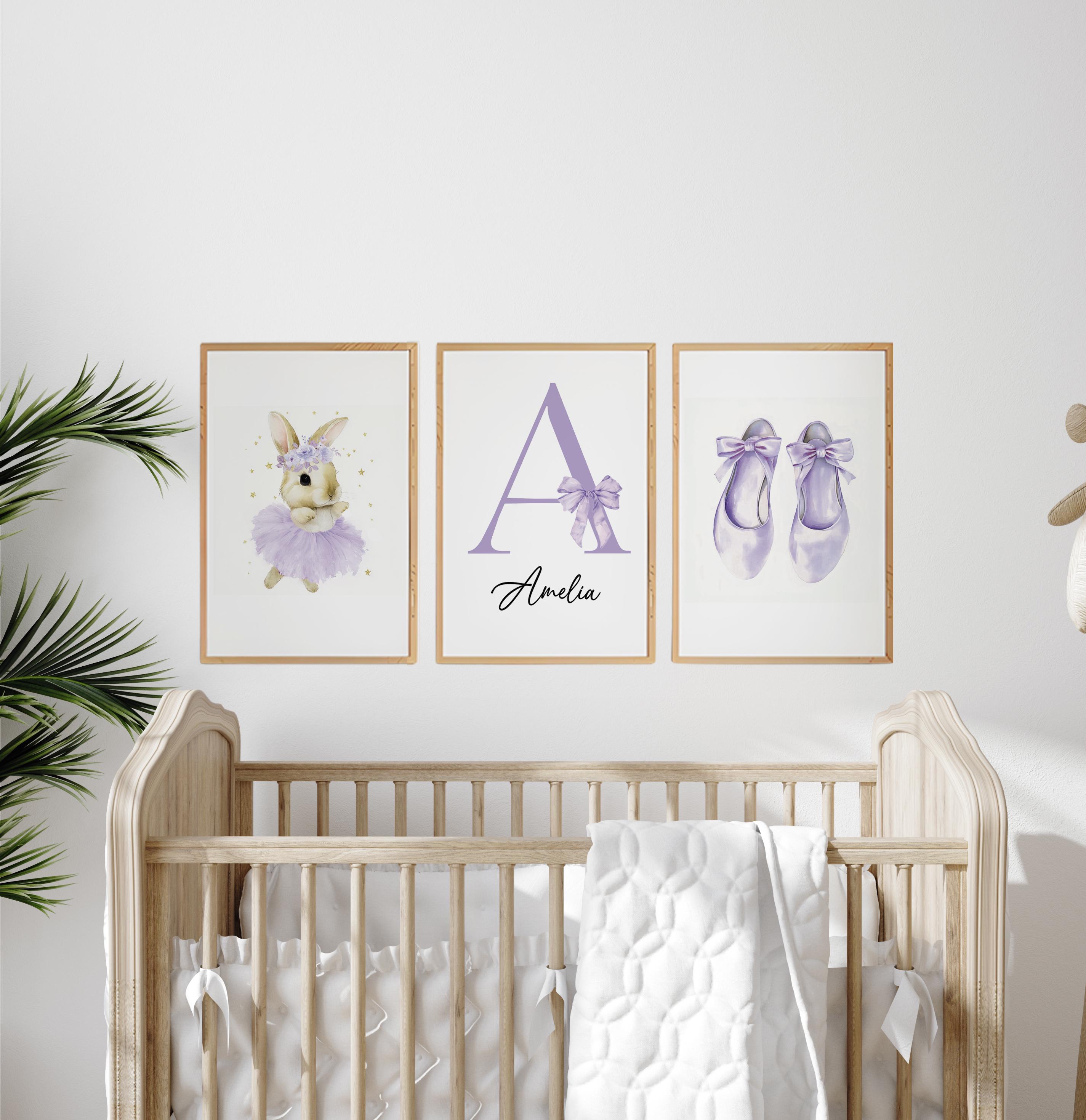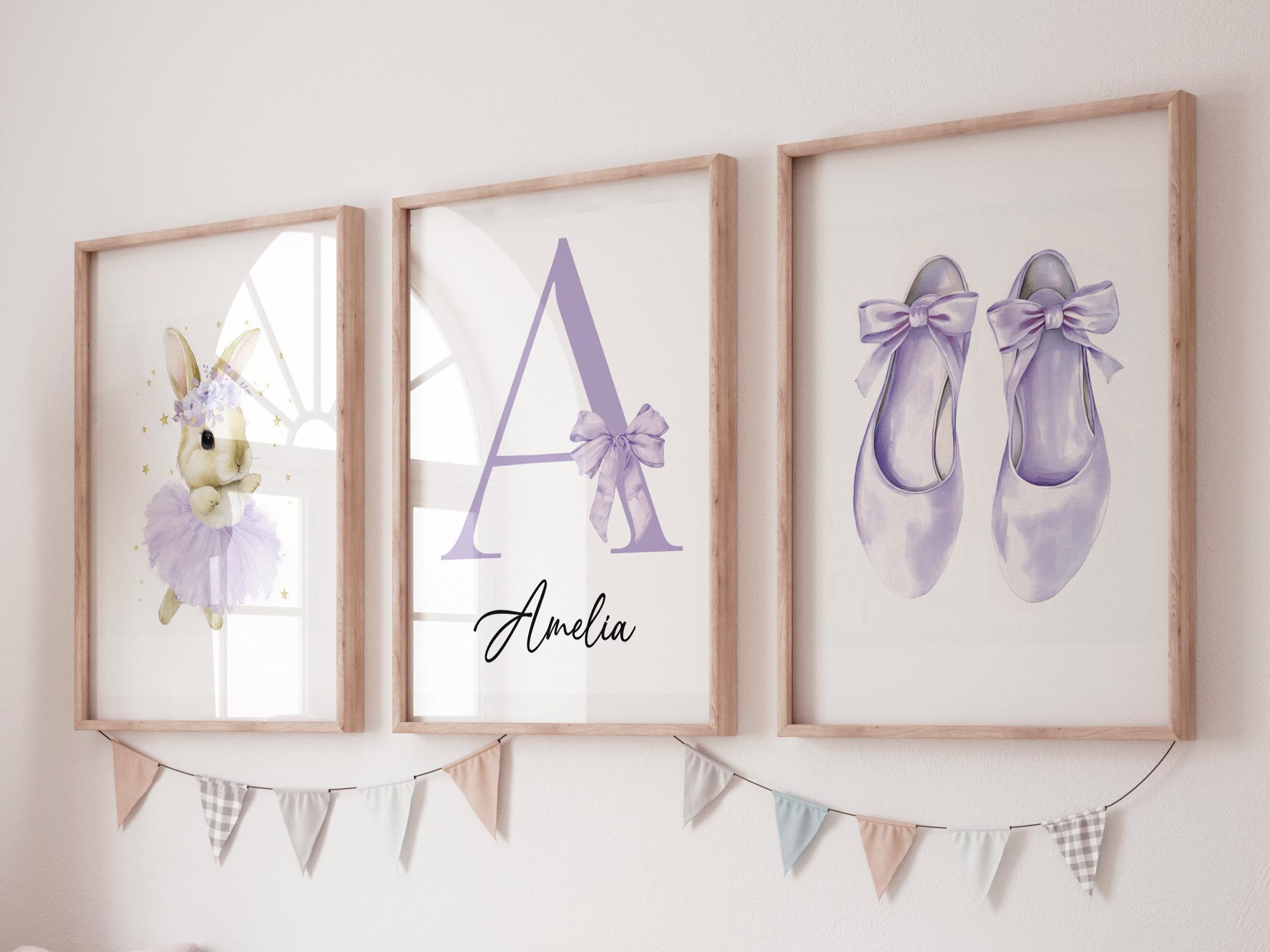 Personalized Purple Nursery Wall Art Set of 3, Ballerina Bunny Print, Initial Name Print, Ballet Shoes, Girl Nursery Decor
