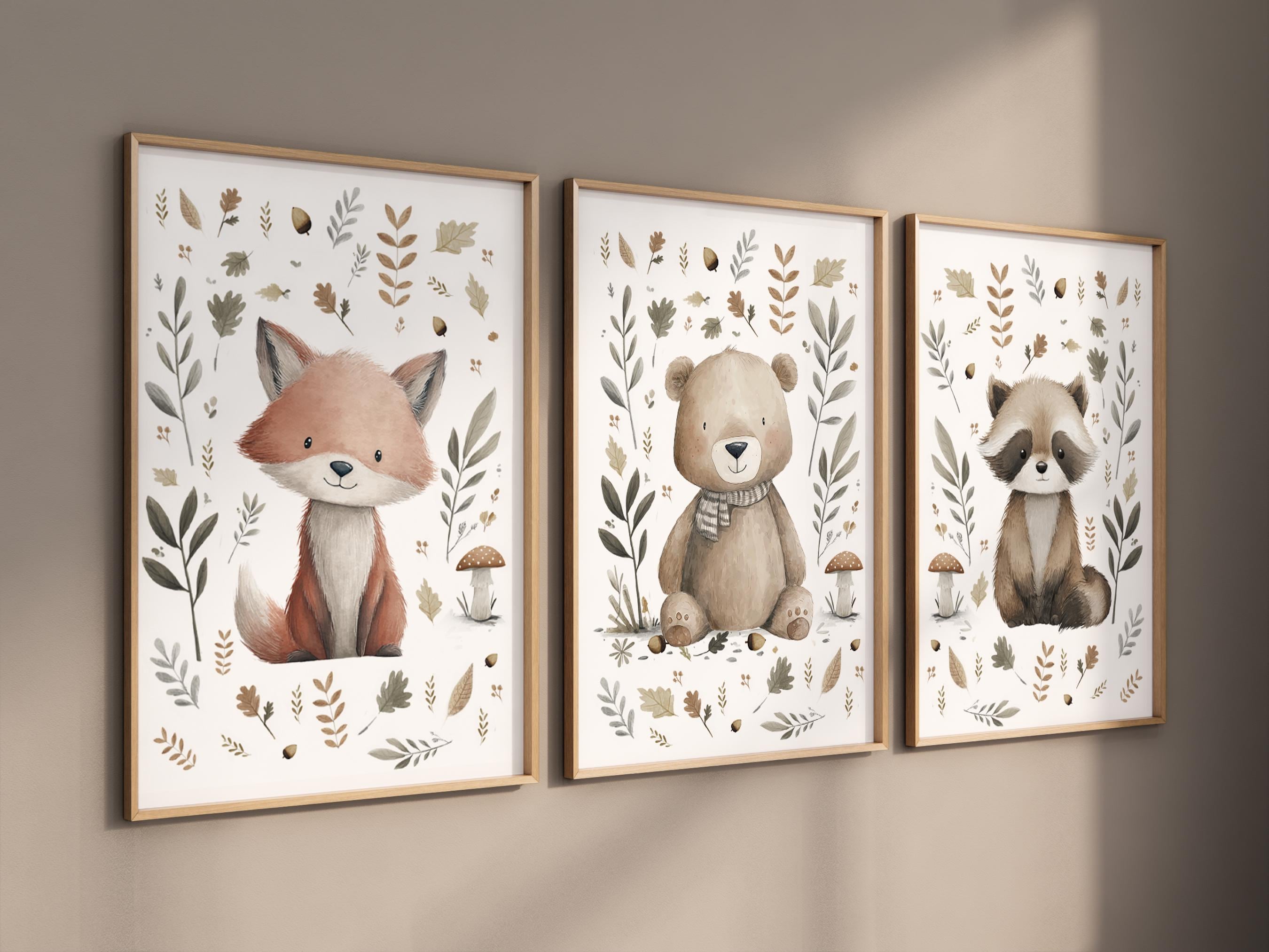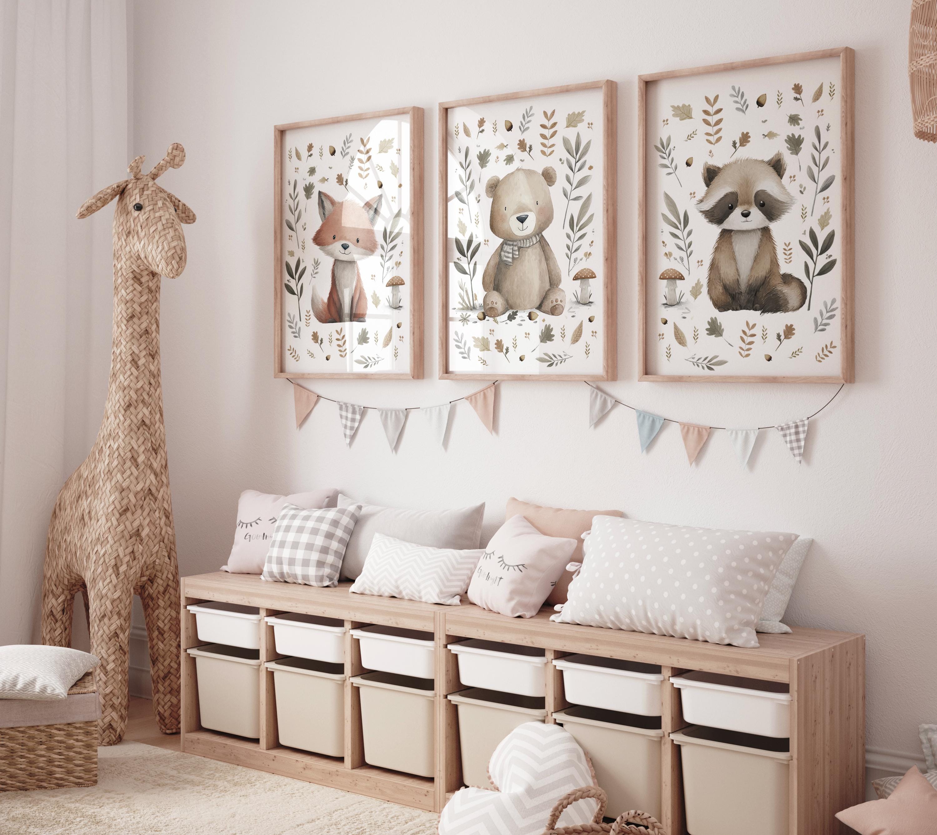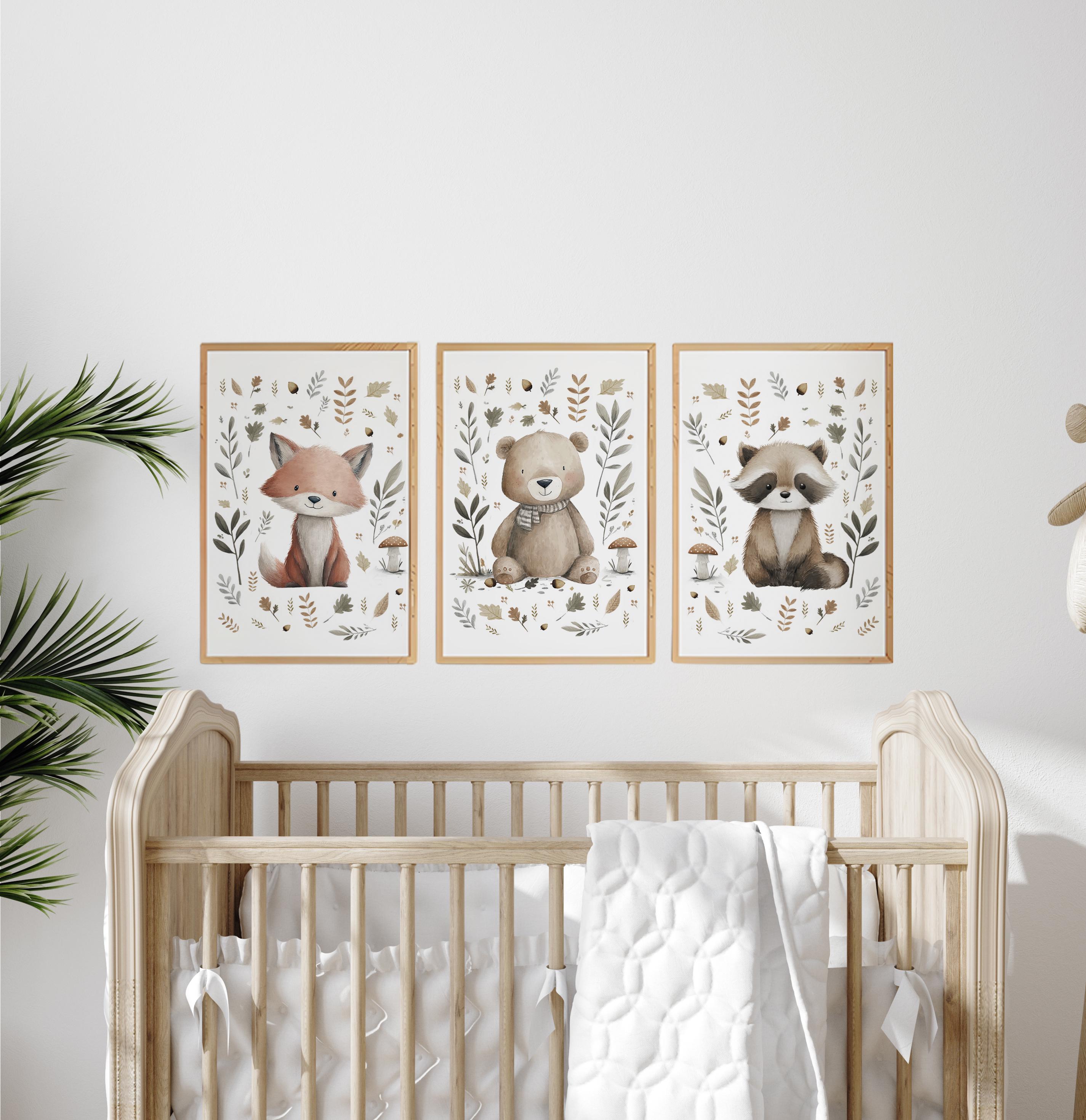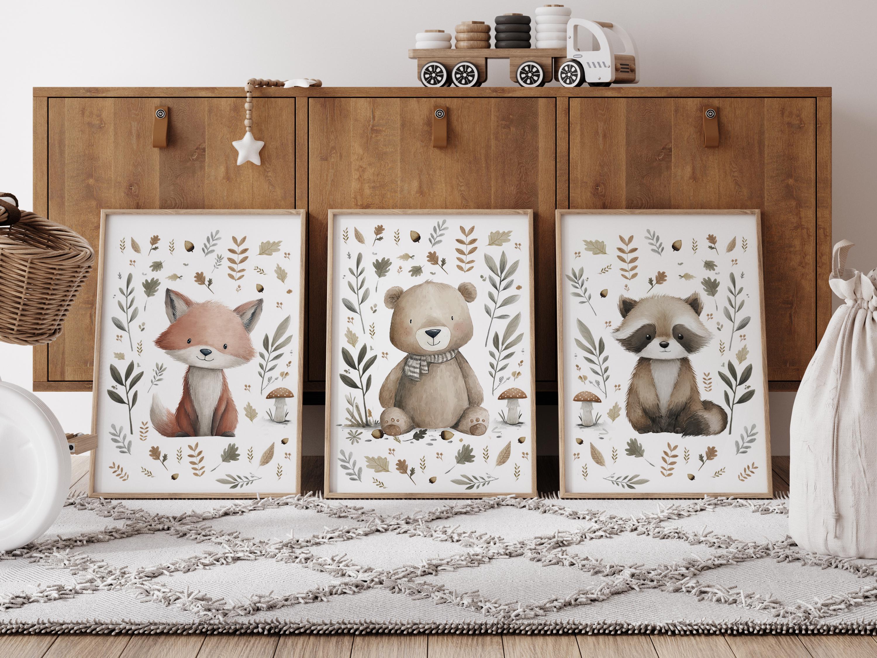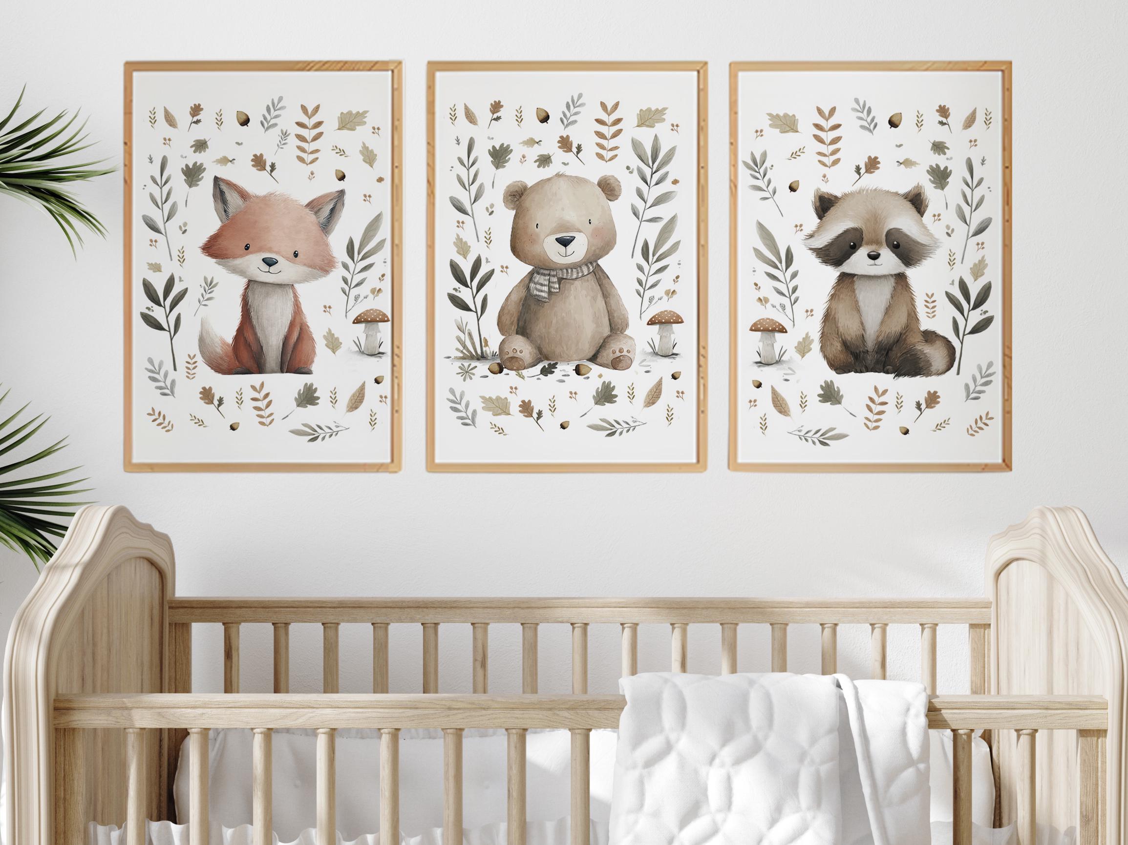 Transform your child’s space with this adorable woodland nursery wall art set, featuring a sweet fox, cuddly bear, and charming raccoon — all surrounded by soft forest foliage. This neutral, nature-inspired set is perfect for forest theme décor, woodland nursery prints, and even cozy playroom decor.