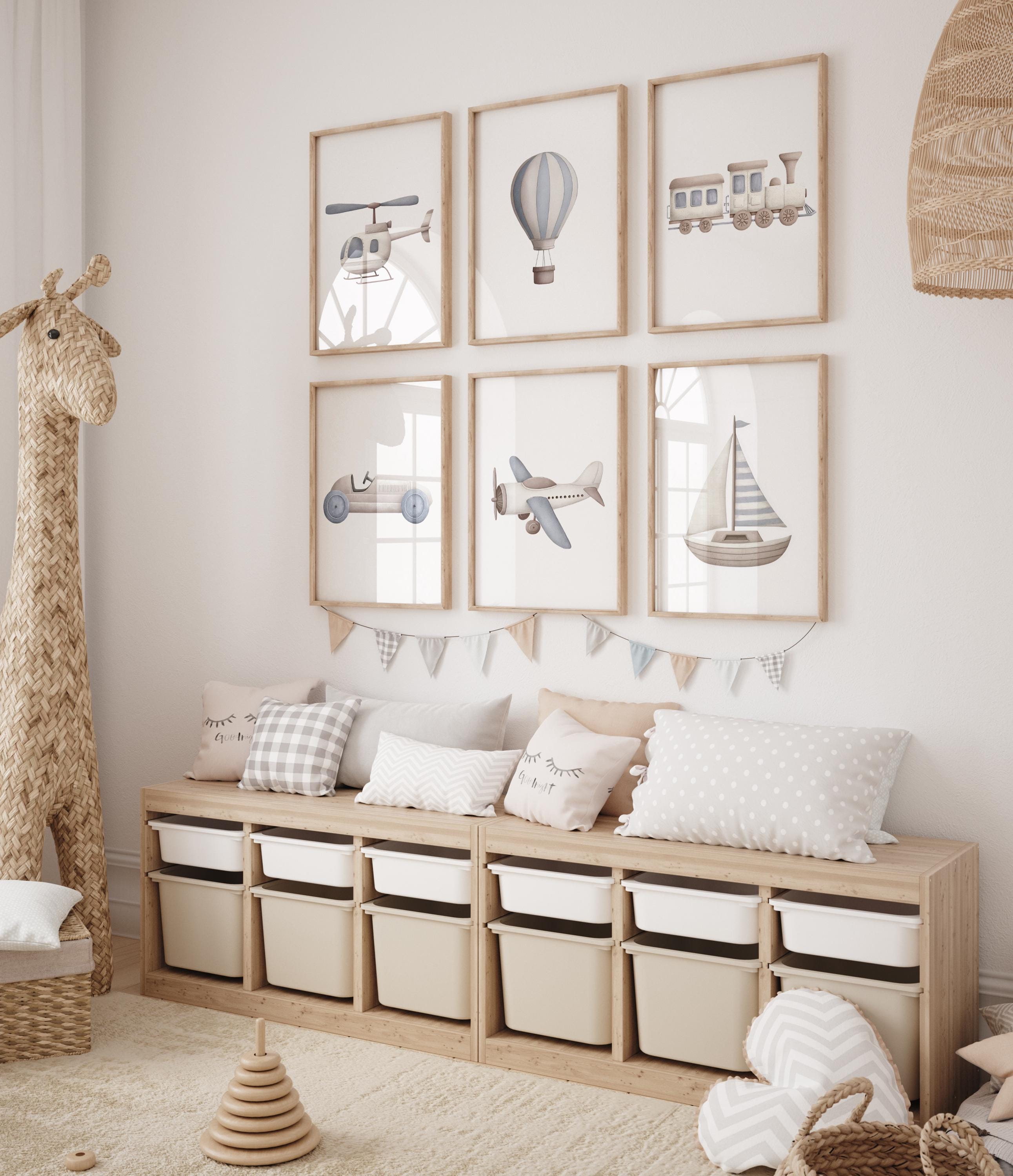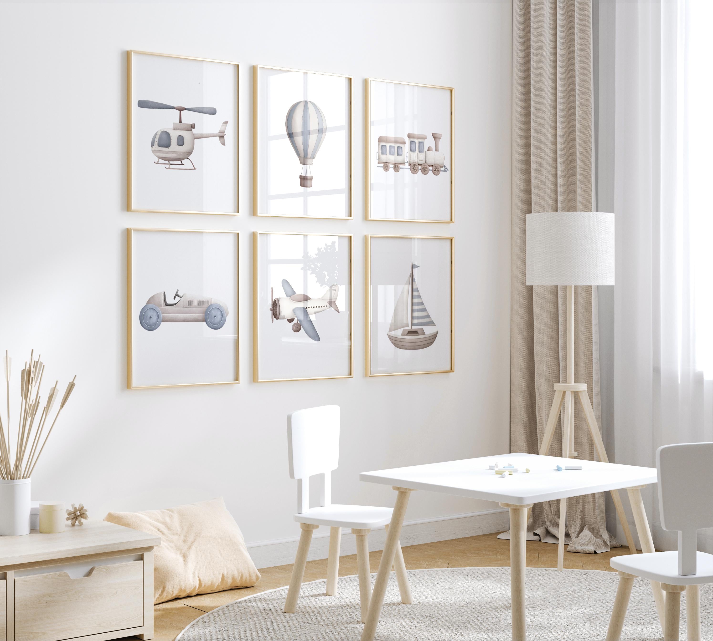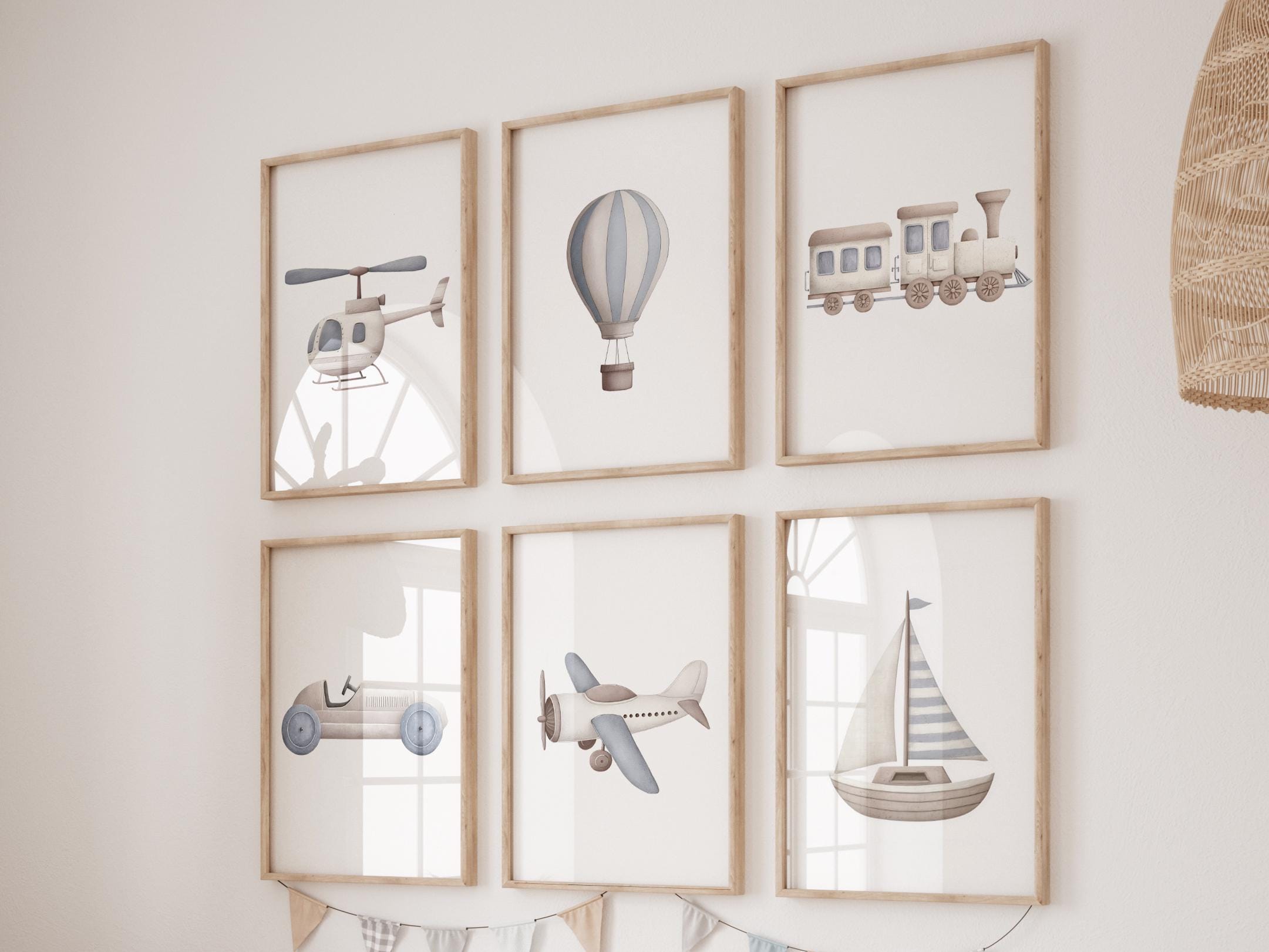 Create a calm, playful nursery with this transportation-themed wall art set, featuring six charming watercolor vehicle illustrations. Designed in soft blue and neutral tones, this collection includes classic toy-inspired vehicles such as airplanes, trains, cars, boats, and a hot air balloon.