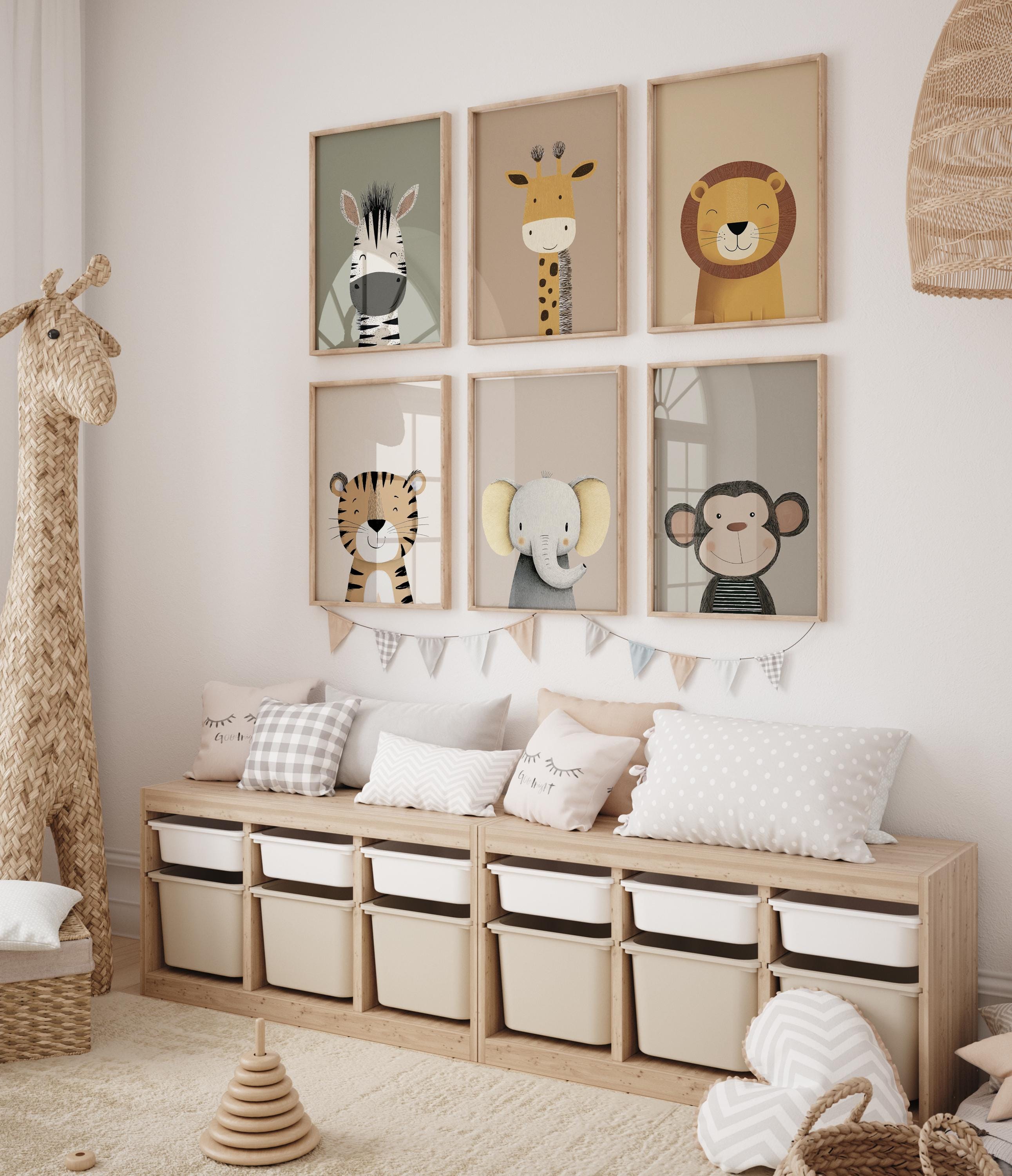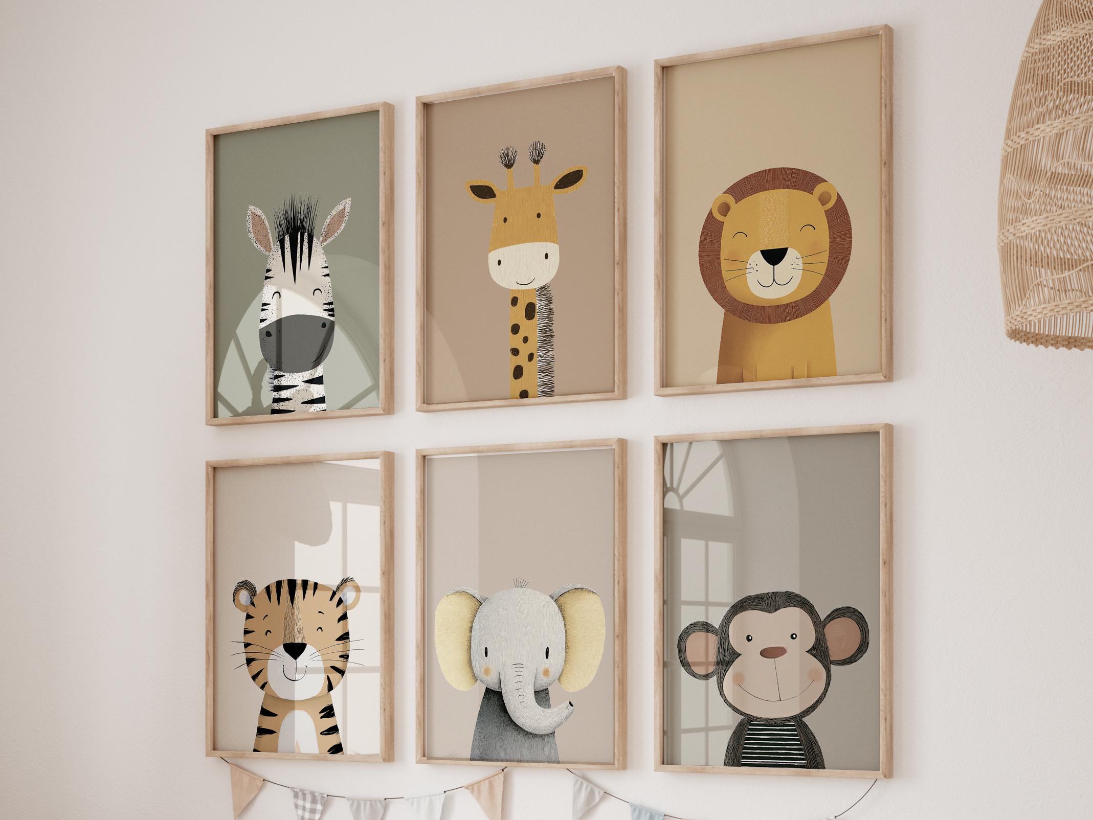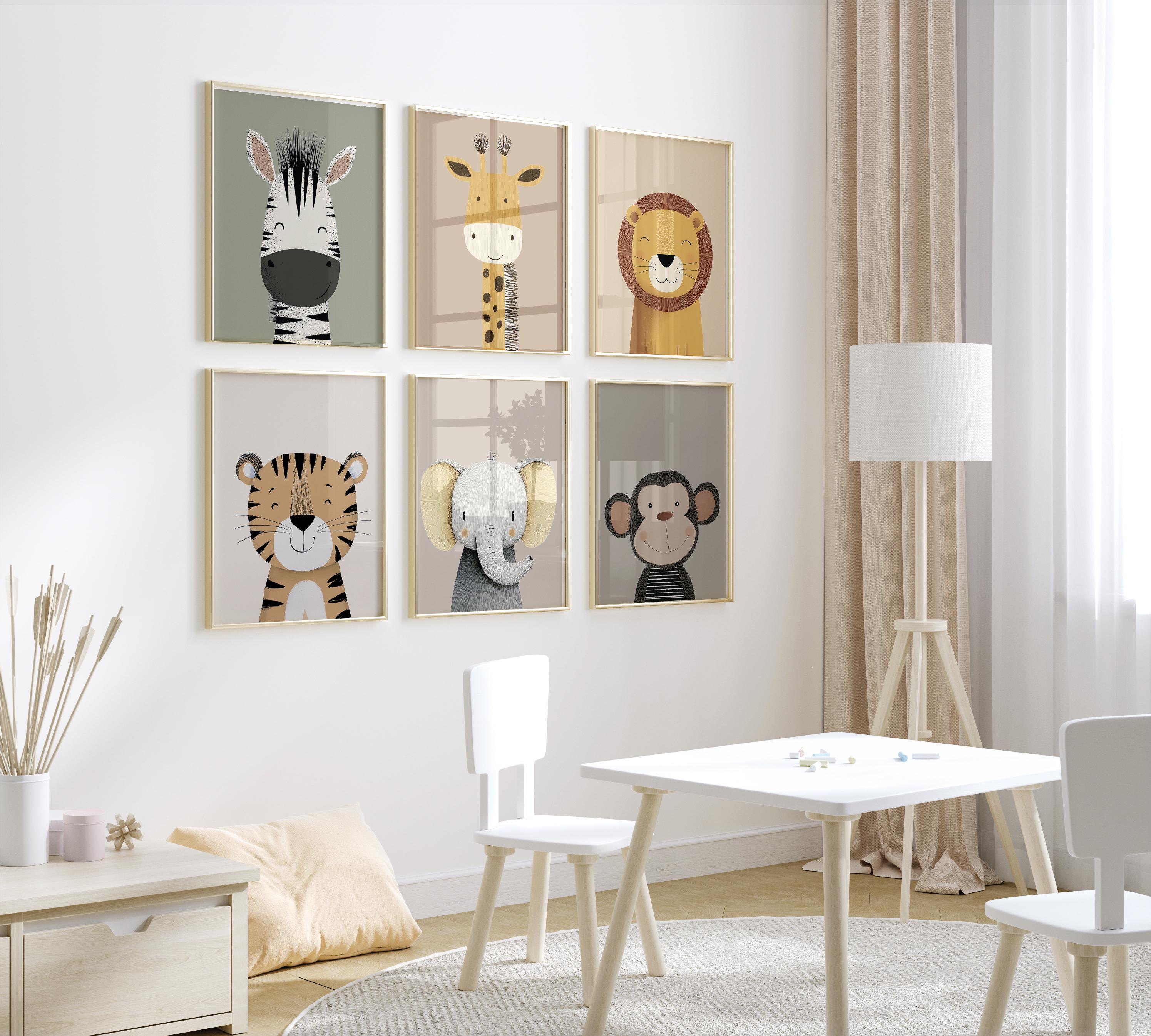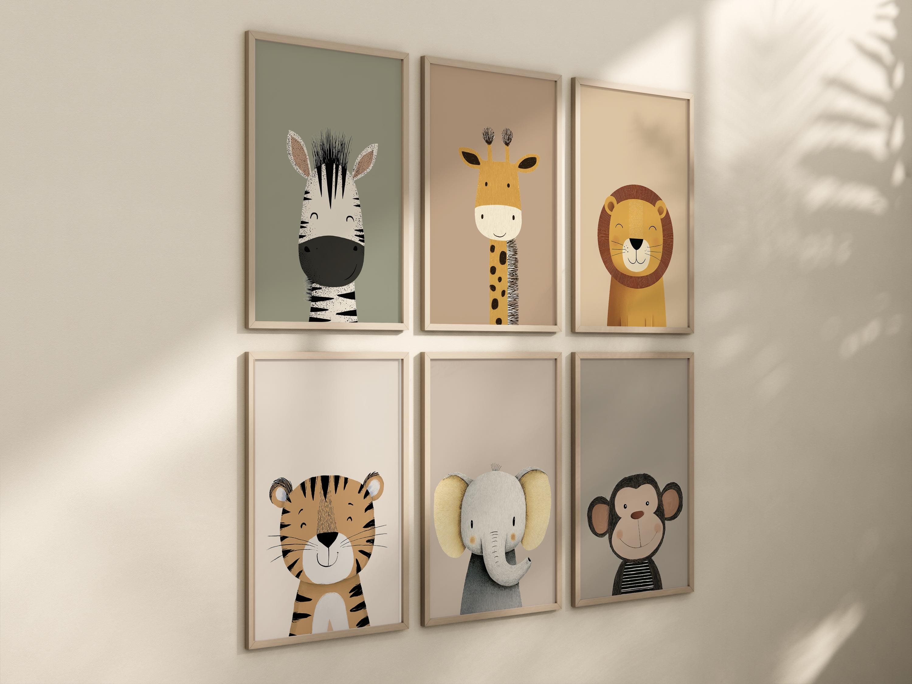 Animal Art Prints Set of 6, Neutral Nursery Wall Art, Modern Jungle Animals, Kids Room Decor, Playroom Animal Prints