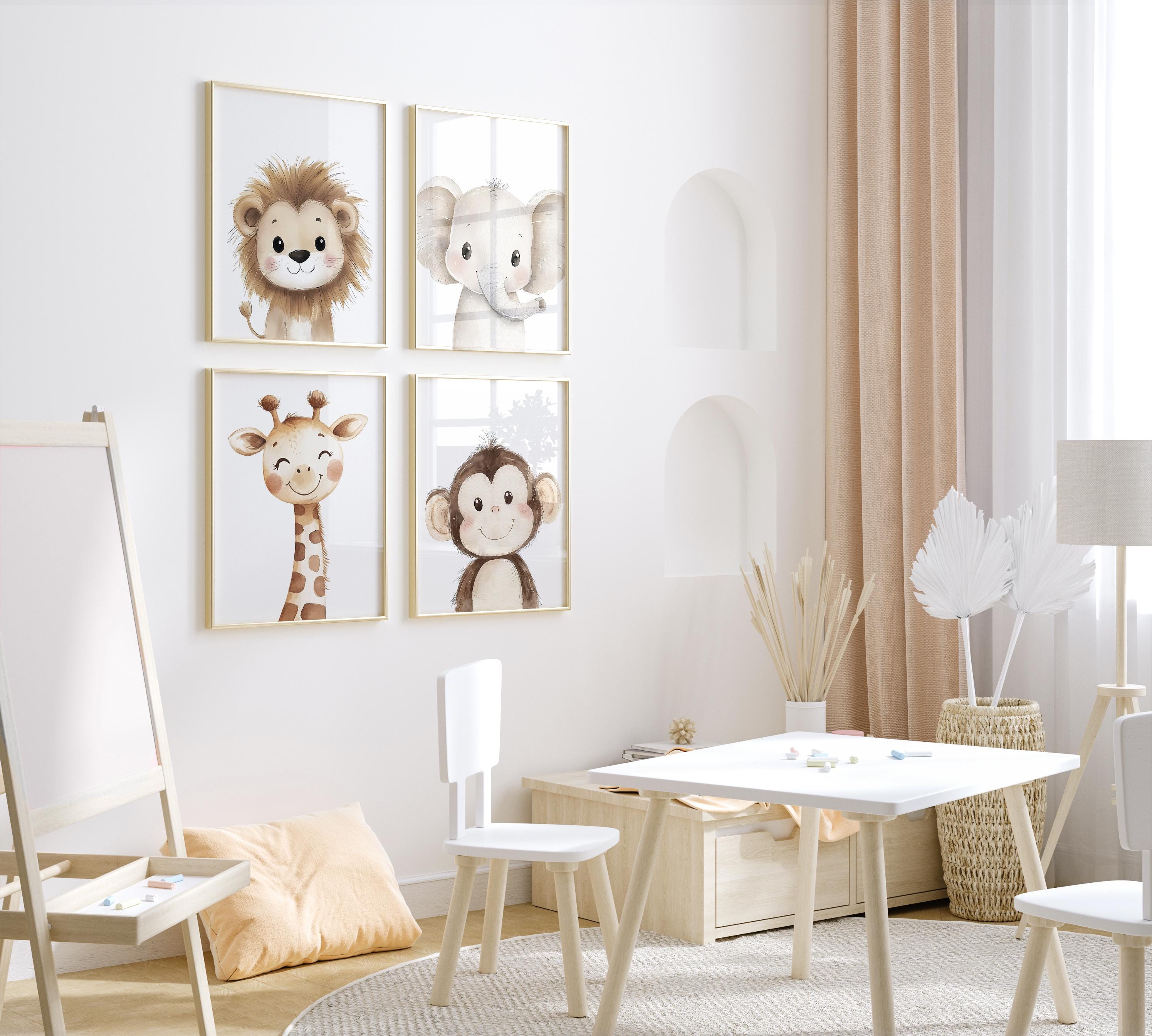 Adorable set of 4 safari animal prints featuring a lion, elephant, giraffe, and monkey. Perfect for jungle-themed or gender-neutral nurseries.