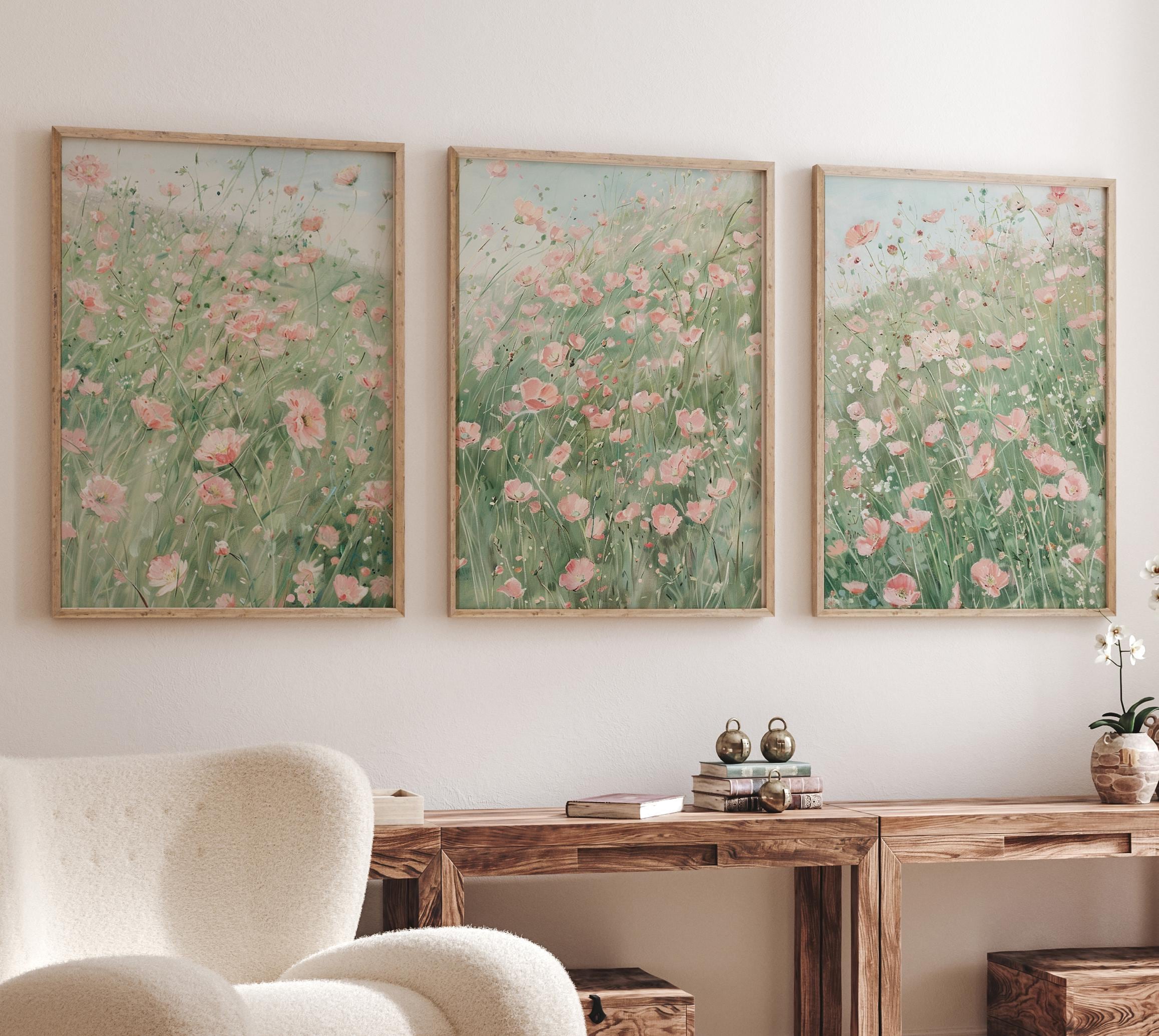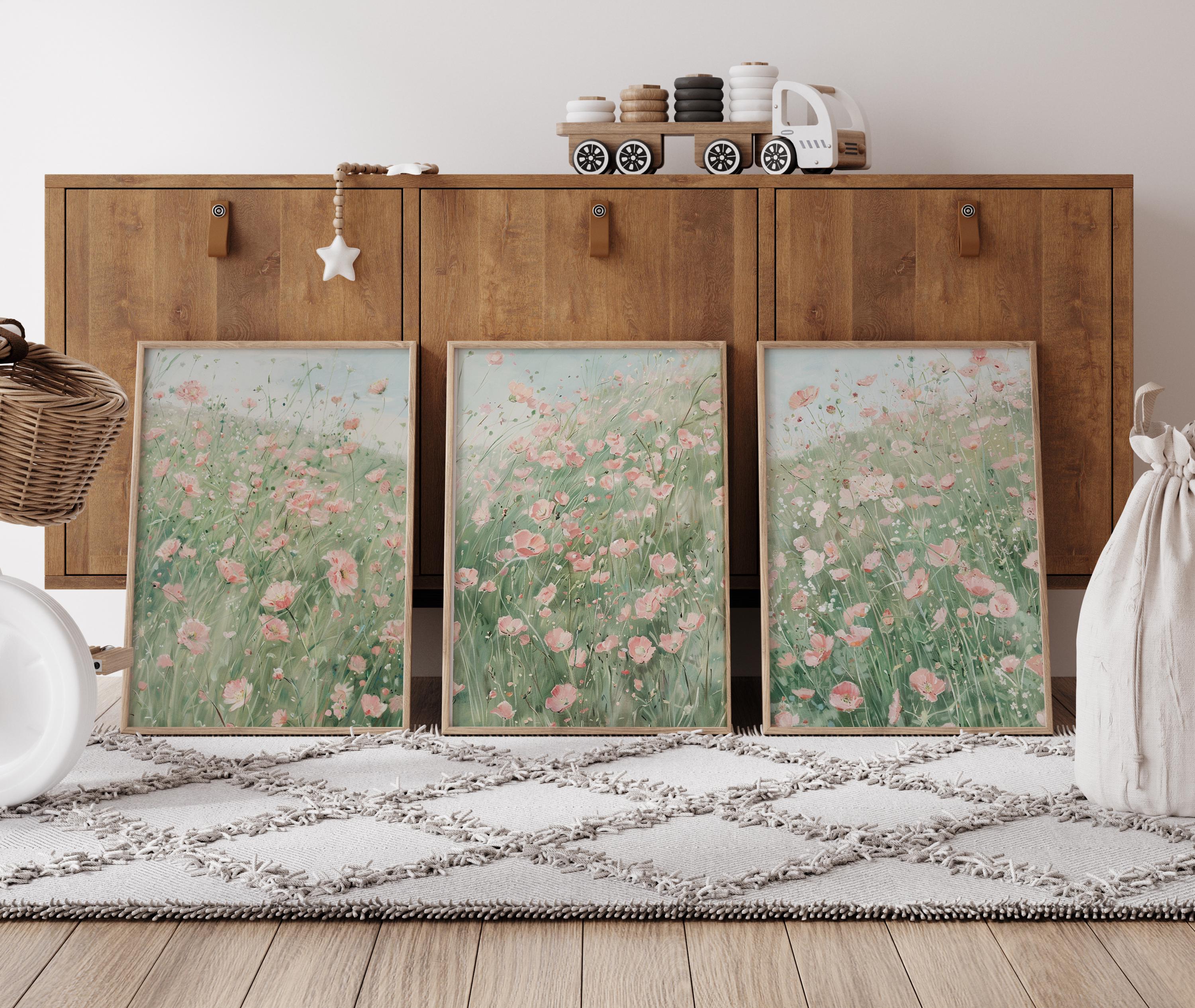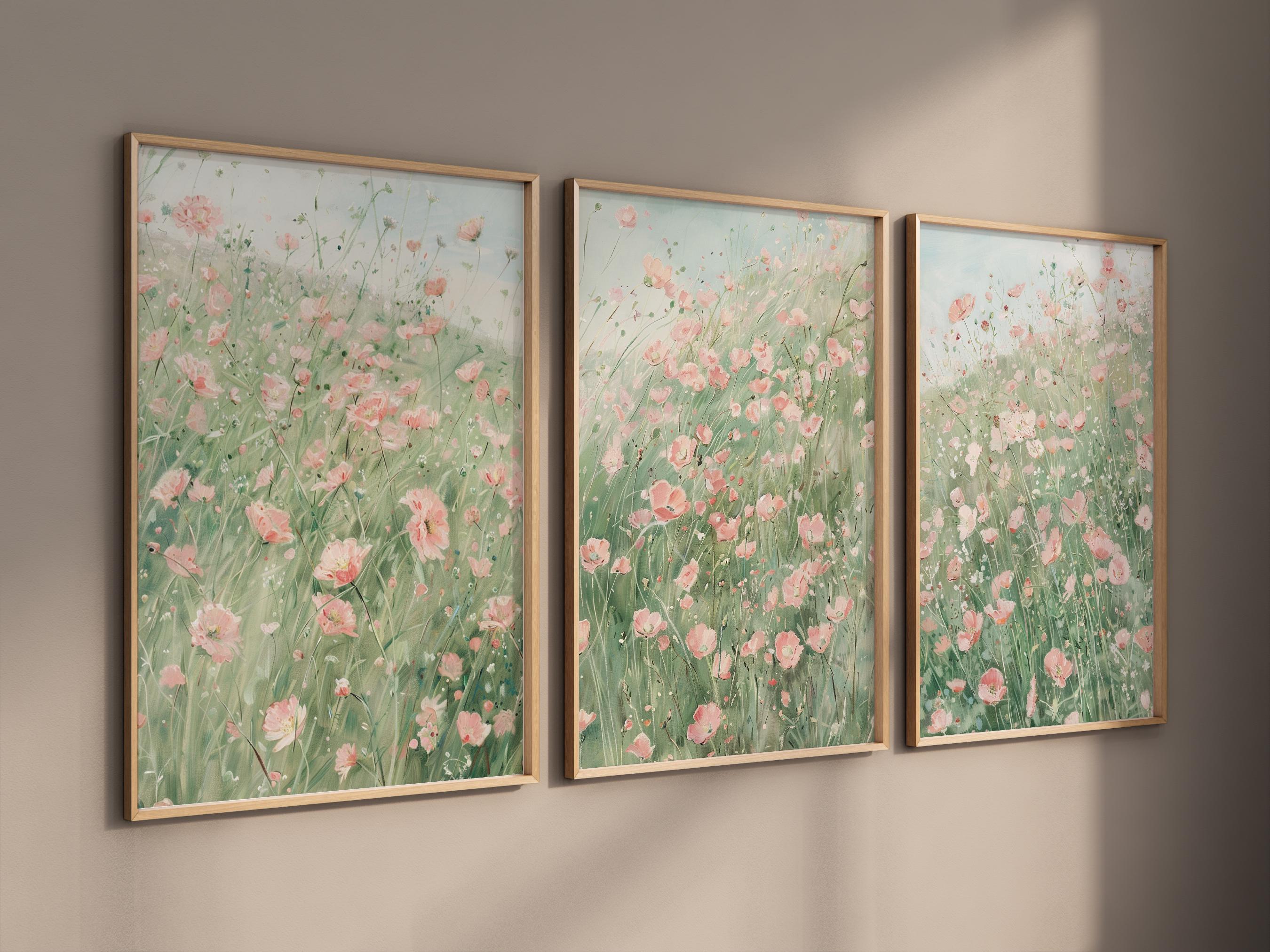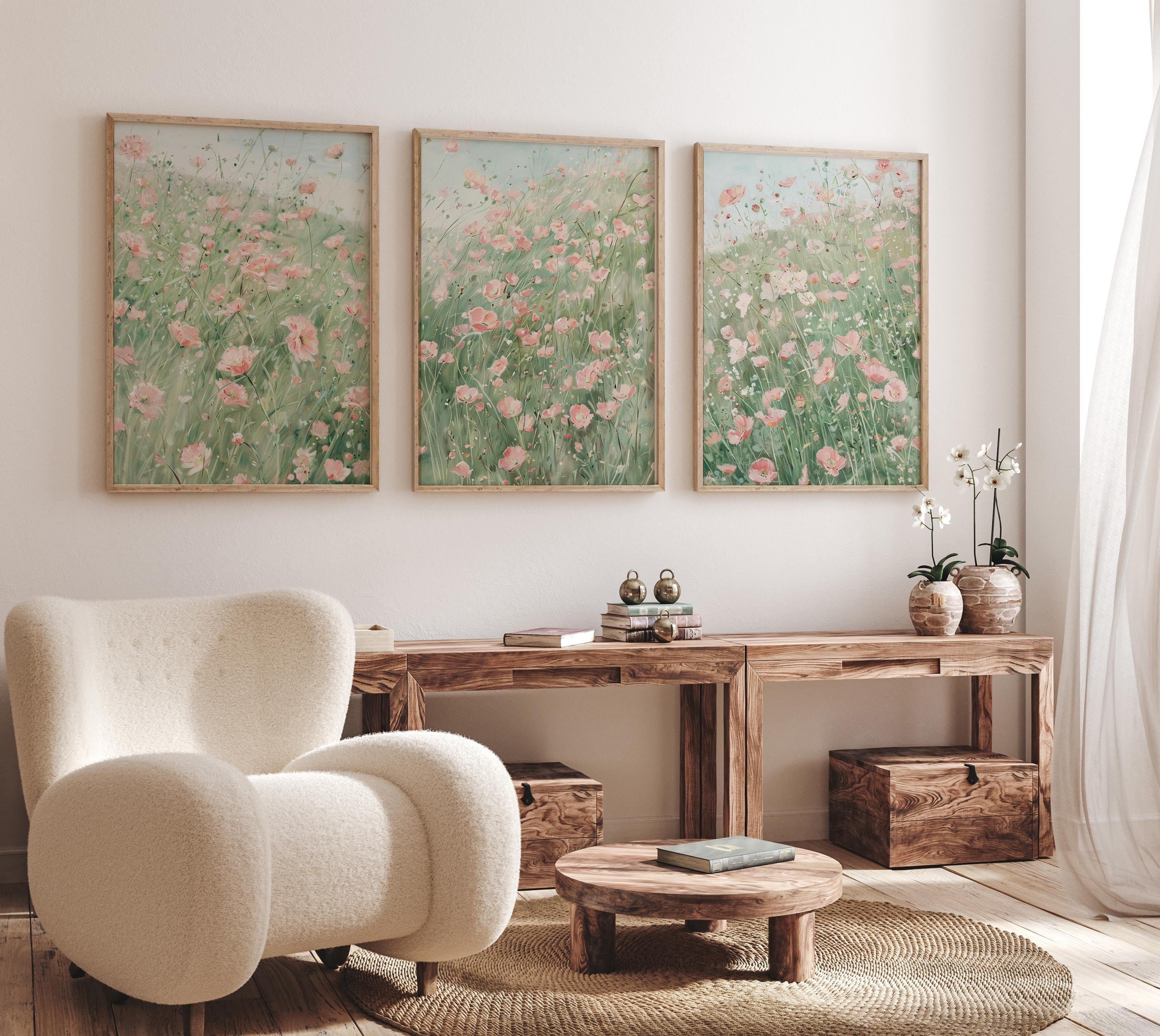 Pink Floral Wall Art Set of 3, Meadow Flower Prints, Cottagecore Home Decor, Soft Botanical Wall Art, Living Room Artwork