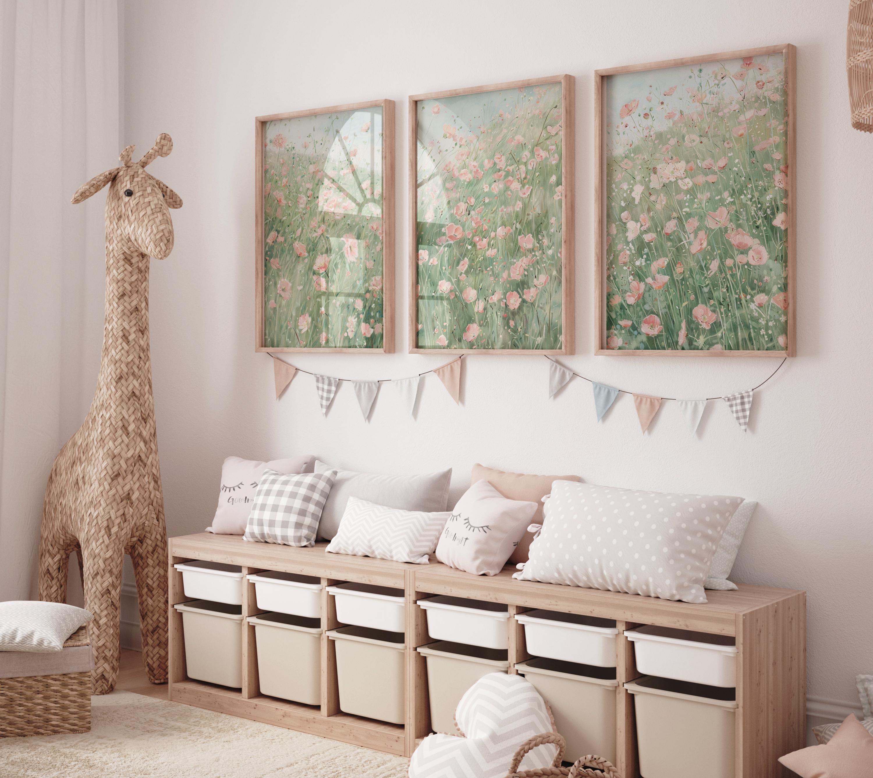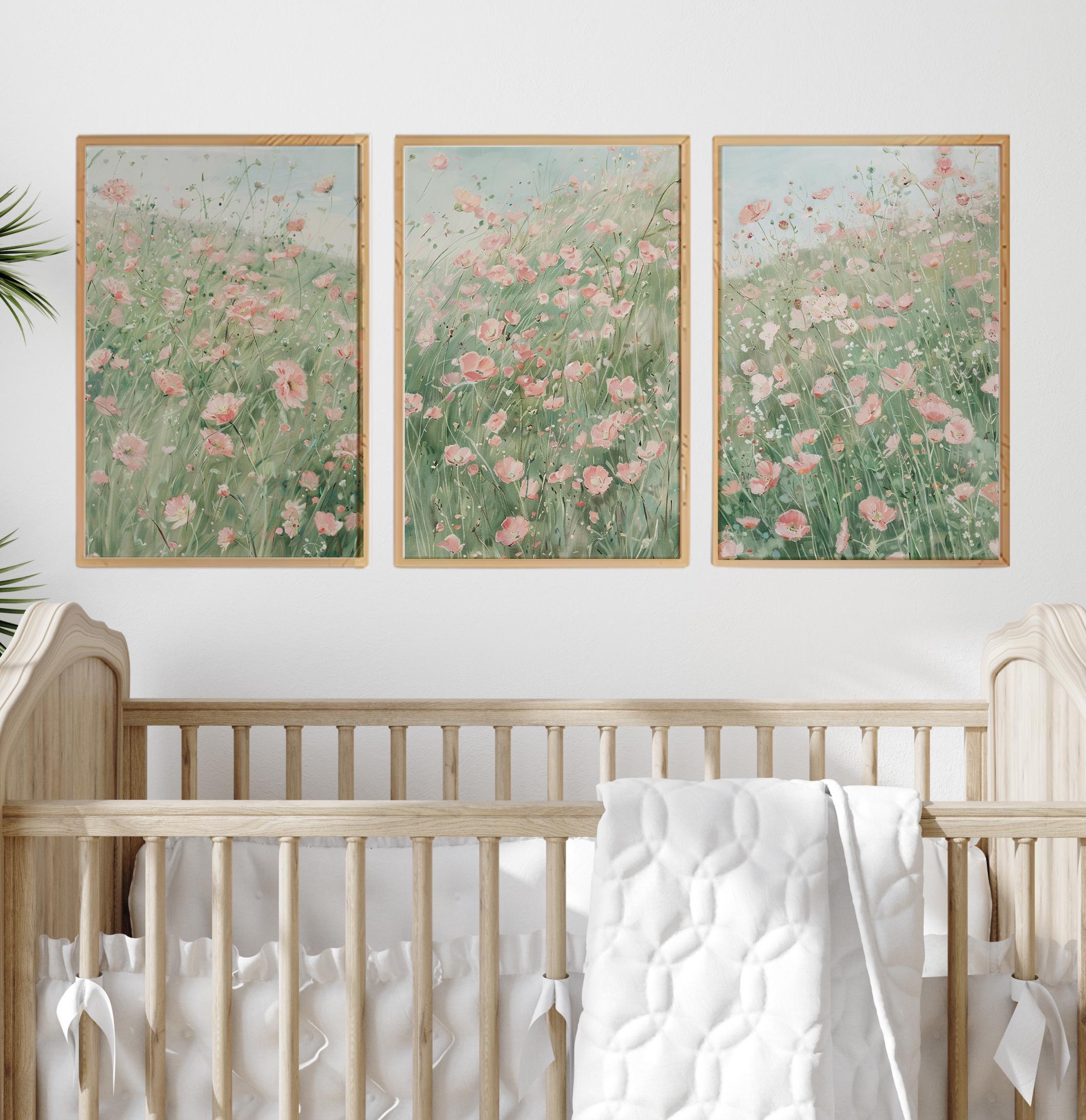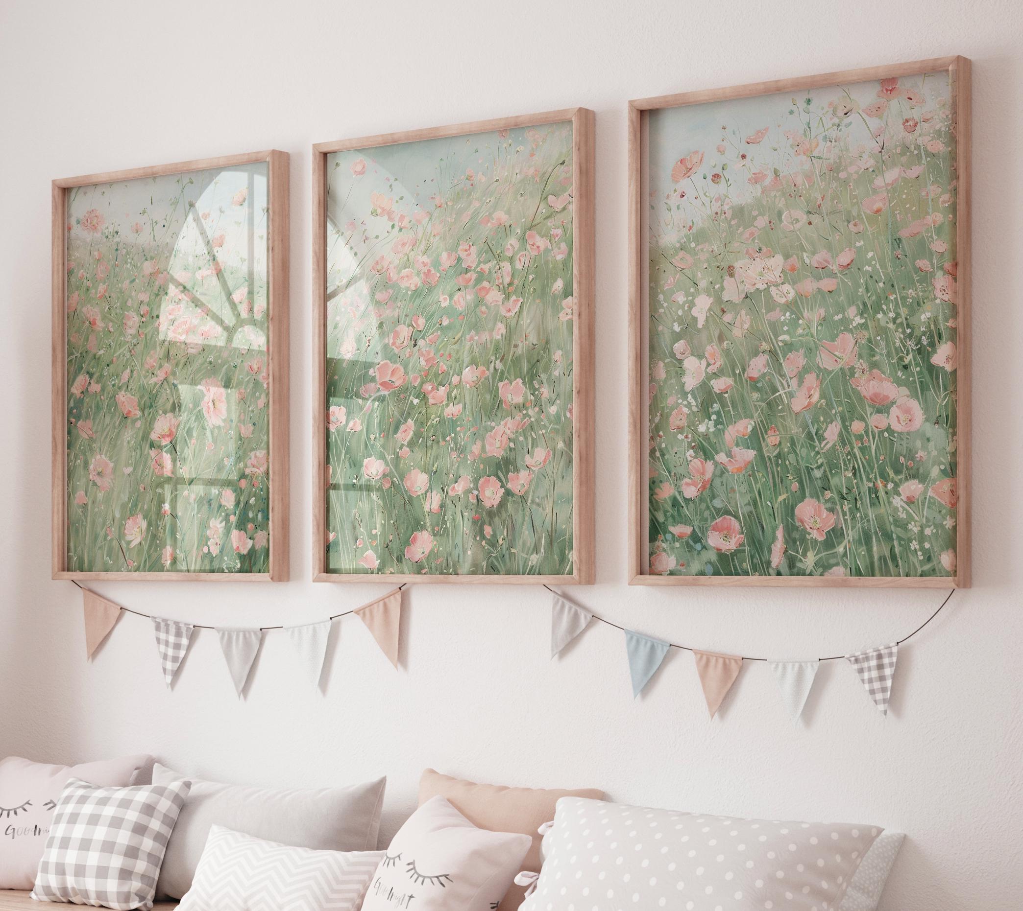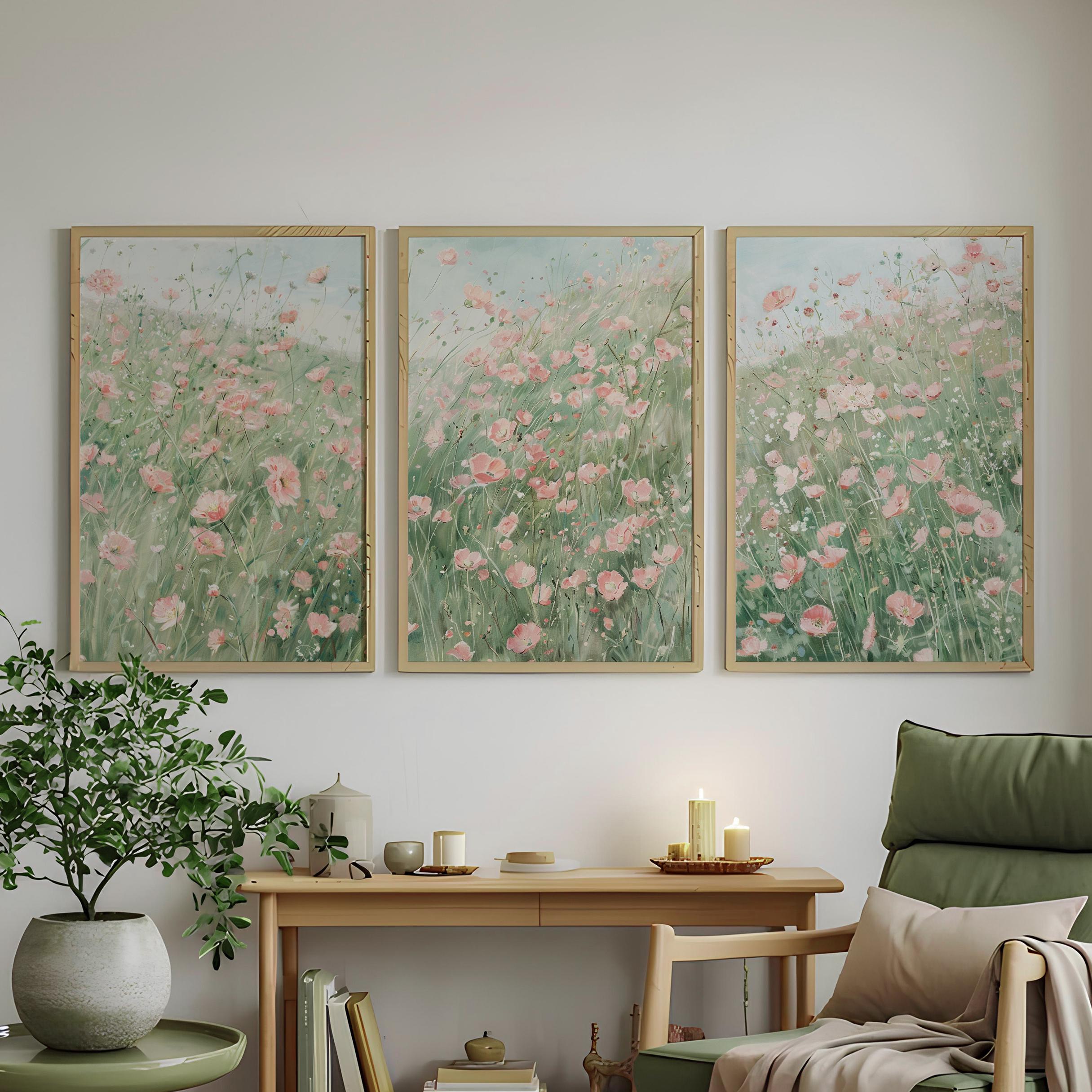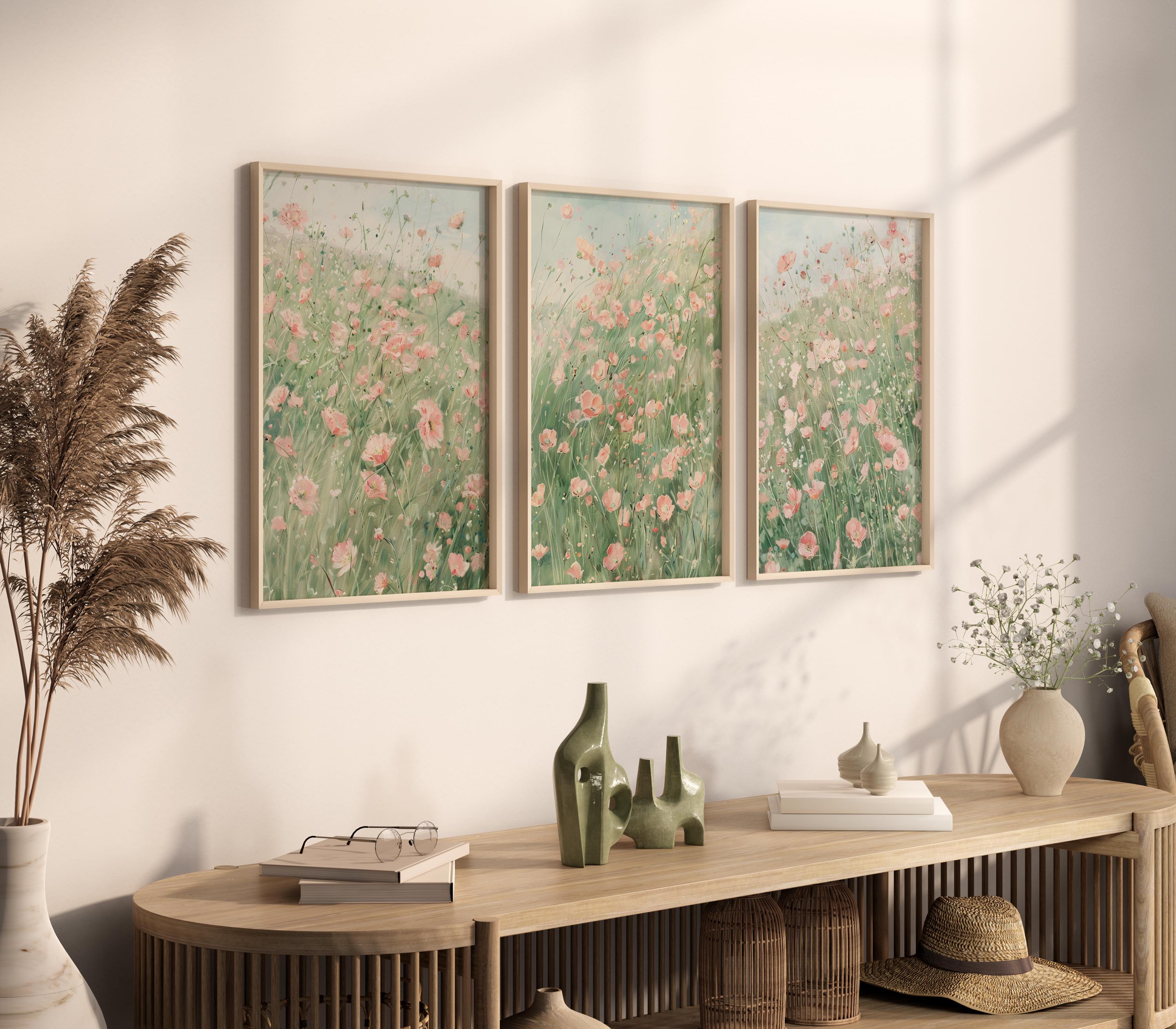 Pink Floral Wall Art Set of 3, Meadow Flower Prints, Cottagecore Home Decor, Soft Botanical Wall Art, Living Room Artwork
