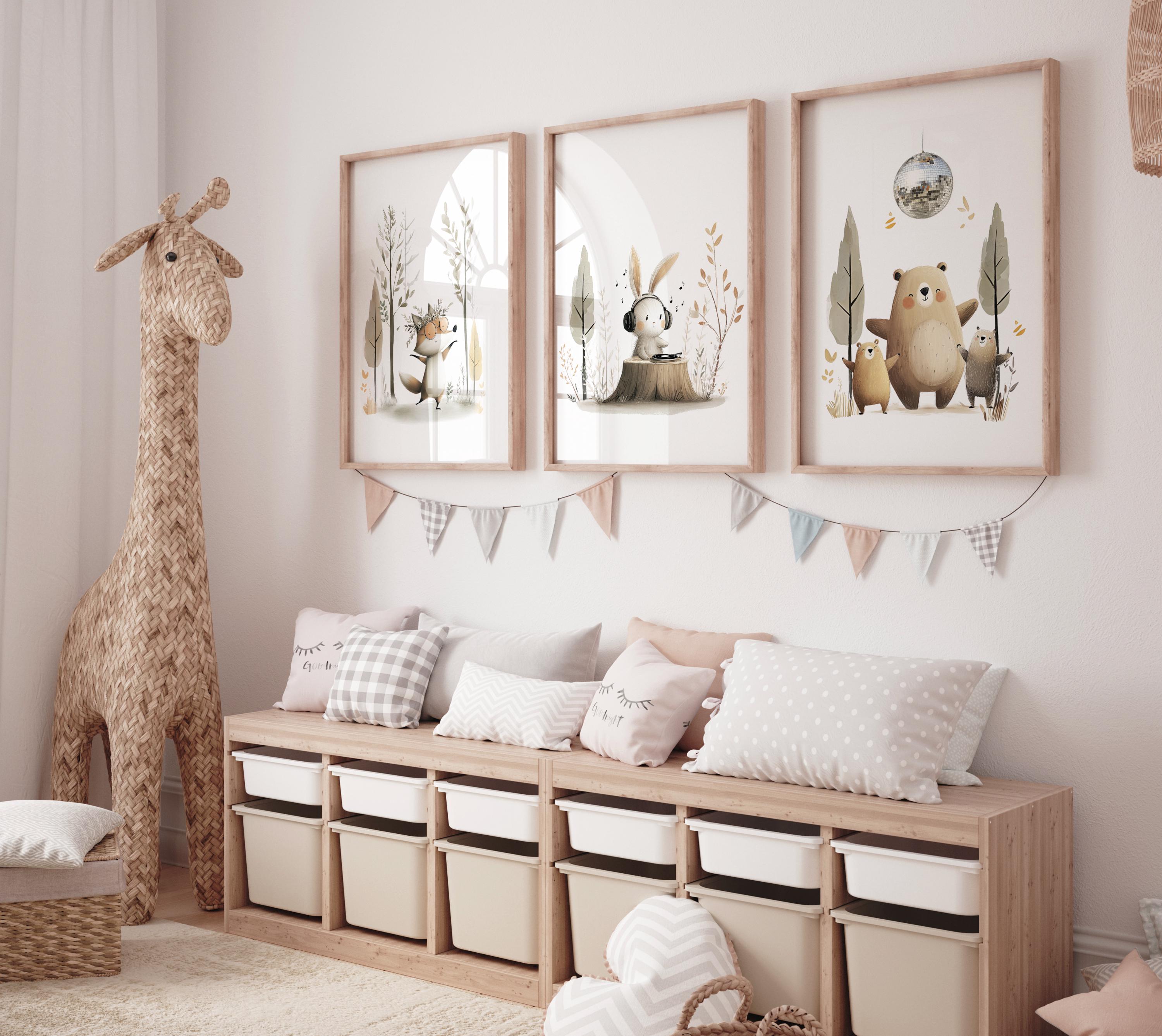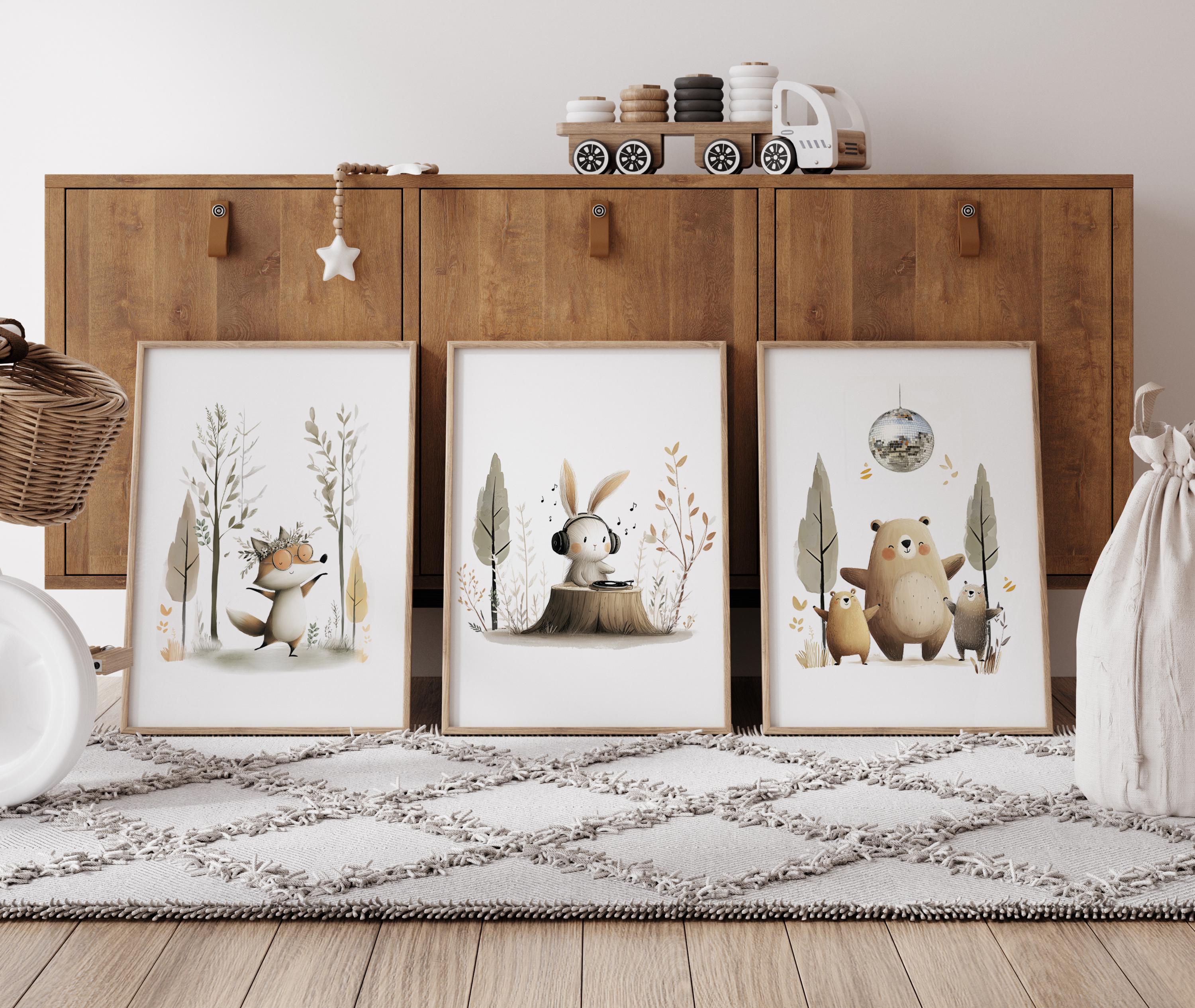 Bring a soft, whimsical woodland feel to your nursery or home with this adorable set of three forest animal prints. Featuring a playful fox, a music-loving bunny, and a sweet bear family, this artwork creates a calm and cozy atmosphere perfect for a baby room, playroom, or modern home decor.