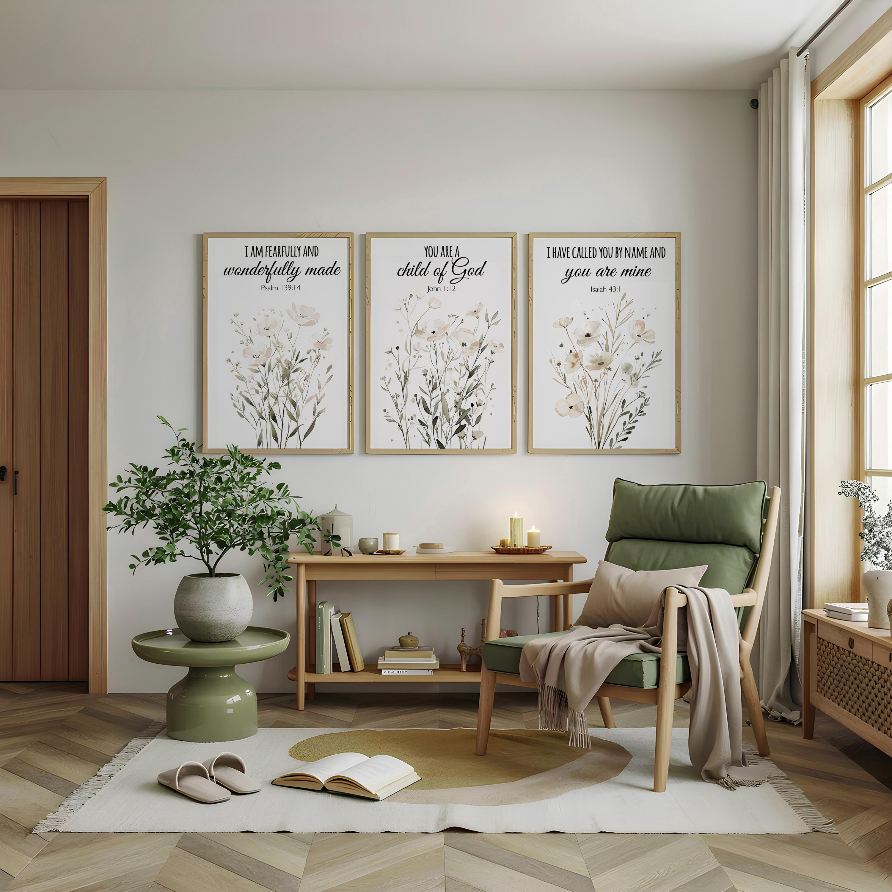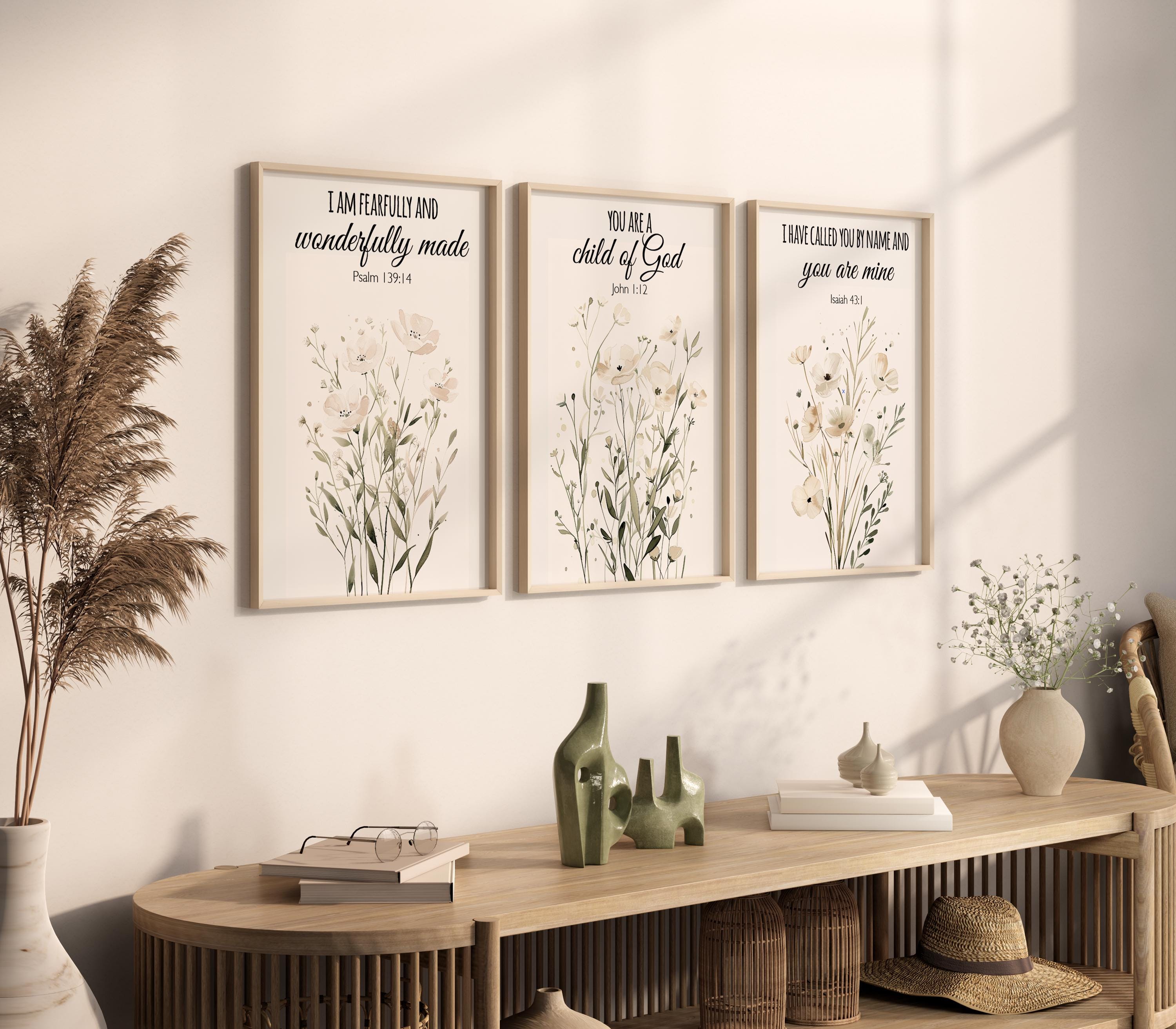 Create a peaceful and faith-filled space with this beautiful Christian nursery wall art set. Featuring soft neutral floral illustrations paired with meaningful Bible verses, this set adds warmth, inspiration, and timeless elegance to your baby’s room.