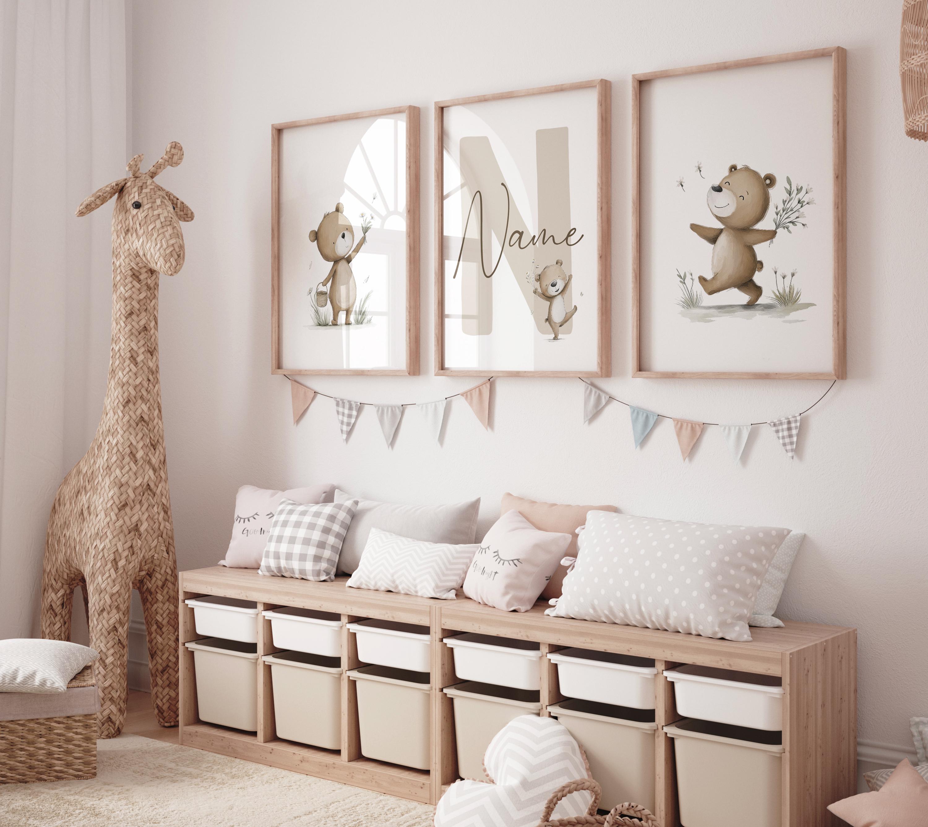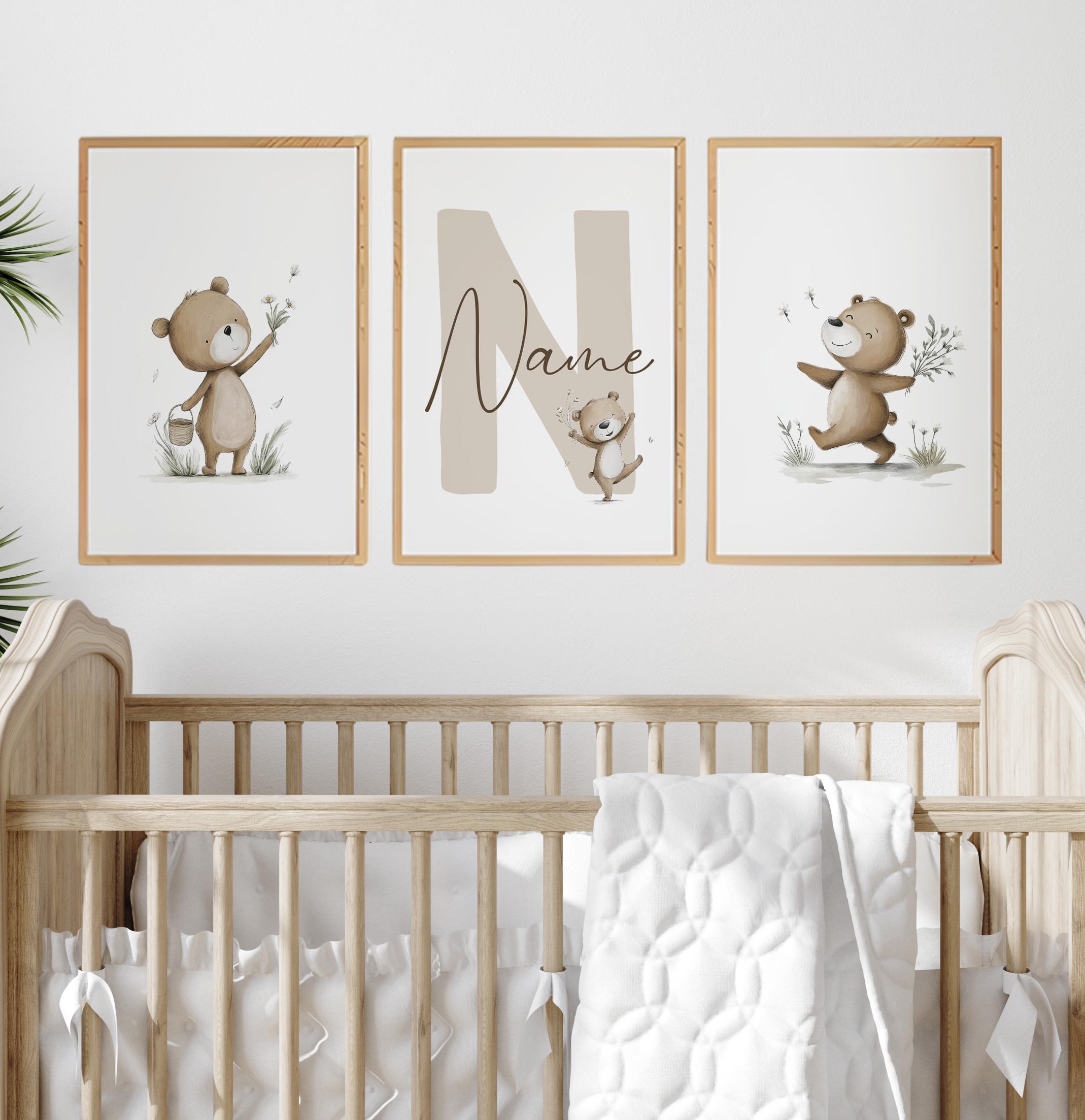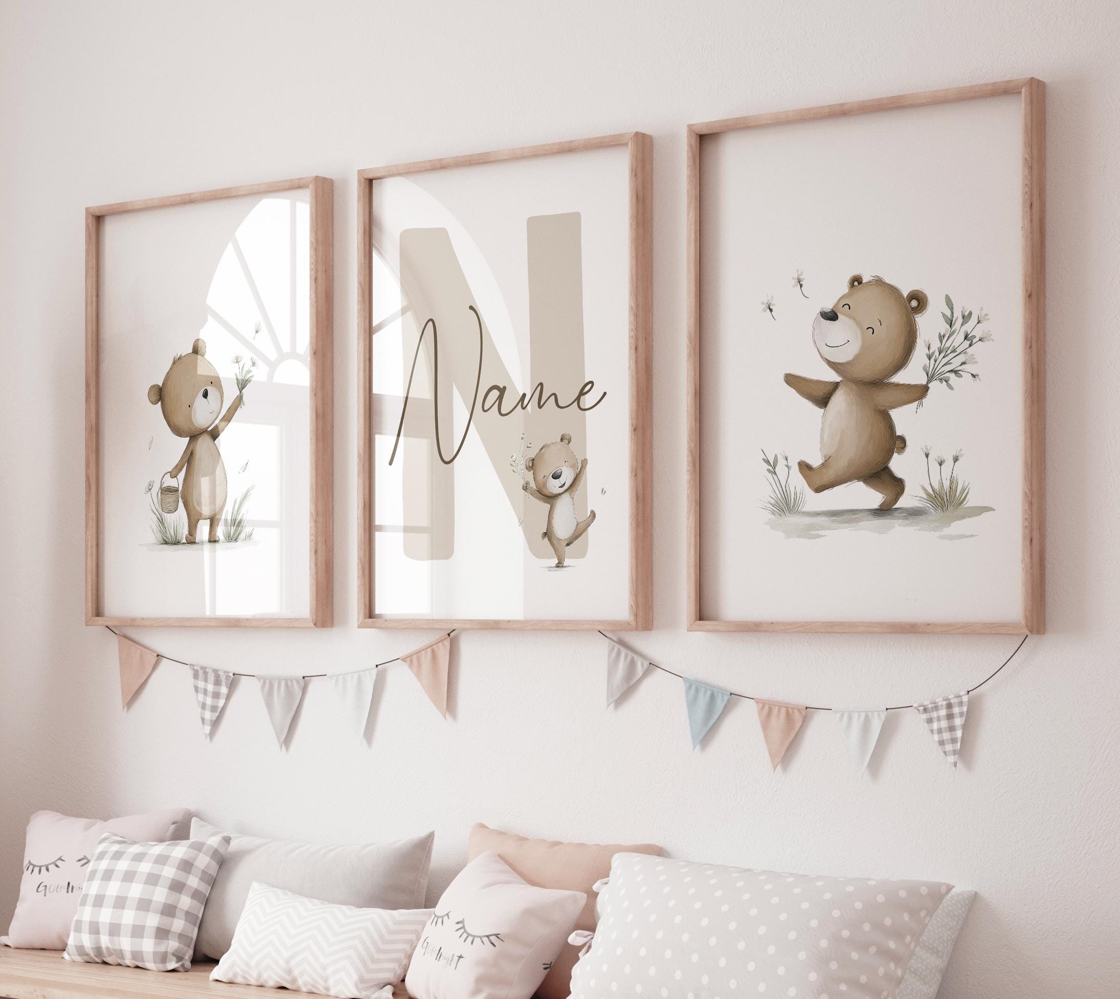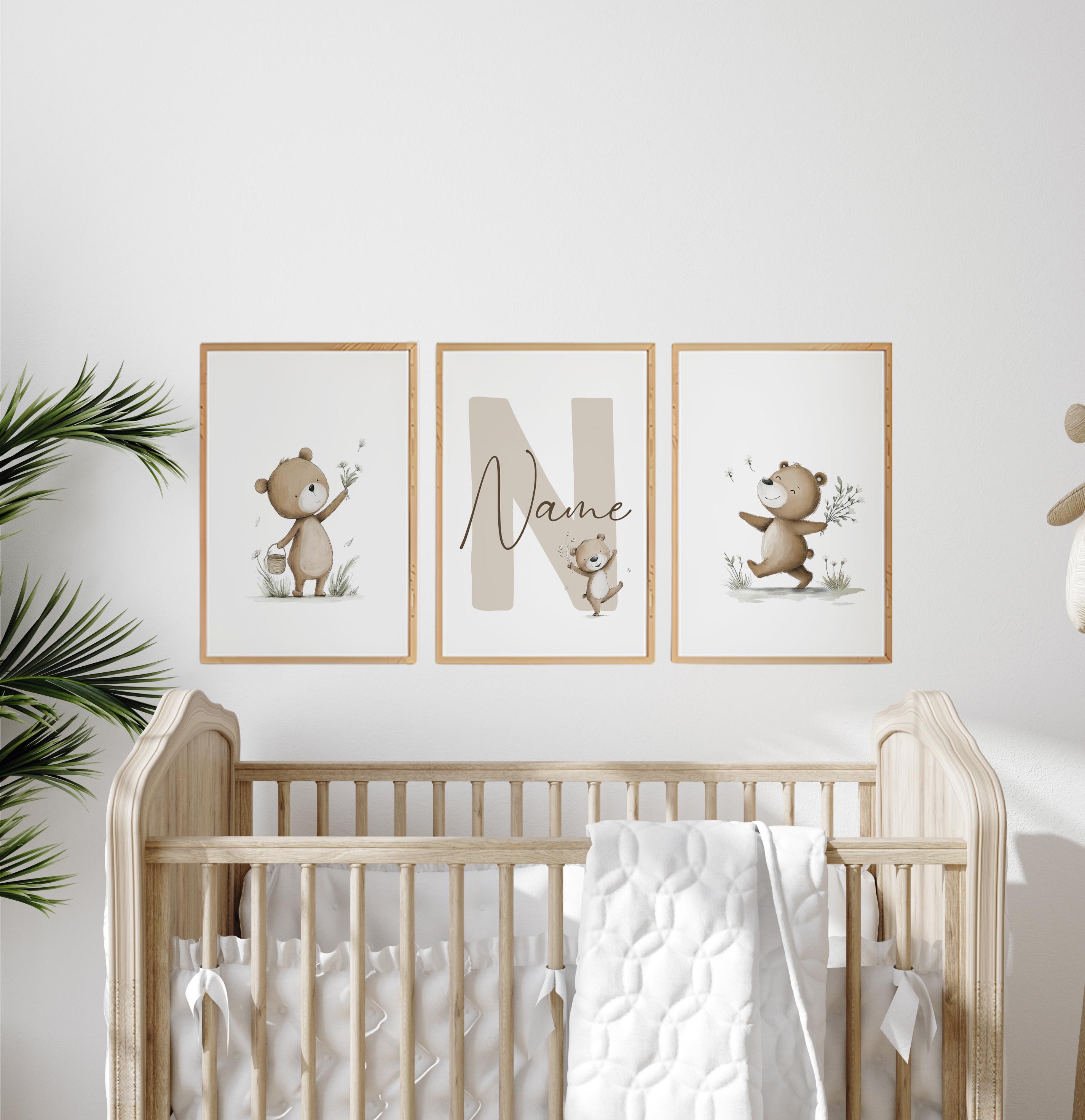 Personalized Bear Nursery Wall Art Set, Neutral Teddy Bear Name Prints, Beige Woodland Nursery Decor, Baby Boy or Girl Room Decor