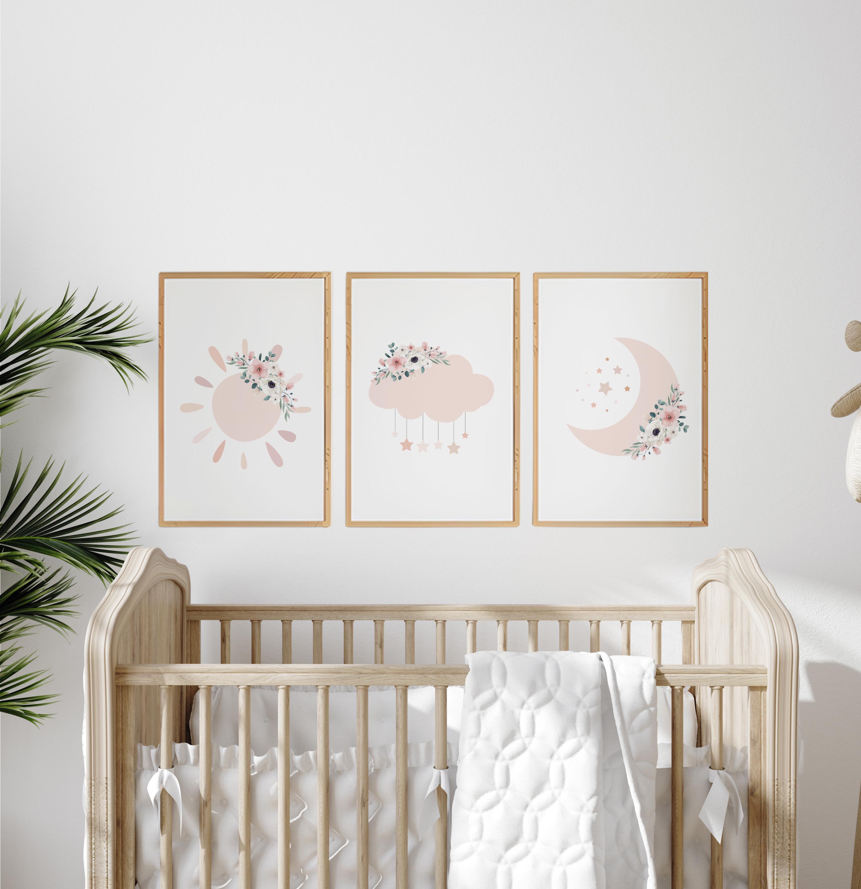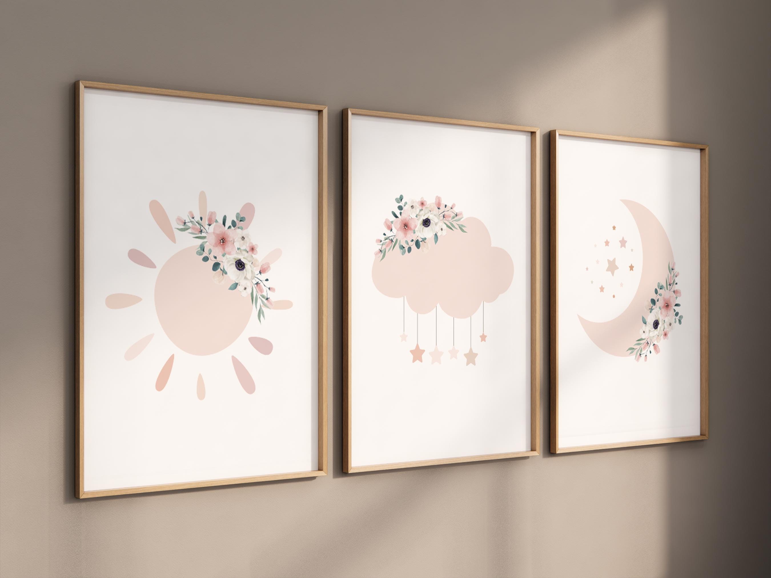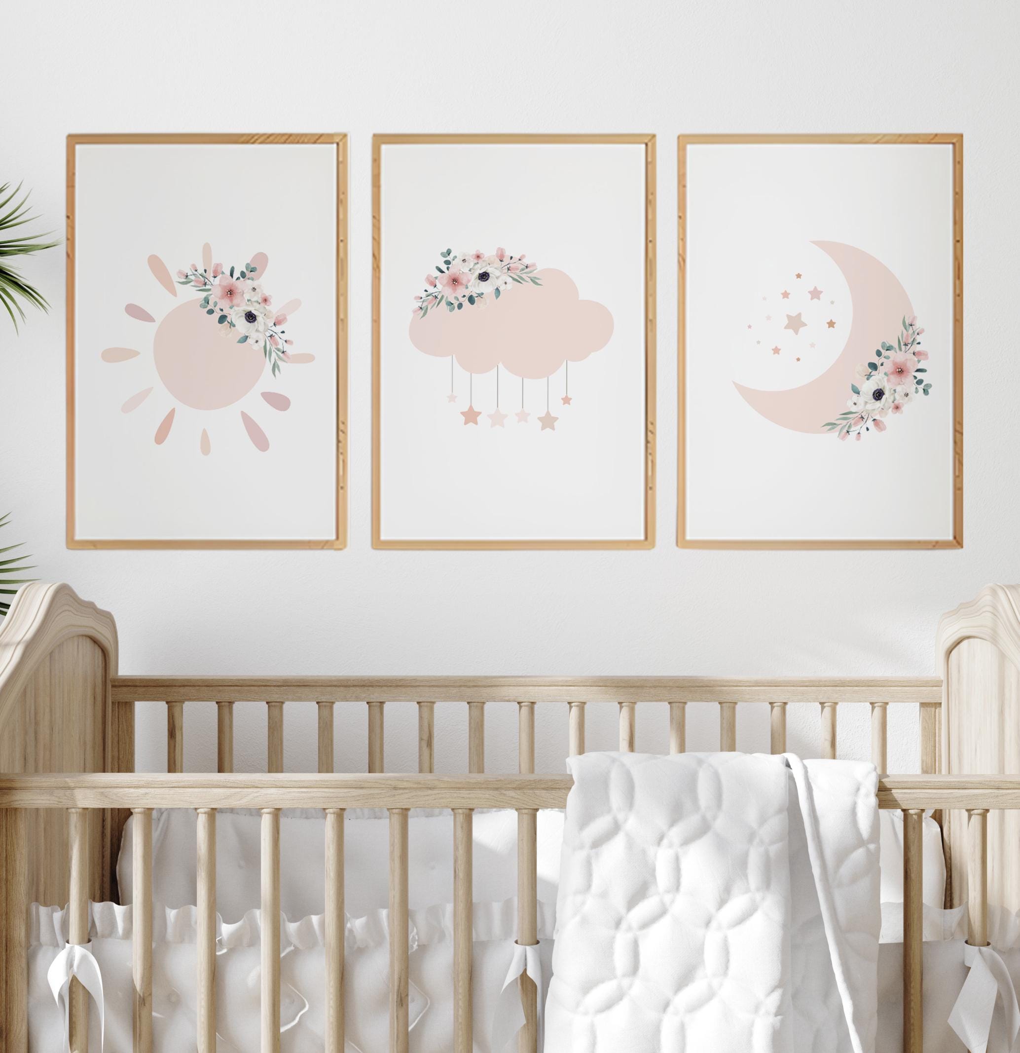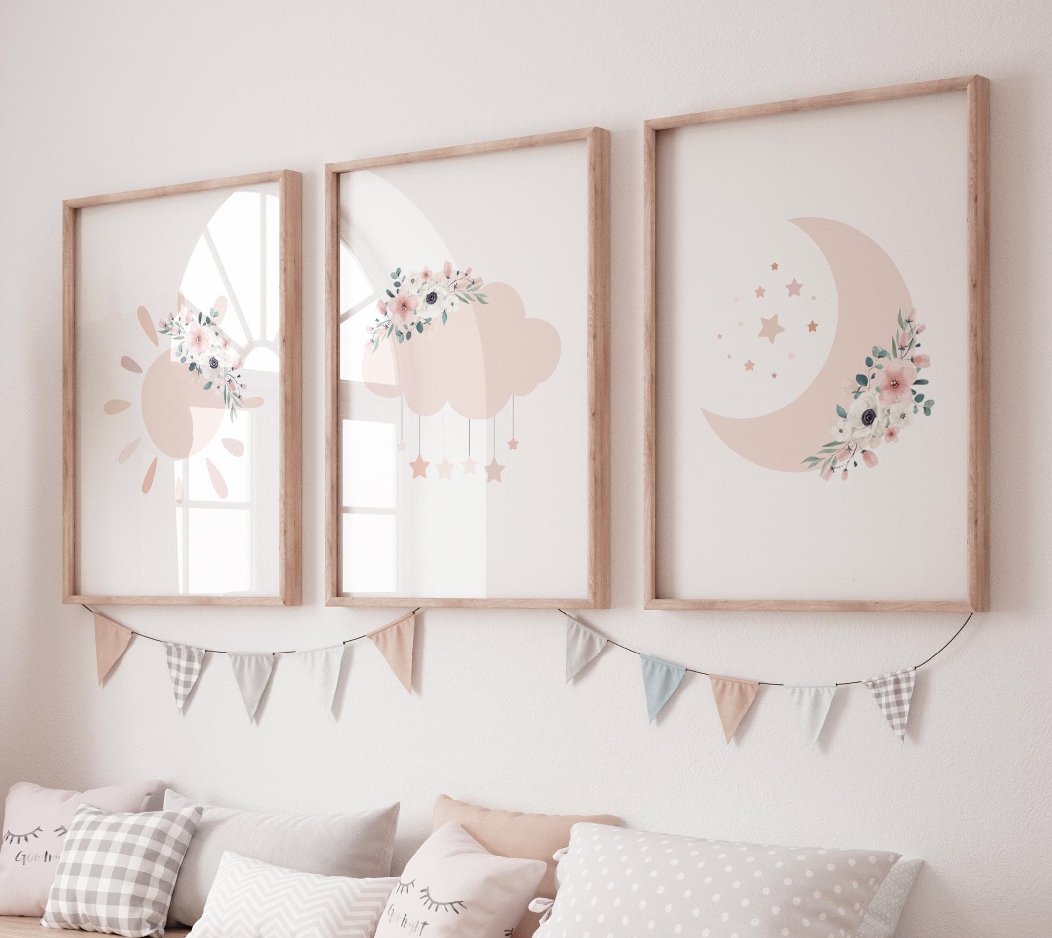 Moon nursery decor, blush pink nursery, flower nursery, nursery decor girl, star print, cloud print, girls room decor, blush nursery