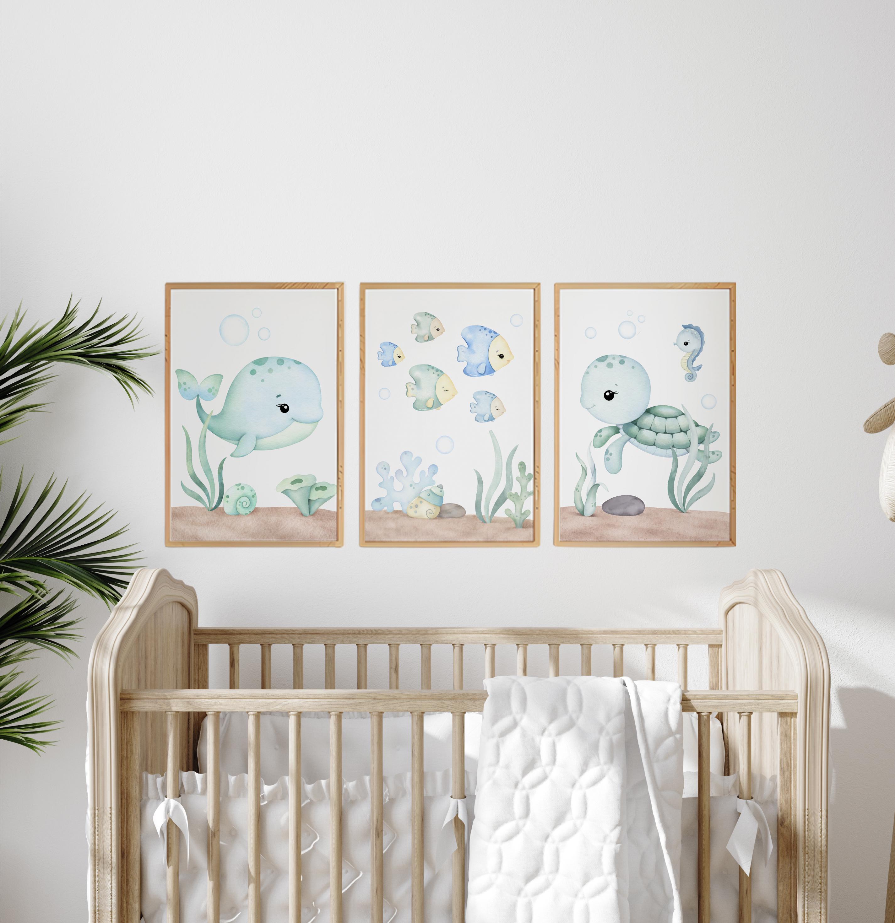 A sweet and calming ocean-themed wall art set featuring a whale, tropical fish, and a gentle sea turtle. Designed in soft blue and green tones, this set creates a peaceful underwater atmosphere perfect for a baby nursery or toddler room.