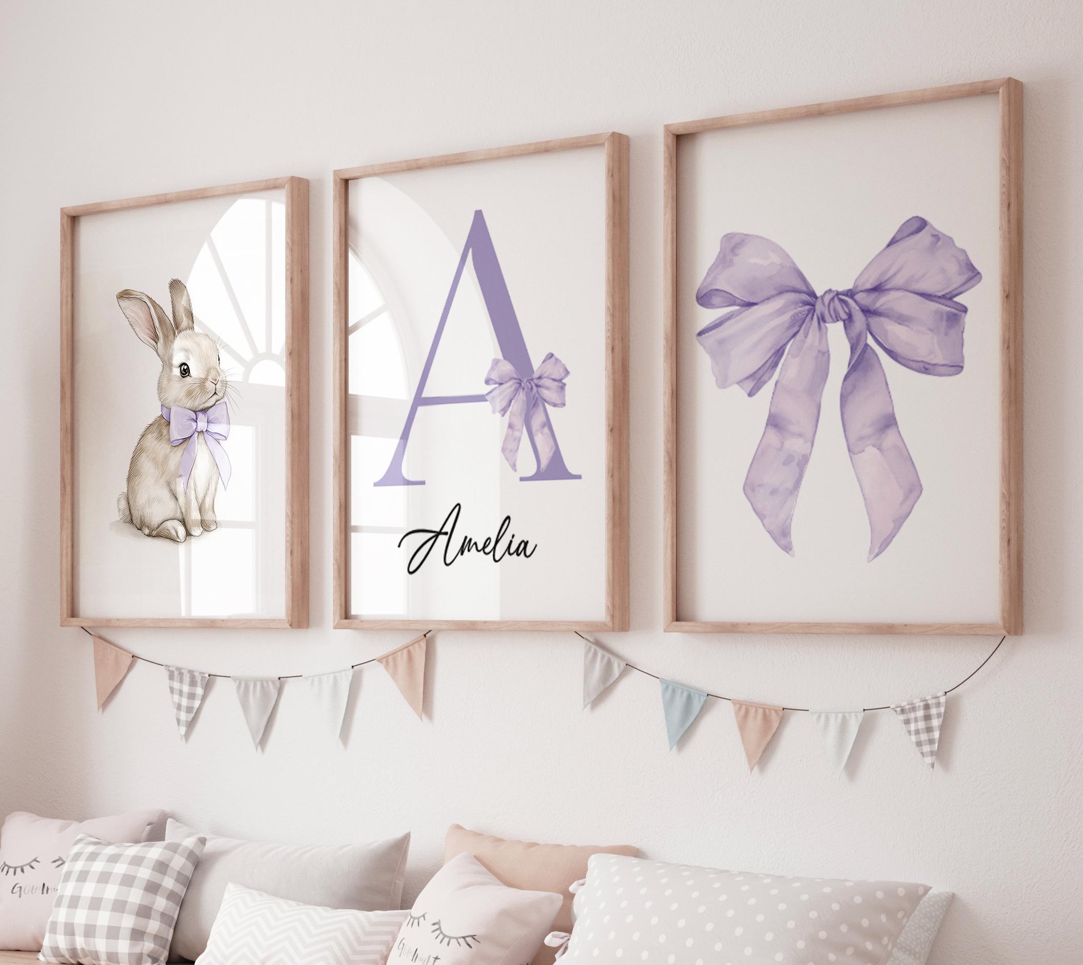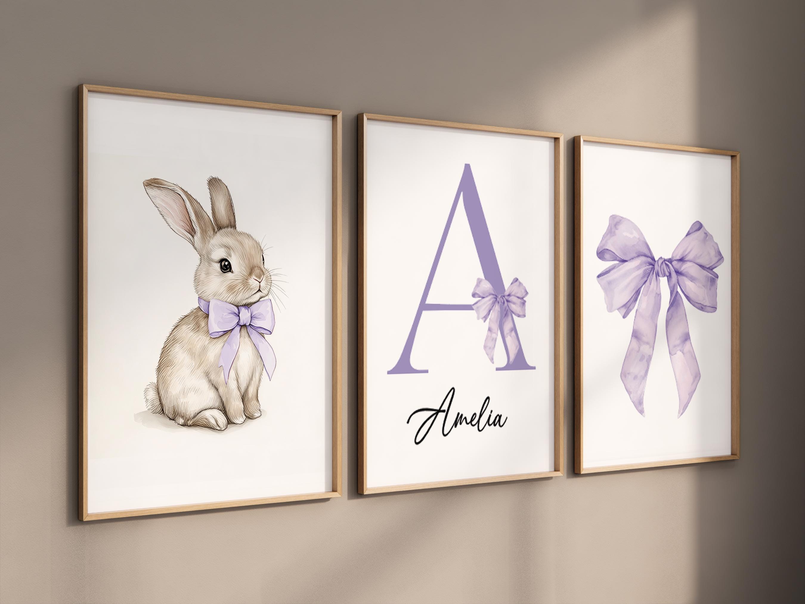 Personalized Bunny Nursery Wall Art Set of 3, Purple Bow Girl Nursery Decor, Custom Name Initial Print, Baby Girl Room Rabbit Artwork