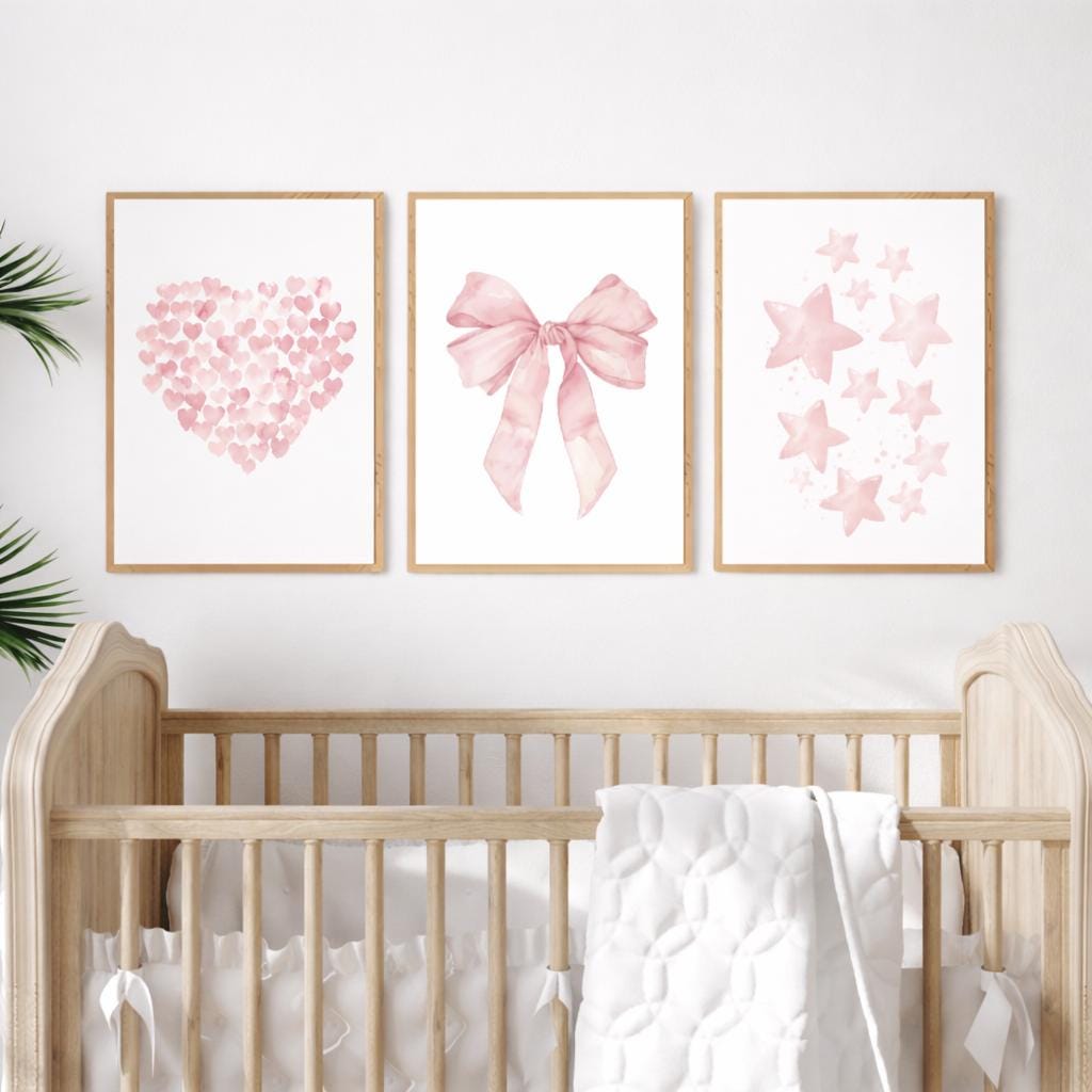 Pink Watercolor Nursery Wall Art Set of 3, Heart Bow Star Prints for Baby Girl Room, Blush Pink Nursery Decor, Feminine Kids Bedroom Wall Art