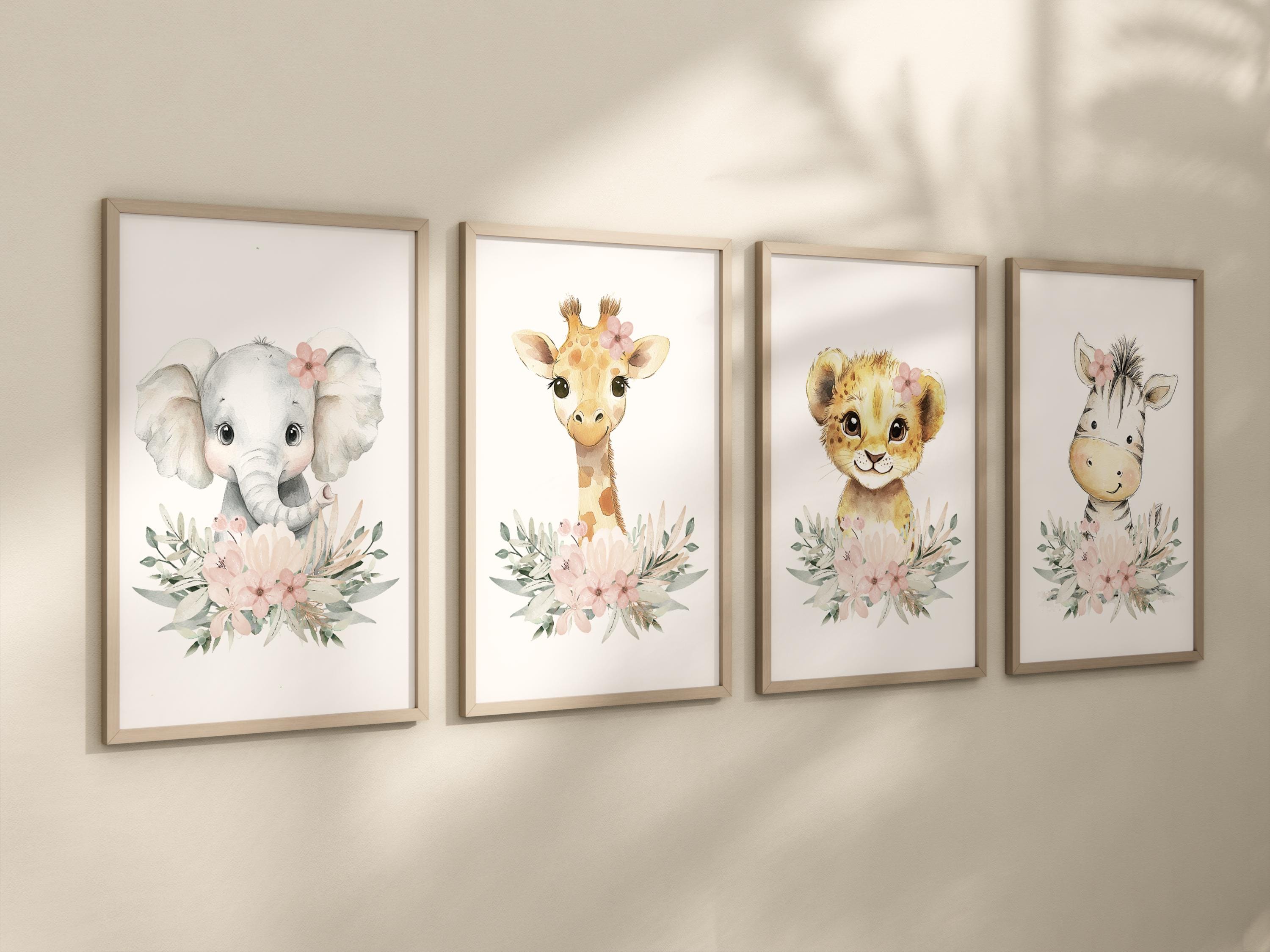 Bring sweet safari vibes to your baby girl's nursery with this adorable 3-piece wall art set. Featuring a lion cub, baby elephant, and giraffe and a zebra adorned with blush pink flowers, these watercolor prints add a soft, feminine touch to jungle-themed decor. The gentle pastel palette and floral accents make them perfect for above a crib or changing table.