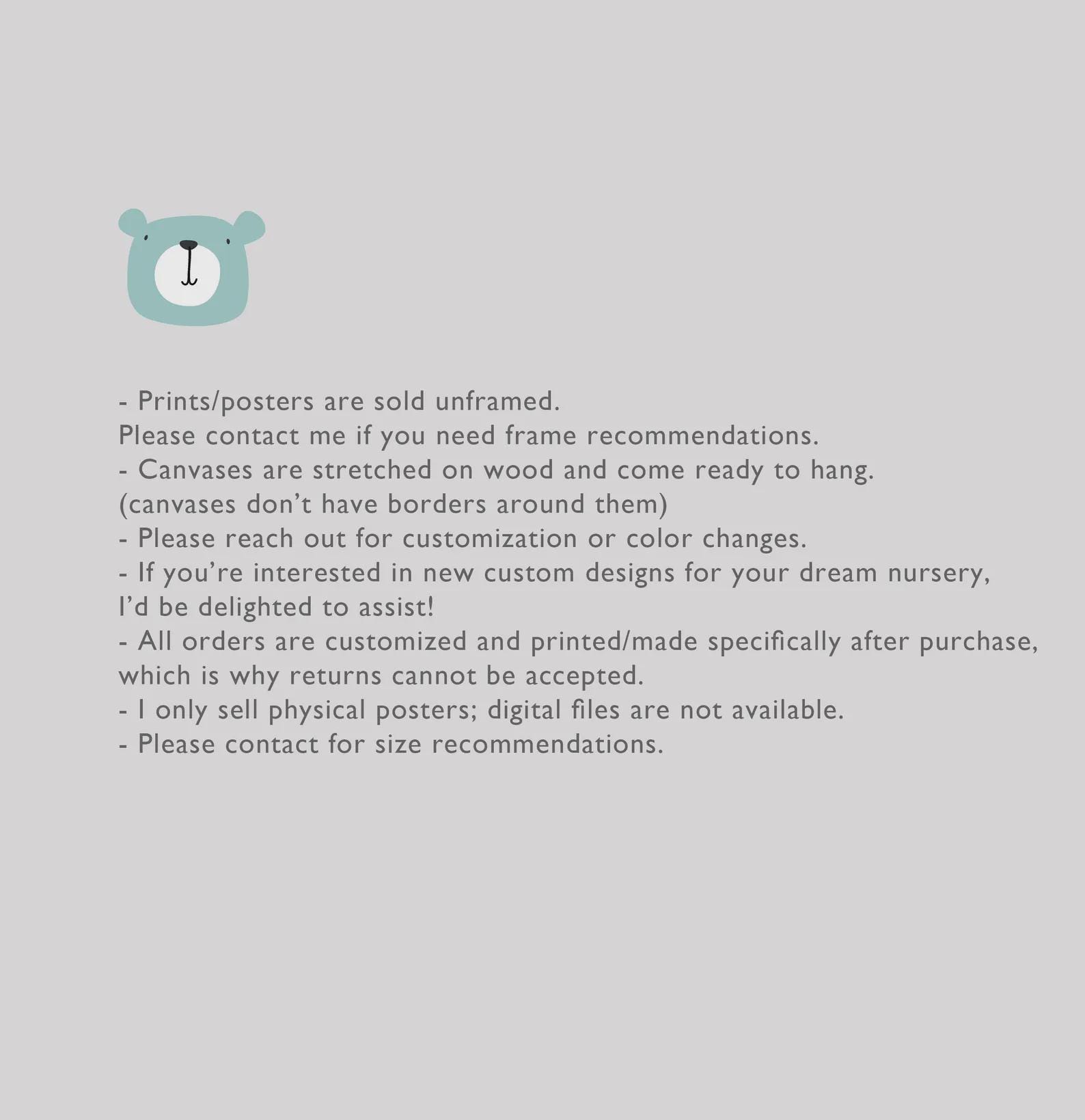 - All posters and canvases are created, resized, and printed specifically for each order, so WE DO NOT ACCEPT returns or exchanges.