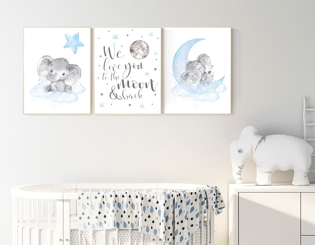 Nursery decor boy elephant, nursery wall art elephant, we love you to the moon and back, Elephant Nursery, boy nursery art, moon and stars